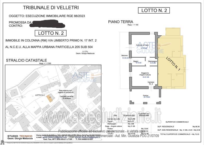 Vendita all'asta Senza incanto, con gara telematica asincrona - LOTTO 2: Piena proprietà di appartamento sito in Colonna (RM) - Via Umberto Primo n. 17 – Int. 2, piano Terra. Quota di proprietà di 1/4 pro indiviso del terreno circostante l’immobile, qualità Frutteto. Prezzo base € 95.000,00 (offerta minima € 71.250,00). Data inizio operazioni di vendita: 26/02/2026 ore 11:00. Giudice Anna Luisa Di Serafino. Professionista delegato alla vendita Avv. Valentina Carafa. Custode Giudiziario Avv. Valentina Carafa - Email "valentinacarafa@libero.it"; Tel. 0696142539. Rif. Tribunale di Velletri - Espropriazione immobiliare (cartabia) n. 88/2023
