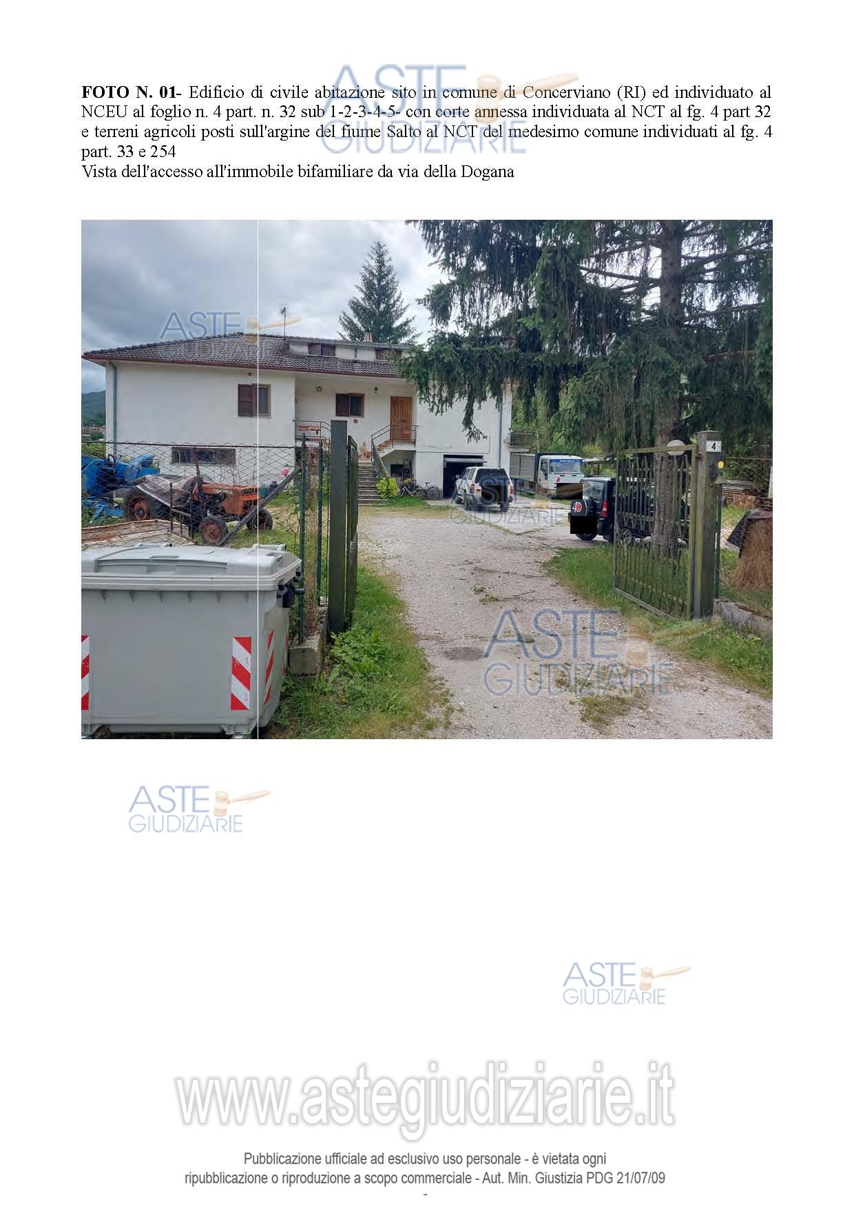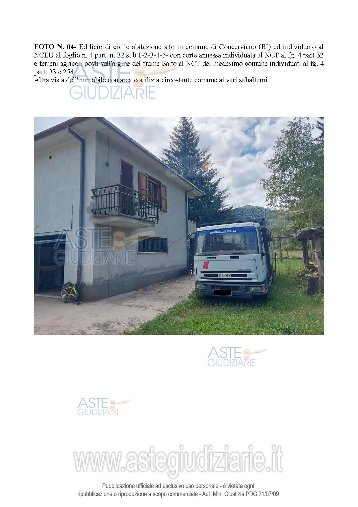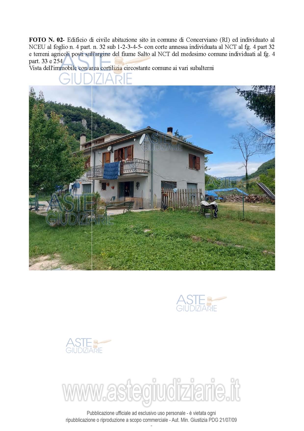 Vendita all'asta Senza incanto, con gara telematica asincrona - LOTTO 2: Piena proprietà per la quota di 100/100 di appartamento in bifamiliare distribuito tra PT-1-2, altro locale di PT destinato a magazzino e locale caldaia; due camere, cameretta e bagno al p1 con ingresso, terrazzo e disimpegno, locale al piano sottotetto; con diritti pari ad 1/2 sul terreno circostante l'immobile sulla strada di accesso all'edificio comune ad altri subalterni. Piena proprietà pari all'intero di appezzamento di terreno agricolo, incolto produttivo, classe U, posto sull'argine del fiume salto. Prezzo base € 54.736,71 (offerta minima € 41.052,54). Data inizio operazioni di vendita: 13/04/2026 ore 11:40. Giudice Dott. Roberto Colonnello. Professionista delegato alla vendita Avv. Alessia Croce - Email "avvocatoalessiacroce@gmail.com"; Cell. 3490556370. Custode Giudiziario Avv. Alessia Croce - Email "avvocatoalessiacroce@gmail.com"; Cell. 3490556370. Rif. Tribunale di Rieti - Espropriazione immobiliare (cartabia) n. 142/2023