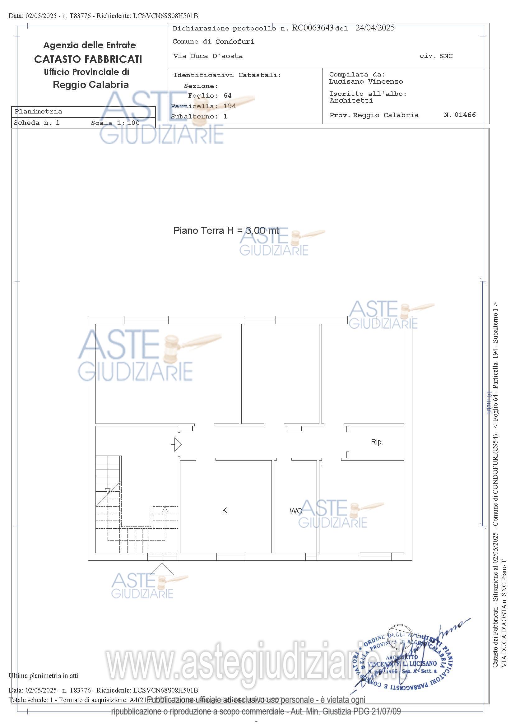 Vendita all'asta Senza incanto, con gara telematica asincrona - LOTTO UNICO: Appartamento al piano terra sito nel Comune di Condofuri (RC) alla Via DucaD’Aosta snc; superficie catastale 112mq, censito al NCEU di detto Comune al Foglio64, p,lla 194, sub 1, cat. A/3, cl 2°, vani 6, rendita € 278,89. Prezzo base € 17.112,00 (offerta minima € 12.850,00). Data inizio operazioni di vendita: 09/06/2026 ore 11:00. Giudice Dott. Francesco Maria Antonio Buggè. Professionista delegato alla vendita Avv. Giada Patanè - Email "giadapatane@yahoo.it"; Tel. 3286122618. Custode Giudiziario Avv. Giada Patanè - Email "giadapatane@yahoo.it"; Tel. 3286122618. Rif. Tribunale di Reggio di Calabria - Esecuzione immobiliare post legge 80 n. 93/2024