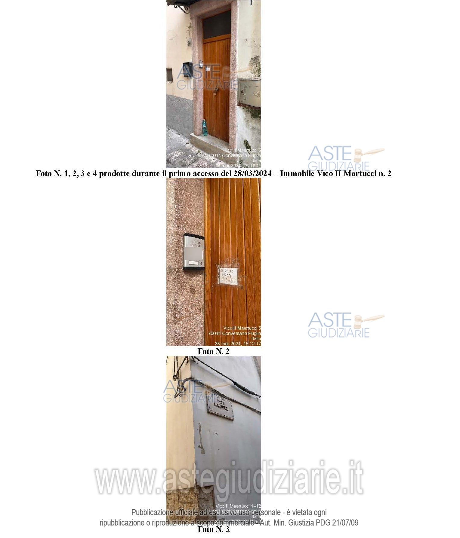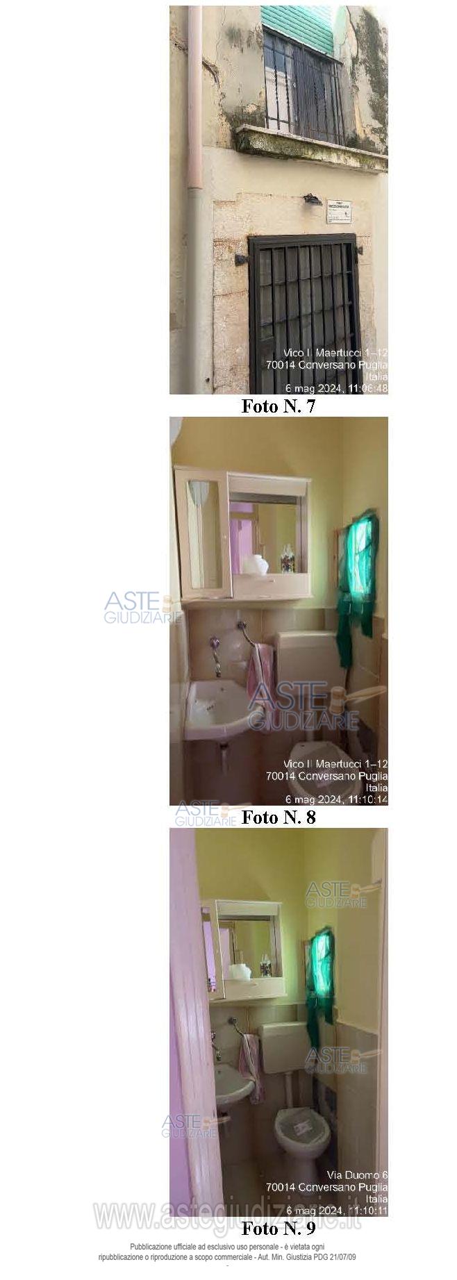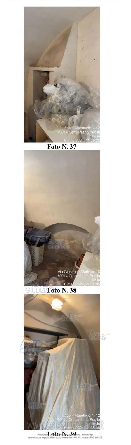 Vendita all'asta Senza incanto, con gara telematica asincrona - LOTTO 1: Piena proprietà del locale sito al piano terra nel centro storico di Conversano. Il locale è posto leggermente al di sotto del piano stradale ed è costituito da un unico ambiente con volta a botte di altezza massima interna pari a 275 cm. Utilizzato come deposito. Prezzo base € 9.244,00 (offerta minima € 6.933,00). Data inizio operazioni di vendita: 24/07/2026 ore 12:00. Giudice: Dott. Chiara Cutolo.