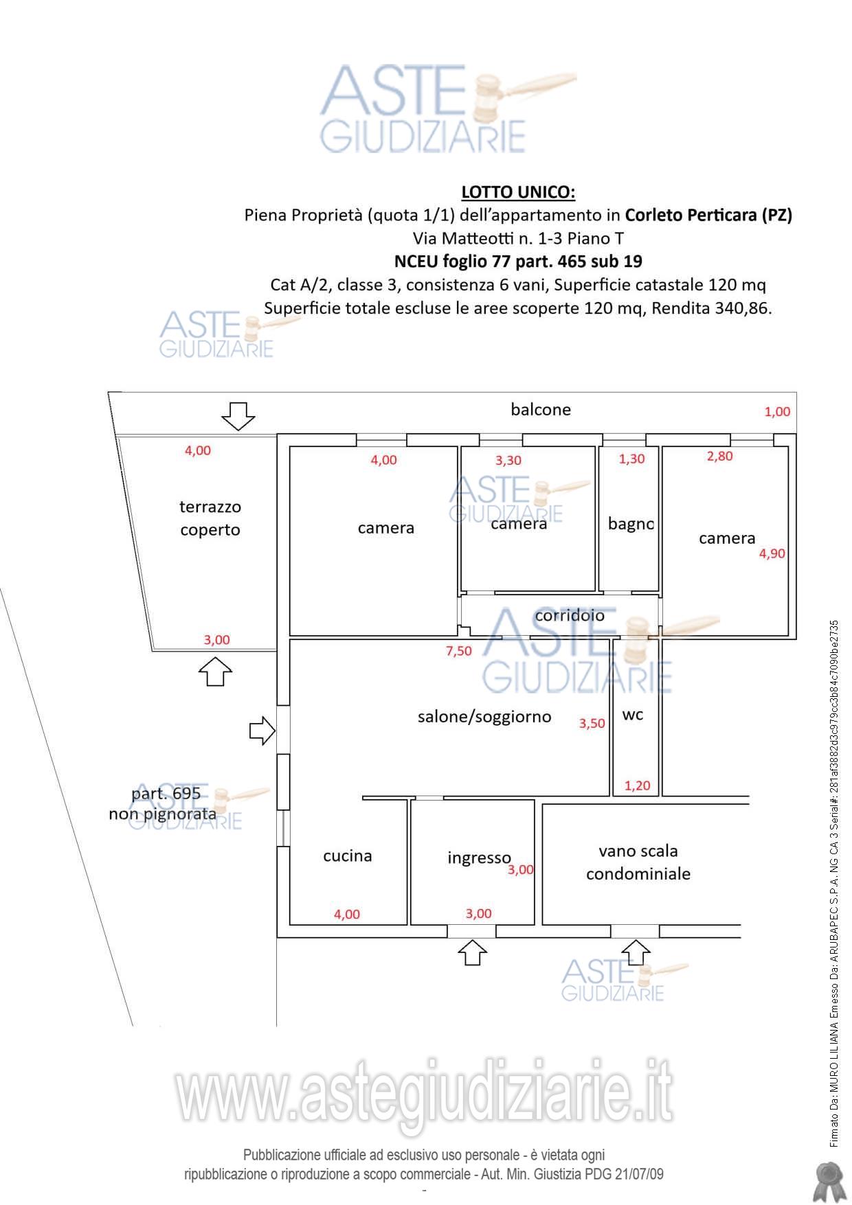 Vendita all'asta Mezzo commissionario, con gara telematica asincrona - LOTTO UNICO: Piena Proprietà quota 1/1 dell’appartamento sito nel Comune di Corleto Perticara (PZ) alla Via Matteotti n. 1-3 ubicato al Piano Terra identificato nel CEU al foglio 77 part. 465 sub 19, Cat A/2, classe 3, consistenza 6 vani, Superficie catastale 120 mq. Prezzo base € 59.407,00 (offerta minima € 44.556,00). Data inizio operazioni di vendita: 09/06/2026 ore 09:30. Professionista delegato alla vendita Avv. Monica Dea De Luca - Email "avv.monicadeadeluca@gmail.com"; Tel. 0971/287426; Cell. 338/5971550.