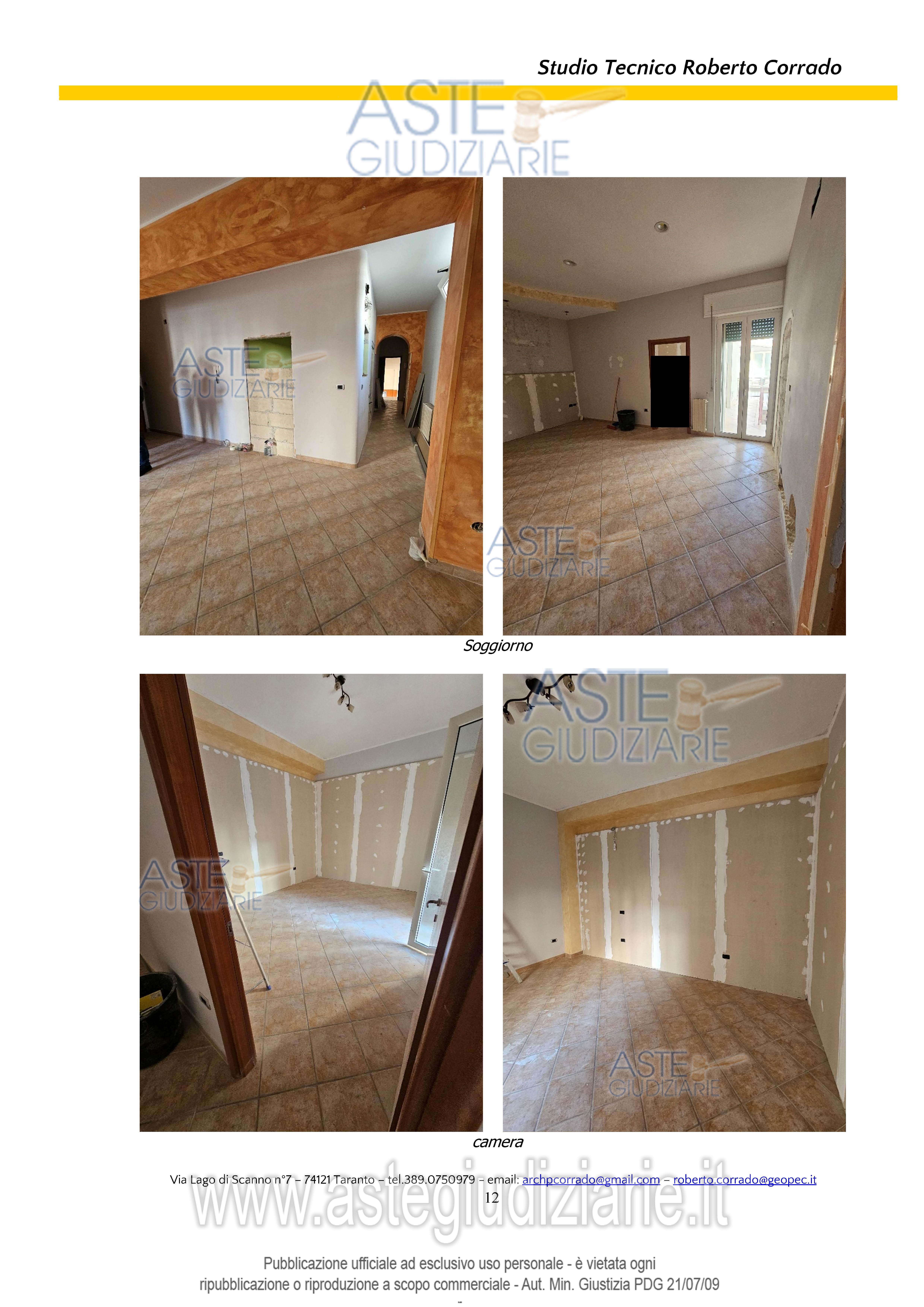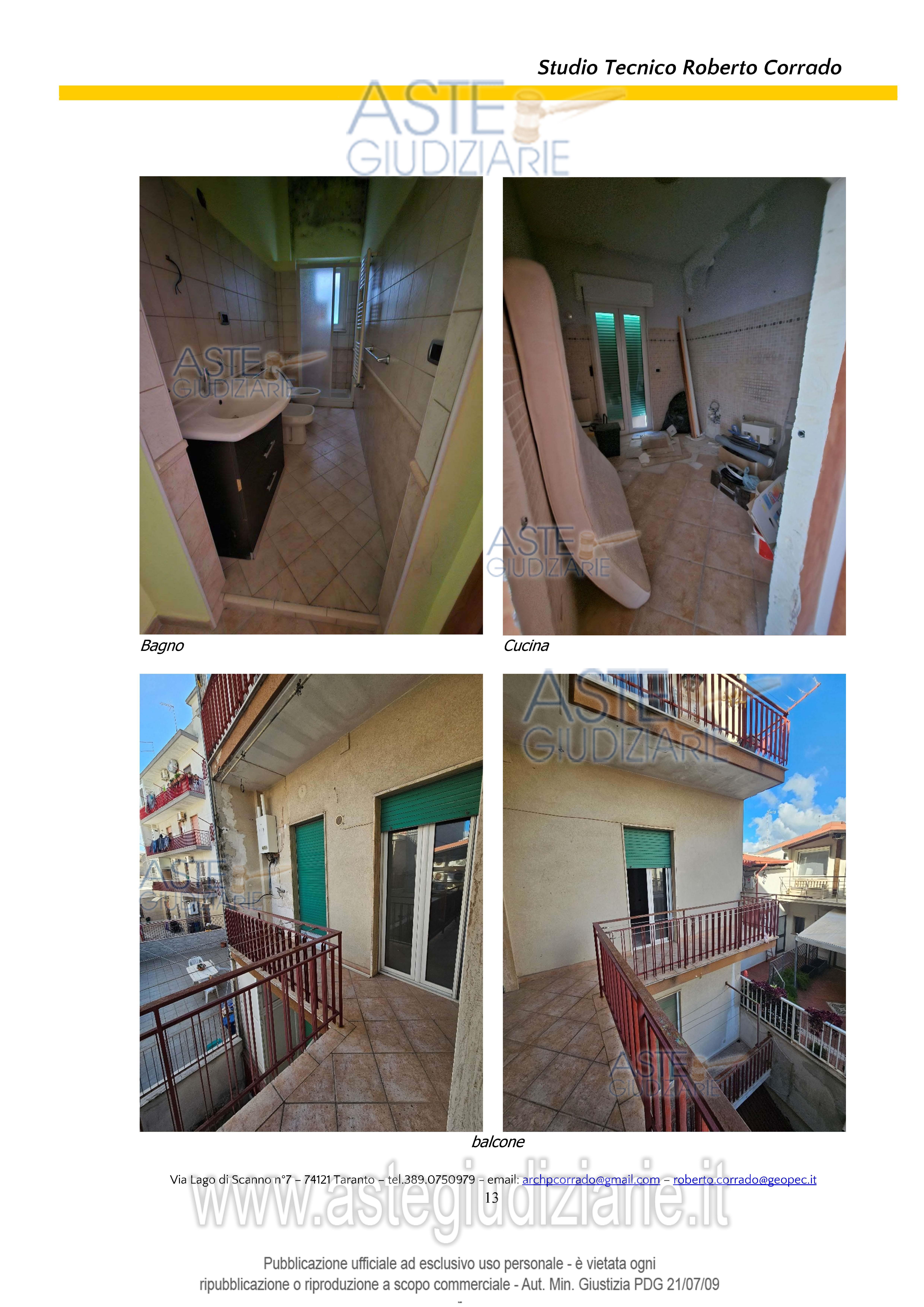 Vendita all'asta Senza incanto, con gara telematica asincrona - LOTTO UNICO: Diritto di piena proprietà dell’immobile su unico livello posto al piano primo. Prezzo base € 35.153,00 (offerta minima € 26.364,75). Data inizio operazioni di vendita: 23/06/2026 ore 16:15. Giudice Andrea Paiano. Professionista delegato alla vendita Avv. Angelo Messinese. Custode Giudiziario Avv. Angelo Messinese - Email "avv.angelomessinese@gmail.com"; Cell. 3294842294. Rif. Tribunale di Taranto - Espropriazione immobiliare (cartabia) n. 211/2025
