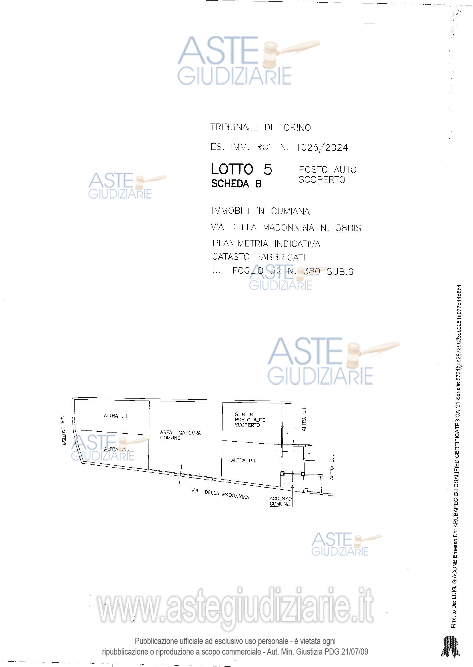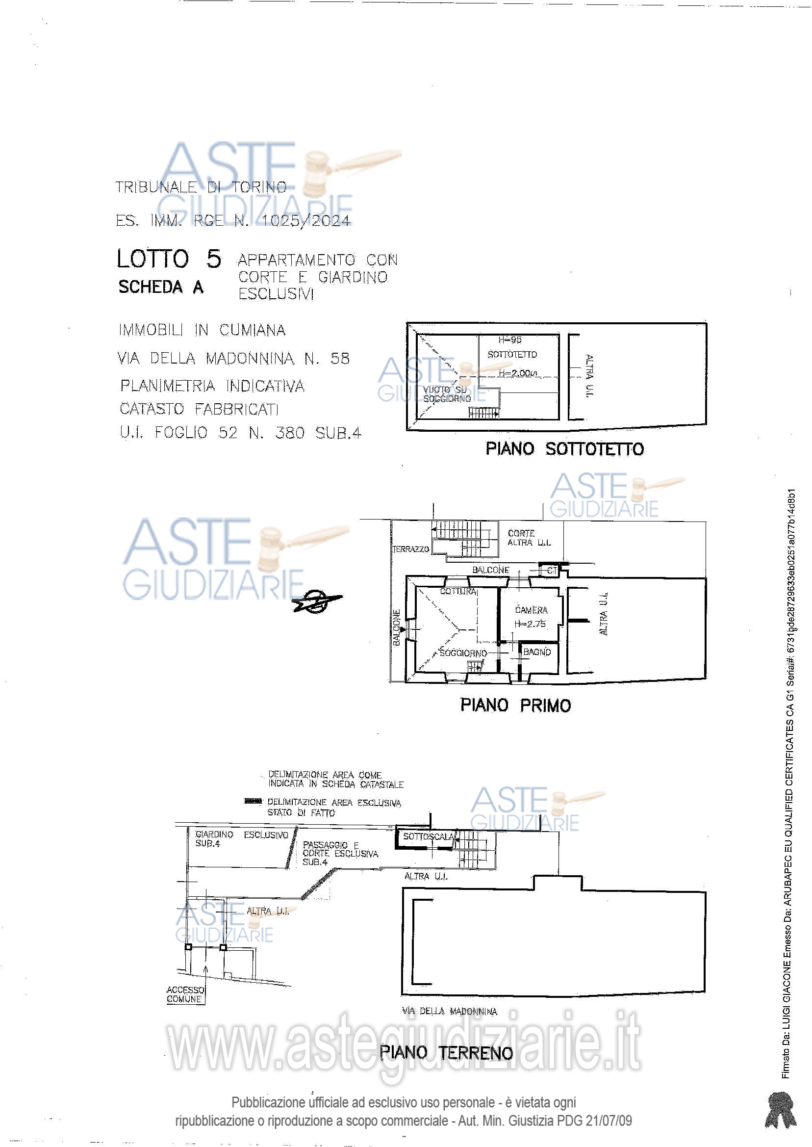 Vendita all'asta Senza incanto, con gara telematica asincrona - LOTTO 5: All'interno di fabbricato libero da tre lati,due piani f.t. oltre a sottotetto e cantina al piano interr.,con aree esterne in parte a giardino ed in parte a cortile/passaggio e posti auto: alloggio al piano 1 con accesso tramite scala esterna esclusiva,composto da soggiorno con tetto in vista con soppalco non abitabile(ex locale sottotetto),angolo cottura,disimpegno,bagno,camera e ampio balcone con piccolo terrazzino d'angolo, più proprietà esclusiva di area esterna al piano terreno oltre posto auto. Prezzo base € 70.000,00 (offerta minima € 52.500,00). Data inizio operazioni di vendita: 10/02/2026 ore 09:30. Giudice Anna Castellino. Professionista delegato alla vendita Not. Paolo Demaria. Custode Giudiziario Lorenzo Vigone - Email "richieste.visite@ivgpiemonte.it"; Tel. 011482822. Rif. Tribunale di Torino - Espropriazione immobiliare (cartabia) n. 1025/2024
