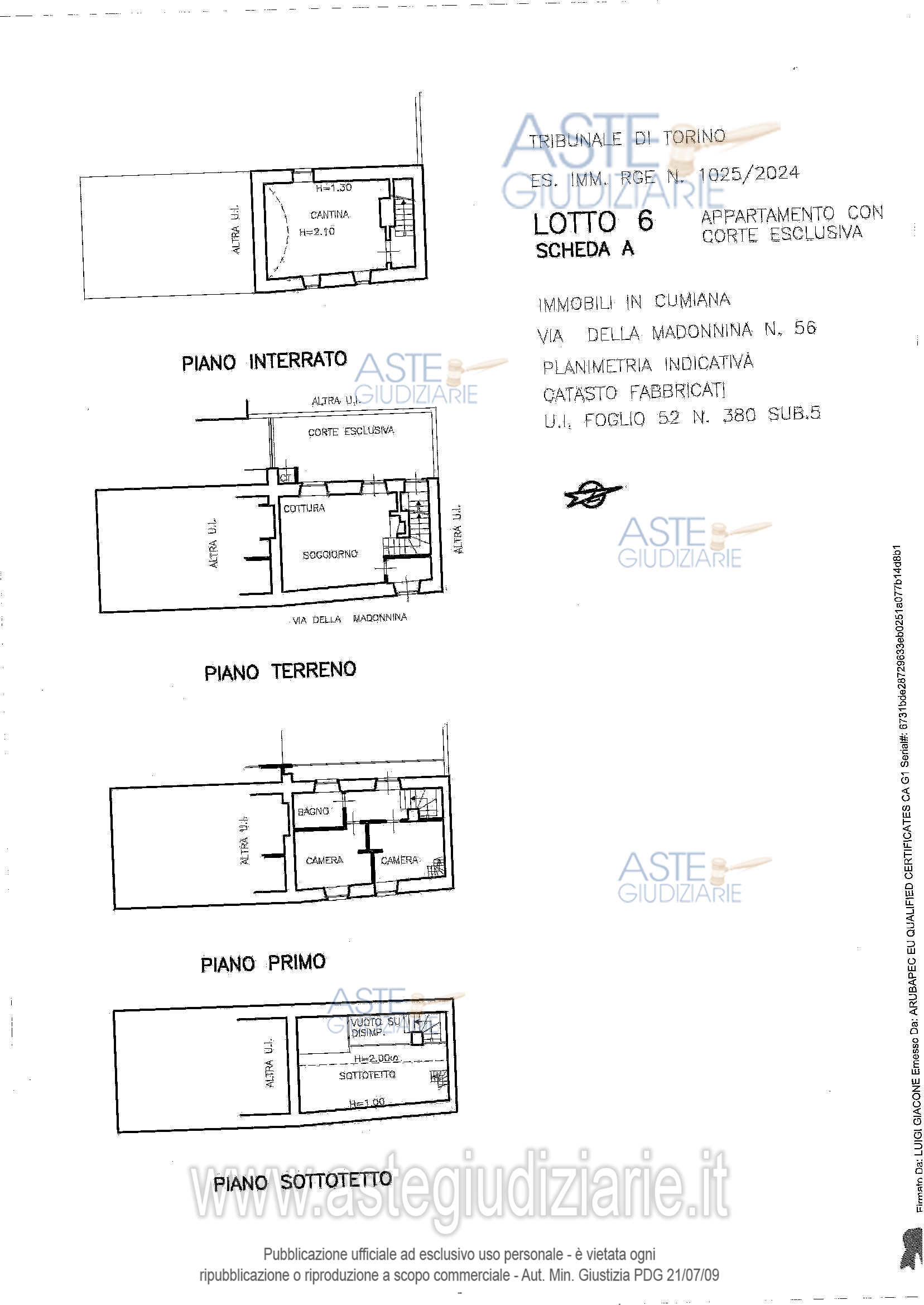 Vendita all'asta Senza incanto, con gara telematica asincrona - LOTTO 6: in Frazione Concentrico,all'interno di fabbricato libero da tre lati, 2 piani f.t,sottotetto e cantina al piano interr,aree esterne in parte a giardino,in parte a cortile/passaggio e posti auto:alloggio su 2 piani collegati da scala interna composto da soggiorno con angolo cottura al piano terr.,2 camere,bagno e balcone al piano 1.Scala fissa al piano sottotetto/soppalco(ex solaio),proprietà esclusiva di area esterna piano terr.Cantina piano interr. con accesso da scala dal cortile esclusivo e 2 posti auto. Prezzo base € 100.000,00 (offerta minima € 75.000,00). Data inizio operazioni di vendita: 12/05/2026 ore 15:00. Giudice Anna Castellino. Professionista delegato alla vendita Not. Paolo Demaria. Custode Giudiziario Lorenzo Vigone - Email "richieste.visite@ivgpiemonte.it"; Tel. 011482822. Rif. Tribunale di Torino - Espropriazione immobiliare (cartabia) n. 1025/2024