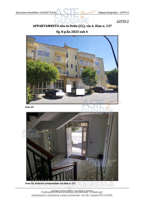 Vendita all'asta Senza incanto, con gara telematica sincrona mista - LOTTO 3: Piena proprietà di appartamento ubicato a Delia (CL) - via Armando Diaz n. 137, piano 1 APPARTAMENTO per civile abitazione con superficie commerciale di mq 165 ca. sito in Delia (CL) nella via Armando Diaz n.ri 137. Identificato al NCEU del Comune di Delia al Fg. 8, p.lla 2825, sub 4, piano 1, categ. A/2, cl. 2, Consistenza 6,5 vani, sup. catastale mq 161. Prezzo base € 56.557,50 (offerta minima € 42.418,12). Data vendita 28/05/2026 ore 12:00. Giudice Dott. Francesco Lauricella. Professionista delegato alla vendita Avv. Pierluigi Zoda. Custode Giudiziario Avv. Pierluigi Zoda - Email "studiolegalezoda@tin.it". Rif. Tribunale di Caltanissetta - Esecuzione immobiliare post legge 80 n. 153/2017