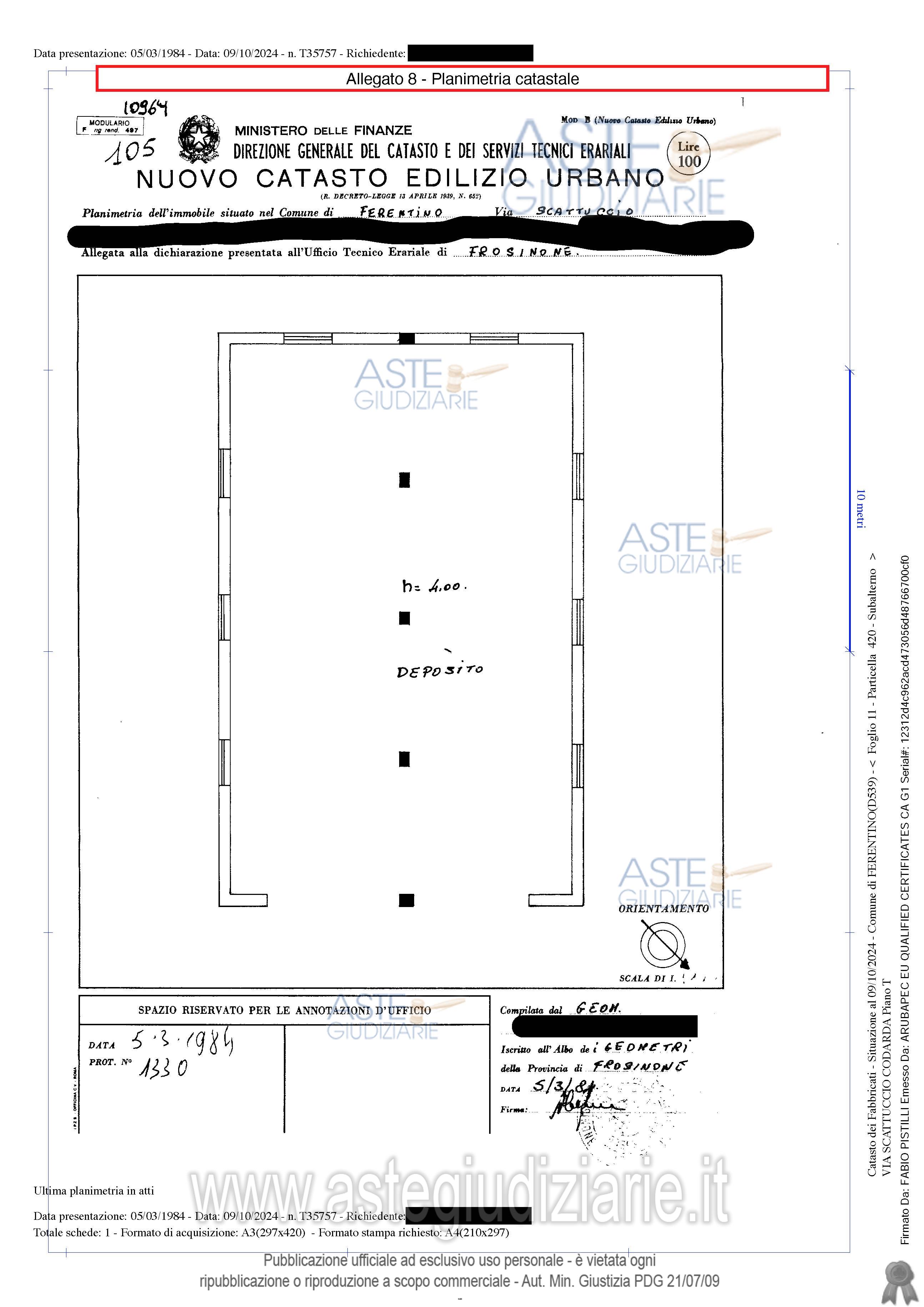 Vendita all'asta Senza incanto, con gara telematica asincrona - LOTTO 1: Bene N° 1 – Piena Proprietà (1/1) Deposito ubicato a Ferentino (FR) - Via Scattuccio Codarda s.n.c. Il fabbricato consiste in un locale deposito edificato su un unico livello. Prezzo base € 52.173,00 (offerta minima € 39.129,75). Data inizio operazioni di vendita: 29/01/2026 ore 16:30. Giudice Giampaolo Piro. Professionista delegato alla vendita Avv. Antonio Mosetti - Email "mosettistudiolegale@gmail.com"; Tel. 0775212174. Custode Giudiziario Avv. Antonio Mosetti - Email "mosettistudiolegale@gmail.com"; Tel. 0775212174. Rif. Tribunale di Frosinone - Espropriazione immobiliare (cartabia) n. 146/2024