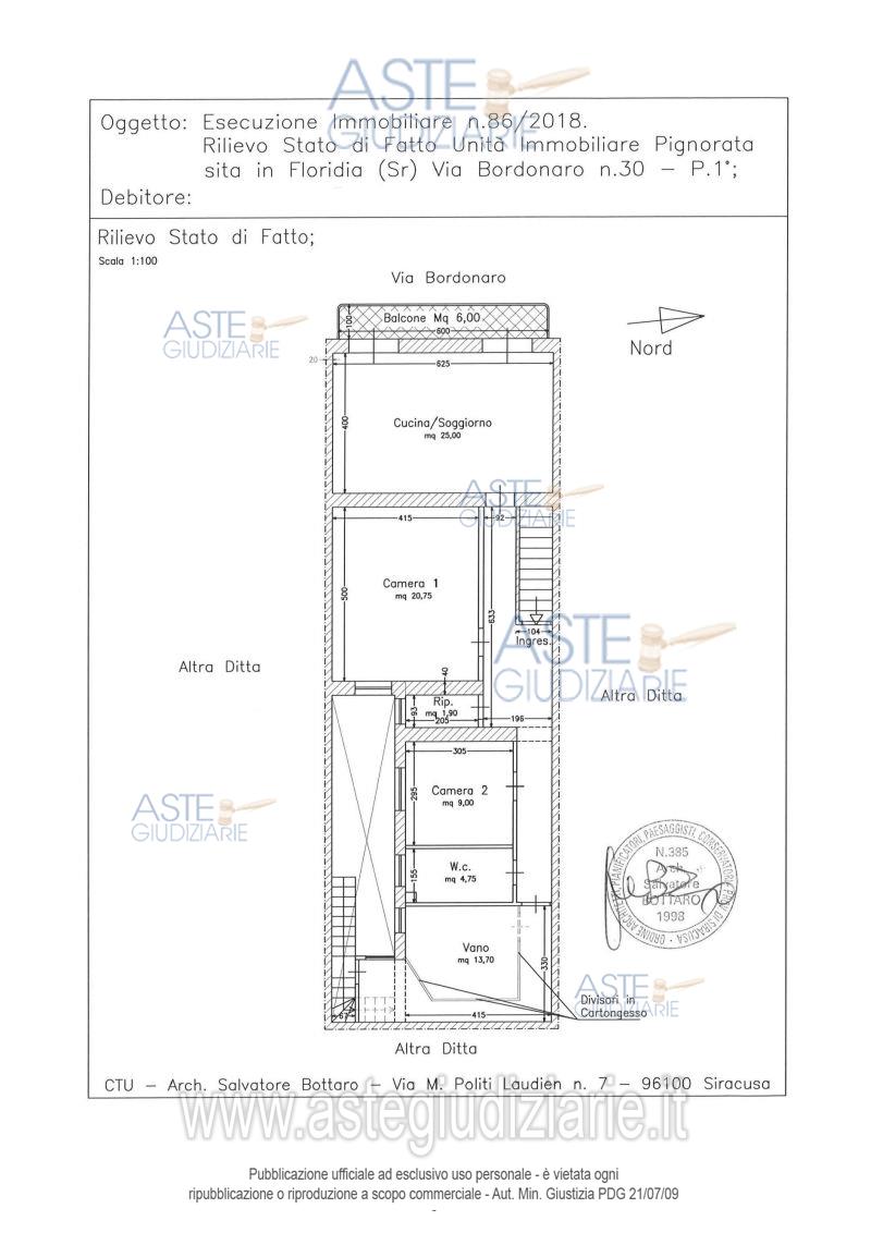 Vendita all'asta Senza incanto, con gara telematica sincrona mista - LOTTO UNICO: Intera piena proprietà appartamento in Floridia Via Bordonaro n. 30 posto al piano 1° di unità edilizia elevata due piani fuori terra, composto da 3 vani ed accessori; in NCEU al fg. 19 p.lla 266 sub. 2, cat. A/3, classe 3°, consistenza 5,5 vani catastali, superficie mq.105, totale escluse aree scoperte mq. 103, R.C. €. 278,37; confinante con Via Bordonaro e - per due lati - con proprietà di terzi. Prezzo base € 17.859,38 (offerta minima € 13.394,53). Data vendita 14/05/2026 ore 13:00. Giudice Giuseppe Solarino. Professionista delegato alla vendita Avv. Vittoria Fiume - Email "vittoriafiume@ymail.com"; Tel. 0931417827. Custode Giudiziario Avv. Vittoria Fiume - Email "vittoriafiume@ymail.com"; Tel. 0931417827. Rif. Tribunale di Siracusa - Esecuzione immobiliare post legge 80 n. 86/2018