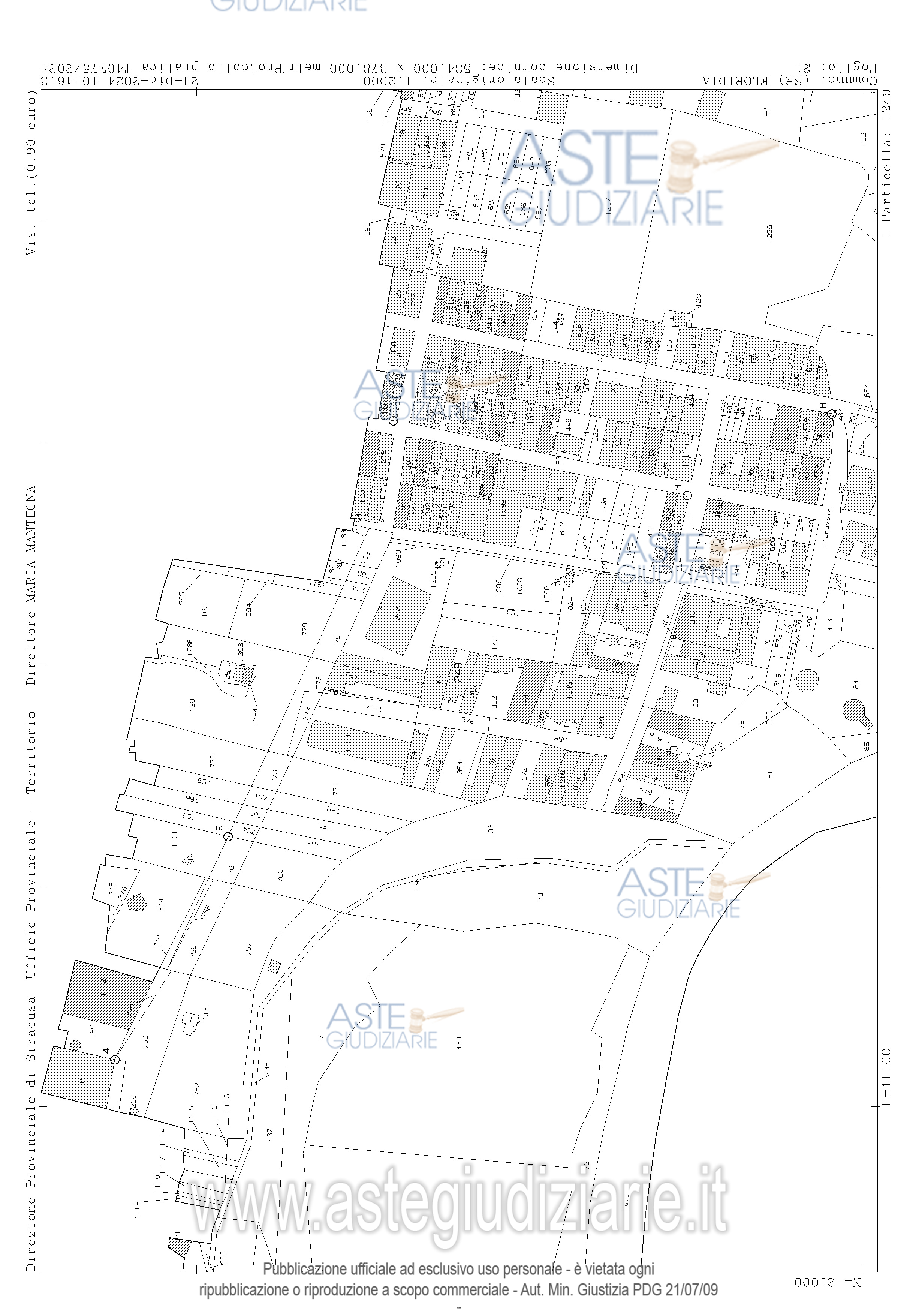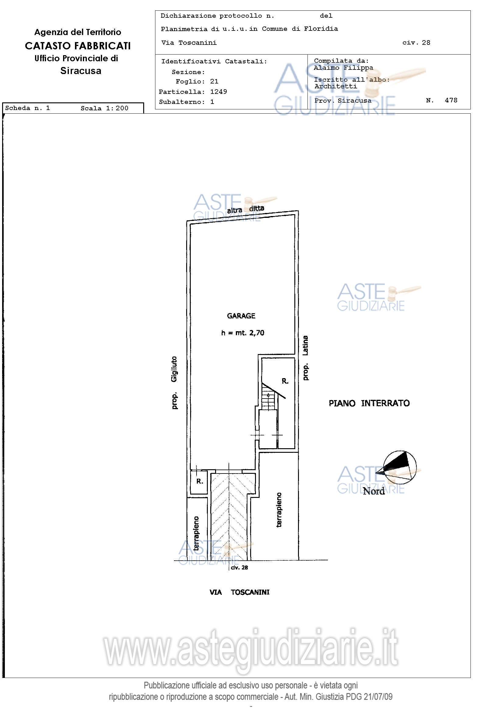 Vendita all'asta Senza incanto, con gara telematica sincrona mista - LOTTO UNICO: Piena proprietà del fabbricato per civile abitazione costituito da 3e livelli sito in Floridia (Sr) via Arturo Toscanini n. 26-28 composto da piano seminterrato adibito a garage, piano rialzato e primo piano adibiti a civile abitazione, oltre sottotetto non abitabile. In N.C.E.U.del Comune di Floridia al foglio 21 part.1249 sub 1, p.S1, cat. c/6 , cl.2, mq 155, rend.€.352,22 (garage) ed foglio 21 part. 1249 sub 2, p.t-1, cat. A/2, cl.3, vani, 9,5, rend.€.735,95 ( appartamento). Prezzo base € 256.620,00 (offerta minima € 192.465,00). Data vendita 21/04/2026 ore 12:00. Giudice Giuseppe Solarino. Professionista delegato alla vendita Avv. Sabrina Giuliano - Email "avv.sabrinagiuliano@gmail.com"; Tel. 0931412001. Custode Giudiziario Avv. Sabrina Giuliano. Rif. Tribunale di Siracusa - Espropriazione immobiliare (cartabia) n. 405/2024