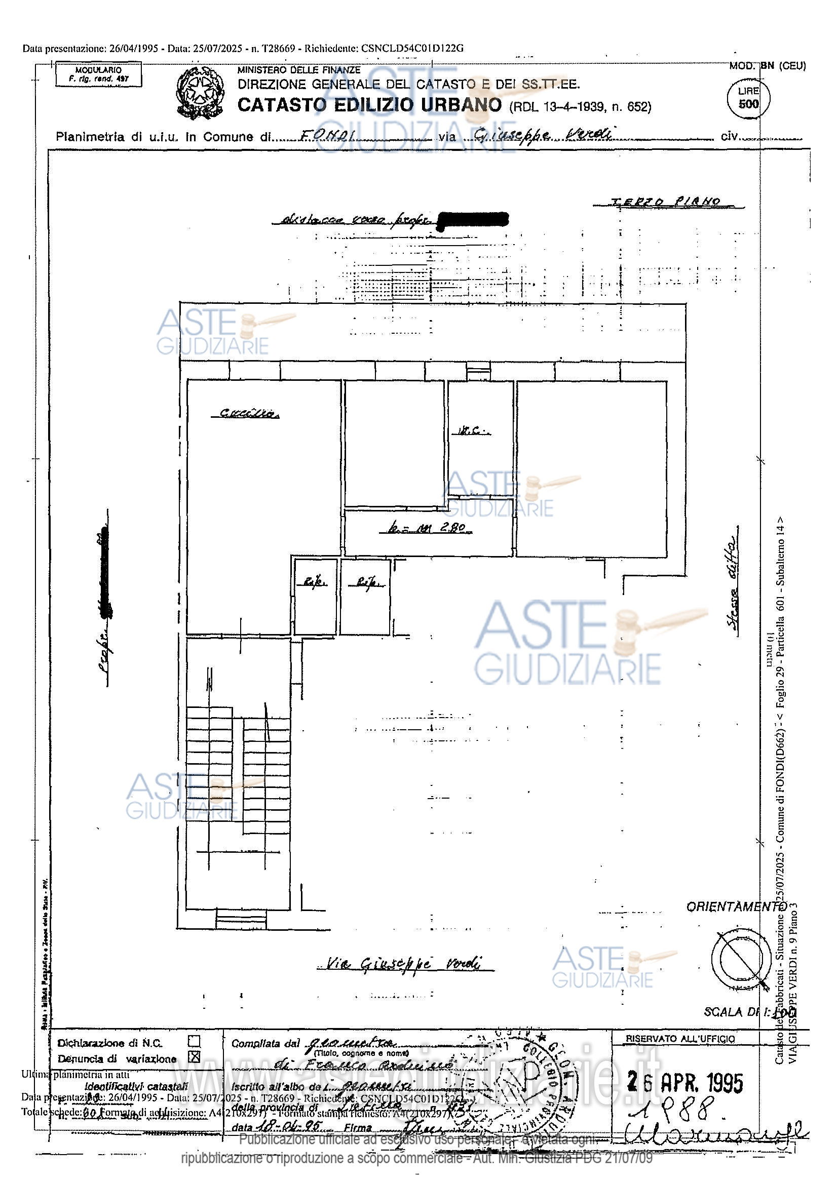 Vendita all'asta Senza incanto, con gara telematica asincrona - LOTTO UNICO: Appartamento ubicato a Fondi (LT) - VIA GIUSEPPE VERDI 9, piano 3. Il bene oggetto di descrizione è ubicato in un contesto urbano consolidato a prevalente destinazione residenziale, con presenza di edifici pluripiano realizzati secondo le tipologie edilizie tipiche del tessuto cittadino. Prezzo base € 99.016,00 (offerta minima € 74.262,00). Data inizio operazioni di vendita: 07/07/2026 ore 12:00. Professionista delegato alla vendita: Dott. Pasqualino Simonelli - Email "pasqualinosimonelli@alice.it".