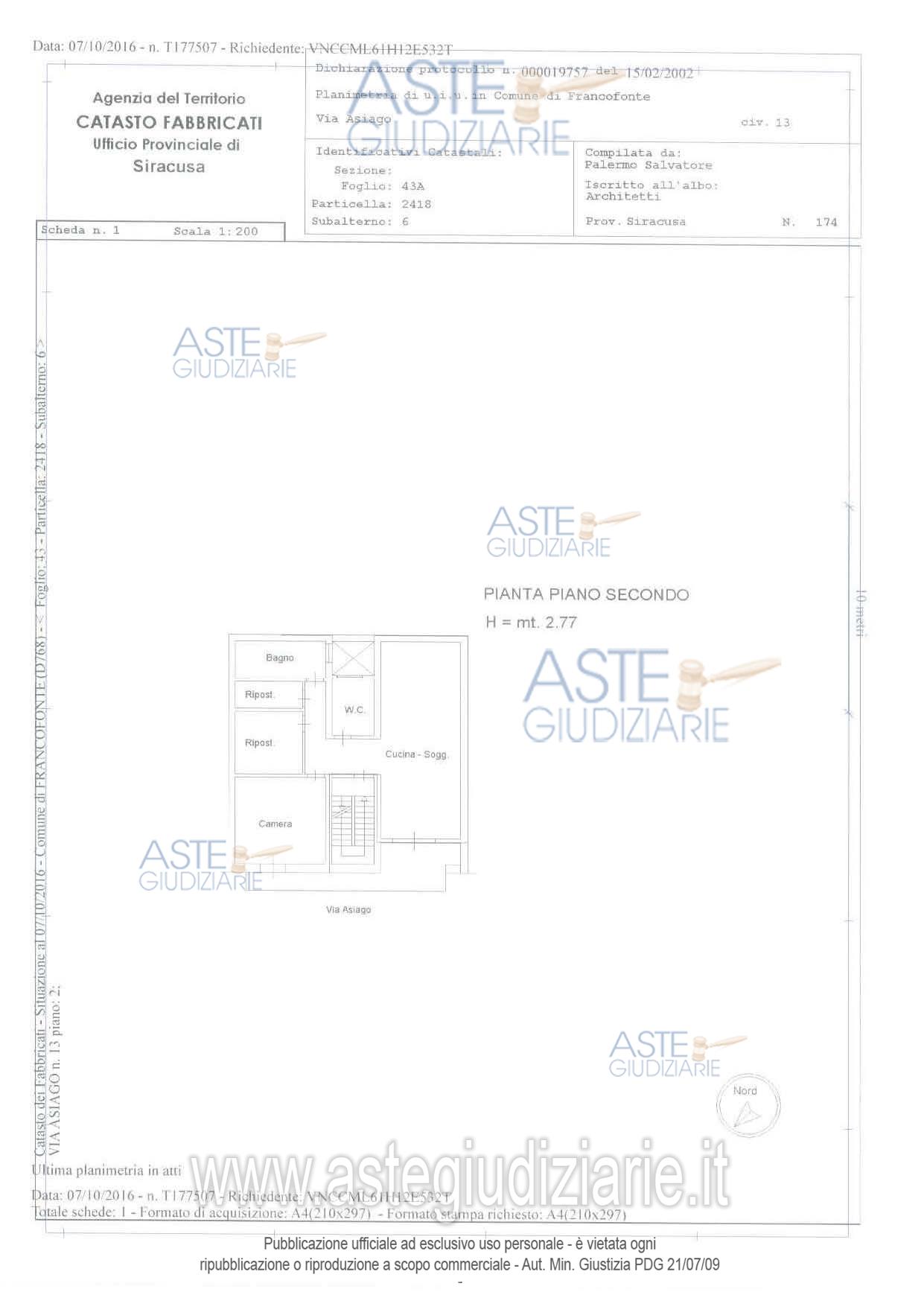 Vendita all'asta Senza incanto, con gara telematica sincrona mista - LOTTO UNICO: Appartamento per civile composto da tre vani ed accessori, ubicato al secondo piano, confinante con detta via Asiago, con altre Ditte, salvo altri, distinto al NCEU del Comune di Francofonte al Fg. 43, p.lla 2418, subalterno 6, Via Asiago n. 13, piano 2°, cat. A/3, classe 3, vani 4, rendita €. 330,53” Classe Energetica “F”. Prezzo base € 22.718,48 (offerta minima € 17.038,86). Data vendita 09/10/2025 ore 12:00. Giudice Dott. Concita Cultrera. Professionista delegato alla vendita Avv. Sergio Spinoso - Email "info@studiolegalespinoso.it"; Cell. 3715716444; Tel. 0931754382. Custode Giudiziario Avv. Sergio Spinoso - Email "info@studiolegalespinoso.it"; Cell. 3715716444; Tel. 0931754382. Rif. Tribunale di Siracusa - Esecuzione immobiliare post legge 80 n. 177/2016