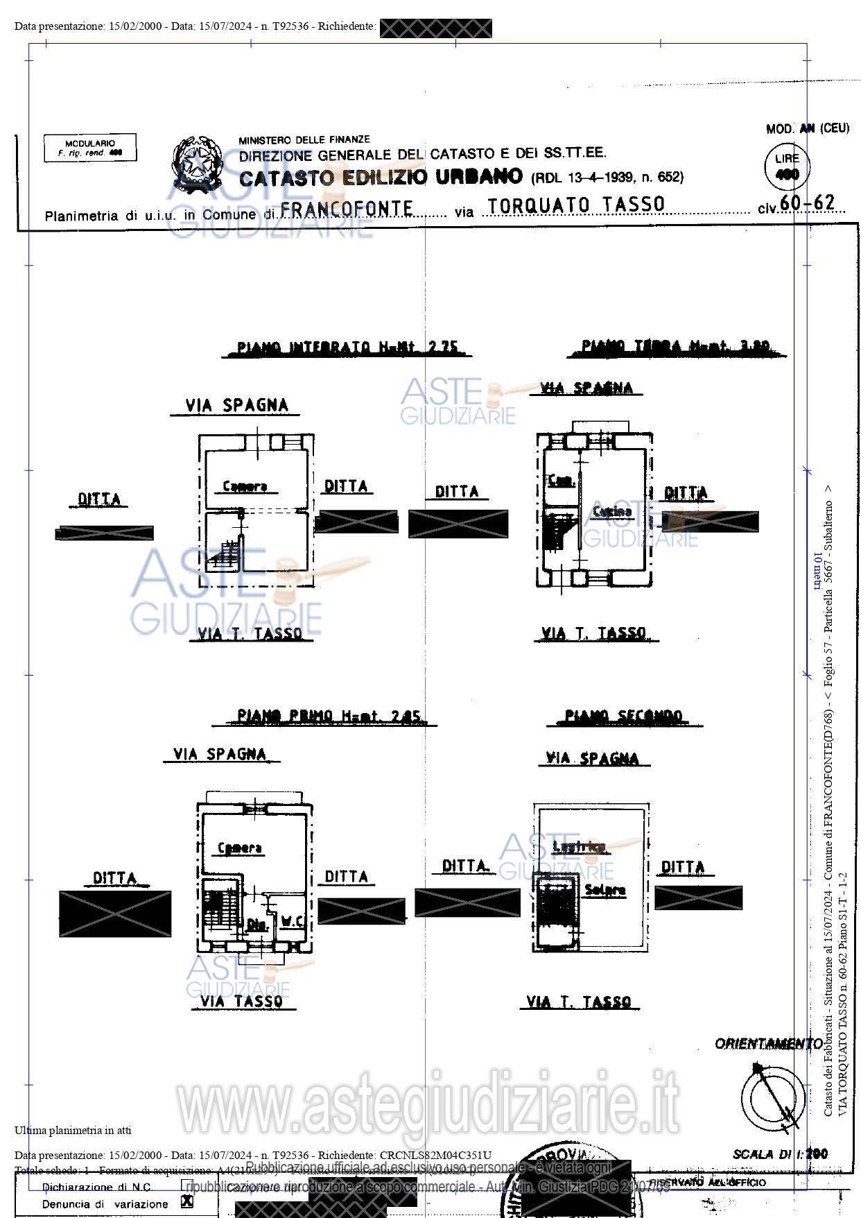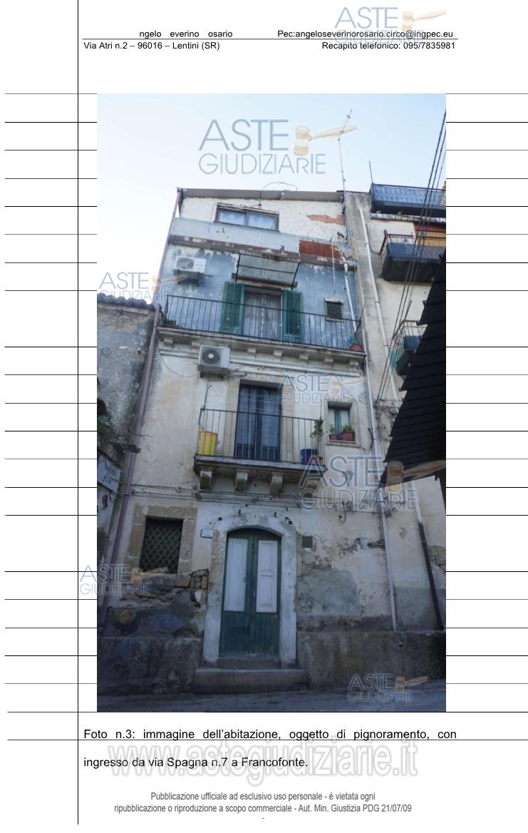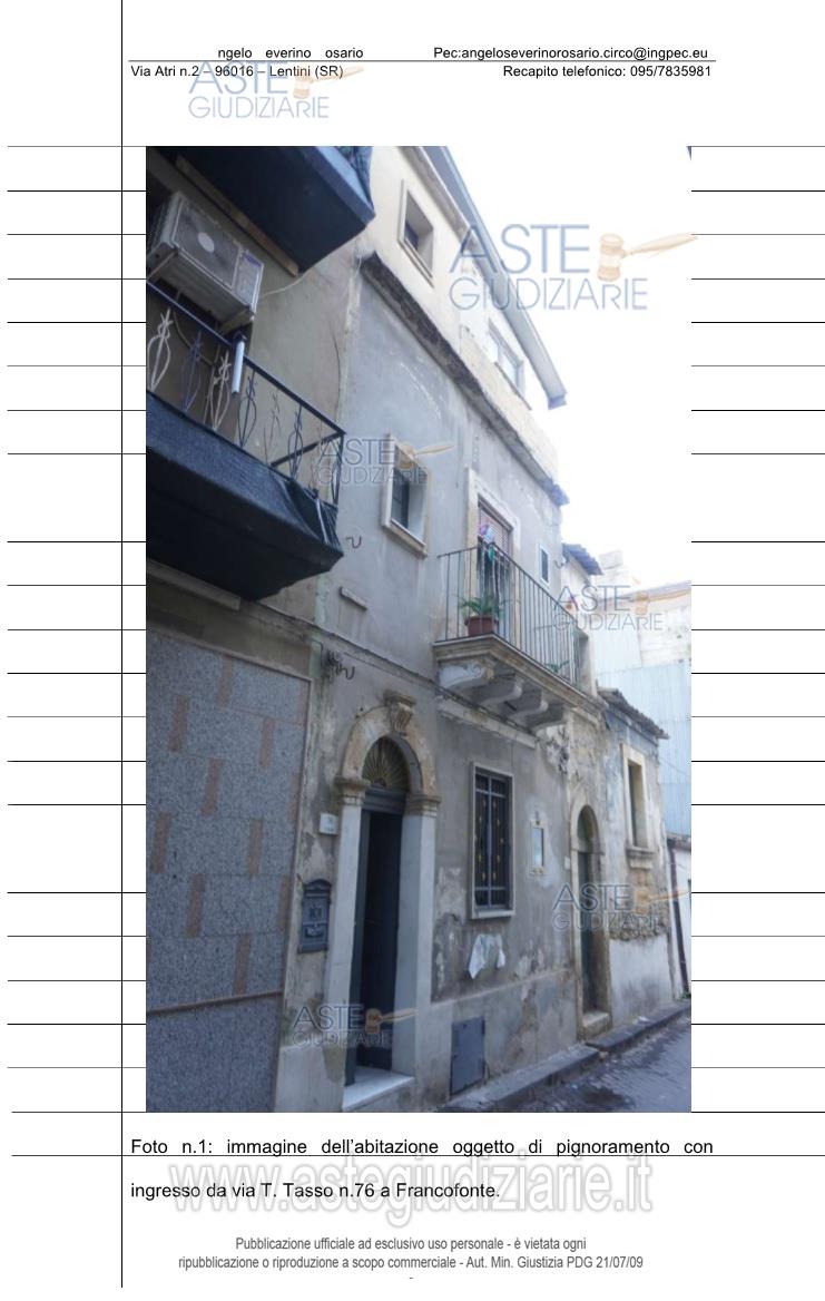 Vendita all'asta Senza incanto, con gara telematica sincrona mista - LOTTO UNICO: Piena proprietà immobile per civile abitazione sito nel comune di Francofonte (SR) con ingressi da via Spagna n.7 e da via T. Tasso n.76 (in Catasto nn.60-62), composto da un vano al piano interrato con ingresso da via Spagna, da un vano e cucina al piano terra, da un vano, servizio e disimpegno al piano primo e da una stanza al piano secondo. Catasto dei fabbricati del Comune di Francofonte al Foglio n.57, particella 5667, (prima Fg.58, P.lla 518), categ. A/4, classe 3, vani 5, Totale: 121 mq. Totale: escluse aree scoperte 112 mq, Rendita catastale pari a 222,08 via Torquato Tasso nn.60-62, Piano S1, T, 1-2. Prezzo base € 22.359,38 (offerta minima € 16.769,53). Data vendita 07/07/2026 ore 11:00. Professionista delegato alla vendita: Avv. Luigi Lutri - Email "info@studiolegalelutri.it"; Cell. 334/3898664.