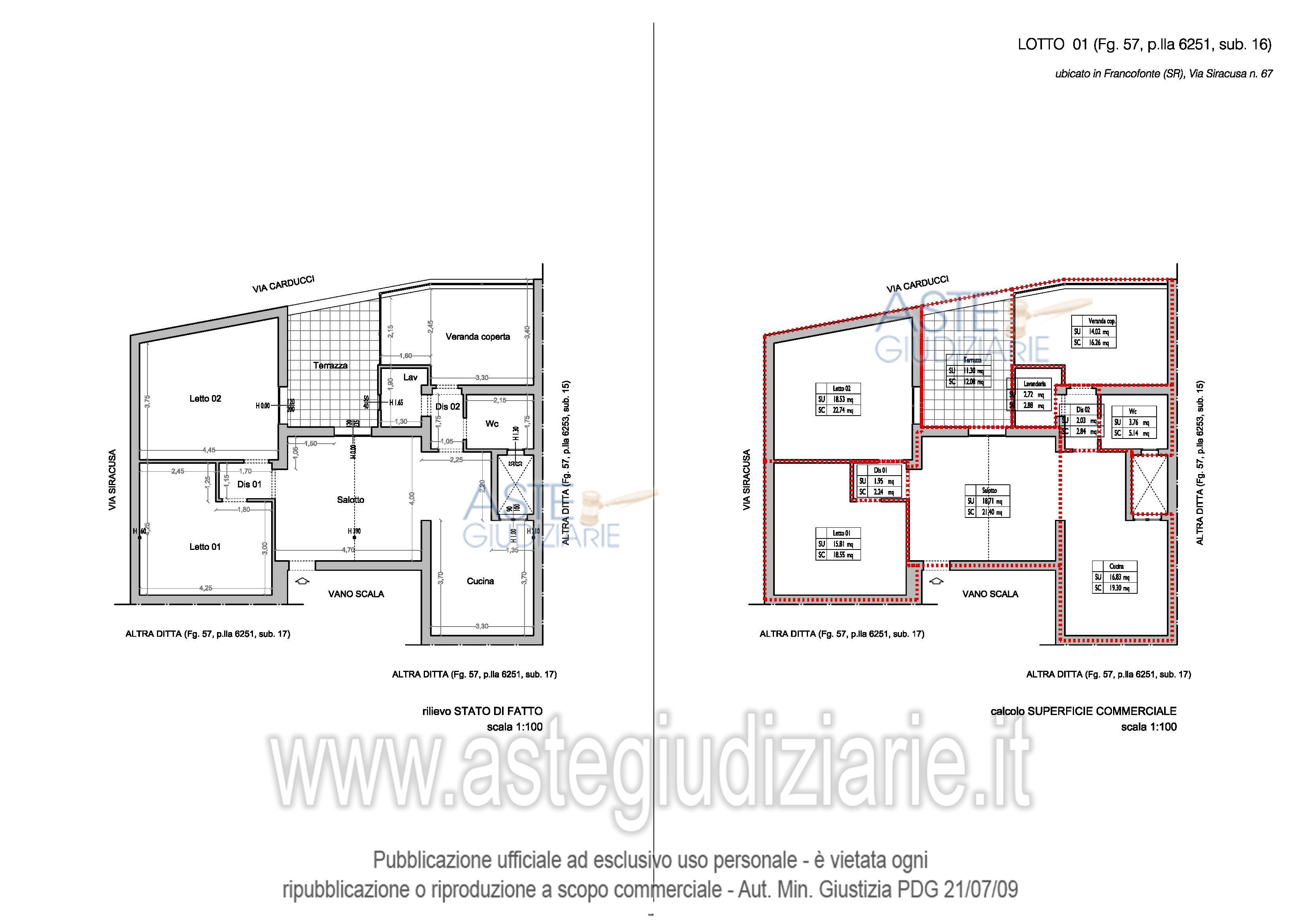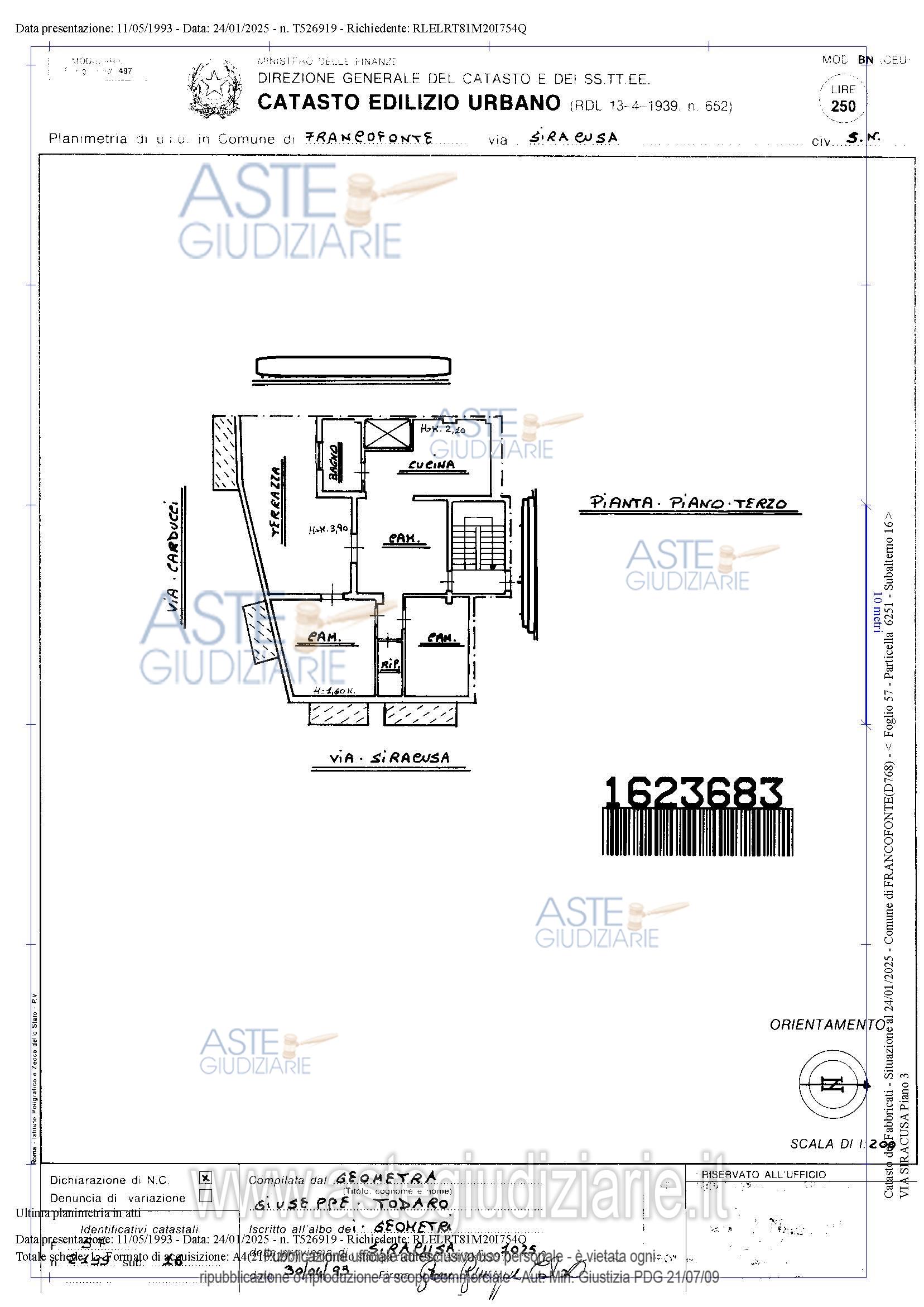 Vendita all'asta Senza incanto, con gara telematica sincrona mista - LOTTO UNICO: “Diritto di piena proprietà di un appartamento per civile abitazione , ubicato in centro urbano e facente parte di un edificio sito nel Comune di Francofonte (SR) nella Via Siracusa n. 67, piano 3°, posto al piano terzo, costituente piano mansardato, composto da tre vani e accessori e terrazza a livello, censito al N.C.E.U. al foglio 57, p.lla 6251, sub 16 ( ex foglio 57, p.lla 2199, sub 16), categoria A/2, classe 1, vani 4,5, r.c. € 429,95 ”. . Prezzo base € 33.750,00 (offerta minima € 25.312,50). Data vendita 22/04/2026 ore 10:00. Professionista delegato alla vendita Avv. Angelo Ripoli - Email "angeloavvocato447@gmail.com"; Cell. 3497456834. Custode Giudiziario Avv. Angelo Ripoli - Email "angeloavvocato447@gmail.com"; Cell. 3497456834. Rif. Tribunale di Siracusa - Espropriazione immobiliare (cartabia) n. 399/2024