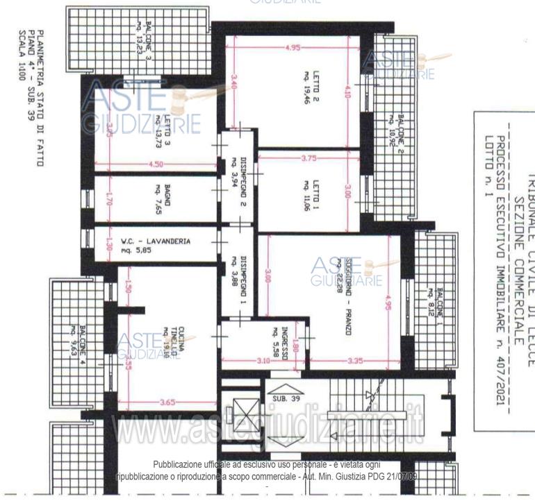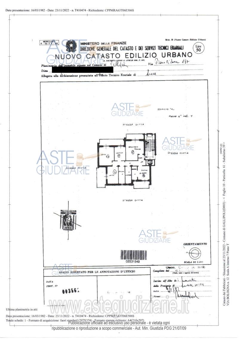 Vendita all'asta Senza incanto, con gara telematica asincrona - LOTTO 1: Piena proprietà 1/1 immobile residenziale in Gallipoli (Le) Via Modena 2, della superficie commerciale di 151,11 mq. Immobile ad uso civile abitazione, situato a Gallipoli in zona P.E.E.P. alla via Modena (ex via Bologna) civ. 2, della superficie commerciale di mq 152 circa. E’ posto al piano quarto int. 7 scala A di un complesso residenziale . E’ composto dai seguenti vani: ingresso, cucina-tinello, soggiorno-pranzo, disimpegno, n. 3 camere da letto e n. 2 bagni. Prezzo base € 155.250,00 (offerta minima € 116.438,00). Data inizio operazioni di vendita: 16/01/2026 ore 10:00. Professionista delegato alla vendita Avv. Piera Palumbo - Email "avv.pierapalumbo@libero.it"; Cell. 3357731495; Tel. 0832315113. Custode Giudiziario Avv. Piera Palumbo - Email "avv.pierapalumbo@libero.it"; Cell. 3357731495; Tel. 0832315113. Rif. Tribunale di Lecce - Esecuzione immobiliare post legge 80 n. 407/2021