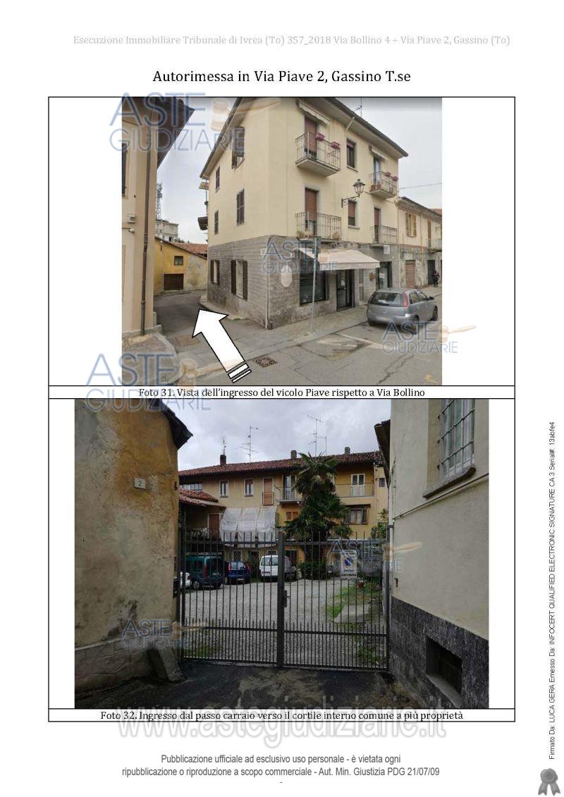 Vendita all'asta Senza incanto, con gara telematica asincrona - LOTTO 2: Bene 1: autorimessa al piano terreno ubicata in Vicolo Piave n. 2.Bene 2: abitazione al piano primo ubicata in Via Bollino n. 4. Prezzo base € 161.000,00 (offerta minima € 120.750,00). Data inizio operazioni di vendita: 20/05/2026 ore 09:30. Giudice Augusto Salustri. Professionista delegato alla vendita Avv. Antonio Sconza - Email "antonio.sconza@outlook.it"; Tel. 0125282417. Custode Giudiziario Torino Ifir Piemonte - Email "richiestevisite.ivrea@ivgpiemonte.it". Rif. Tribunale di Ivrea - Contenzioso civile n. 2385/2024