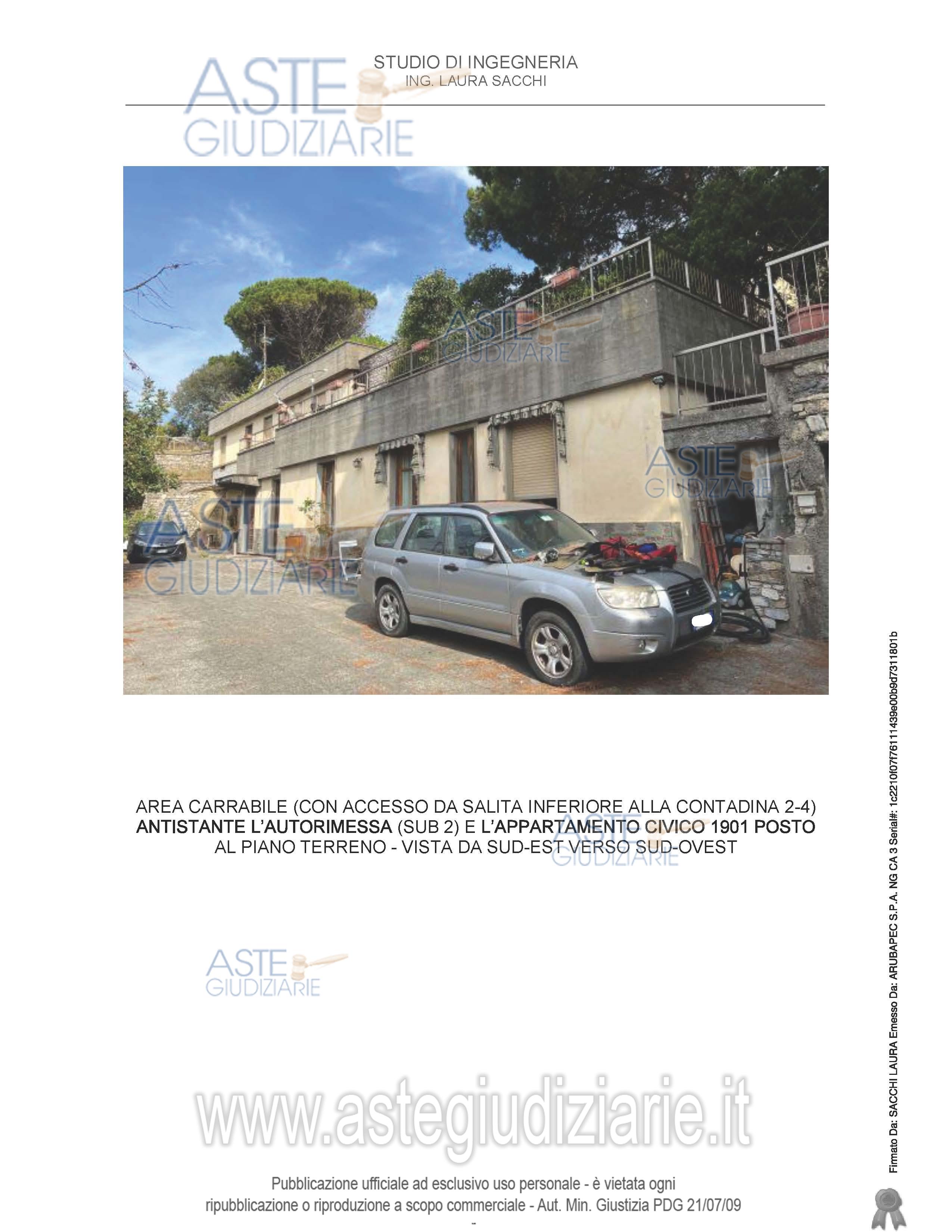 Vendita in attesa dell'emissione del nuovo bando d'asta. LOTTO UNICO: LOTTO UNICO in Comune di Genova (GE), Corso Europa civici 1901 e 1903 / Salita Inferiore alla Contadina civici 2 e 4, costituito da edificio bifamiliare, composto da n. 2 appartamenti, n. 1 box interrato, n. 1 autorimessa ed area urbana. Ultimo prezzo base € 754.889,00 (offerta minima € 566.166,75). Giudice Dott. Andrea Balba. Professionista delegato alla vendita Avv. Cristina Carena - Email "cristina.carena@sla-ap.it"; Tel. 010541263. Custode Giudiziario Dott. Sovemo Srl - Email "immobiliare@sovemo.com"; Tel. 0105299253. Rif. Tribunale di Genova - Esecuzione immobiliare post legge 80 n. 92/2022