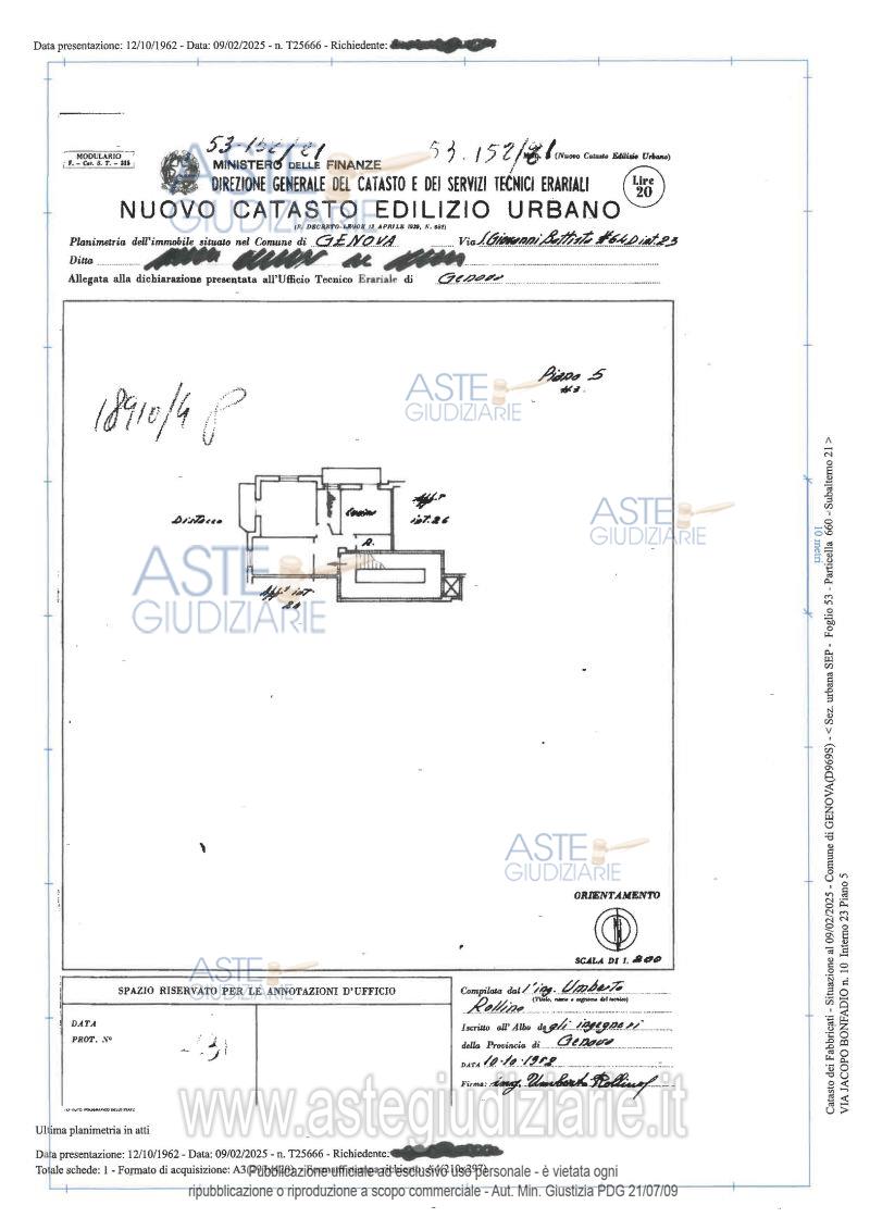 Vendita all'asta Senza incanto, con gara telematica sincrona mista - LOTTO UNICO: Appartamento ubicato in Genova via Jacopo Bonfadio 10/23, quinto piano, vani 4, due poggioli. Prezzo base € 47.342,00 (offerta minima € 35.506,00). Data vendita 20/01/2026 ore 14:00. Professionista delegato alla vendita Dott. Federico Mariani - Email "federico.mariani@outlook.com"; Tel. 0105761481. Custode Giudiziario Sovemo Srl - Email "visitegenova@sovemo.com"; Tel. 0105299253. Rif. Tribunale di Genova - Espropriazione immobiliare (cartabia) n. 502/2024