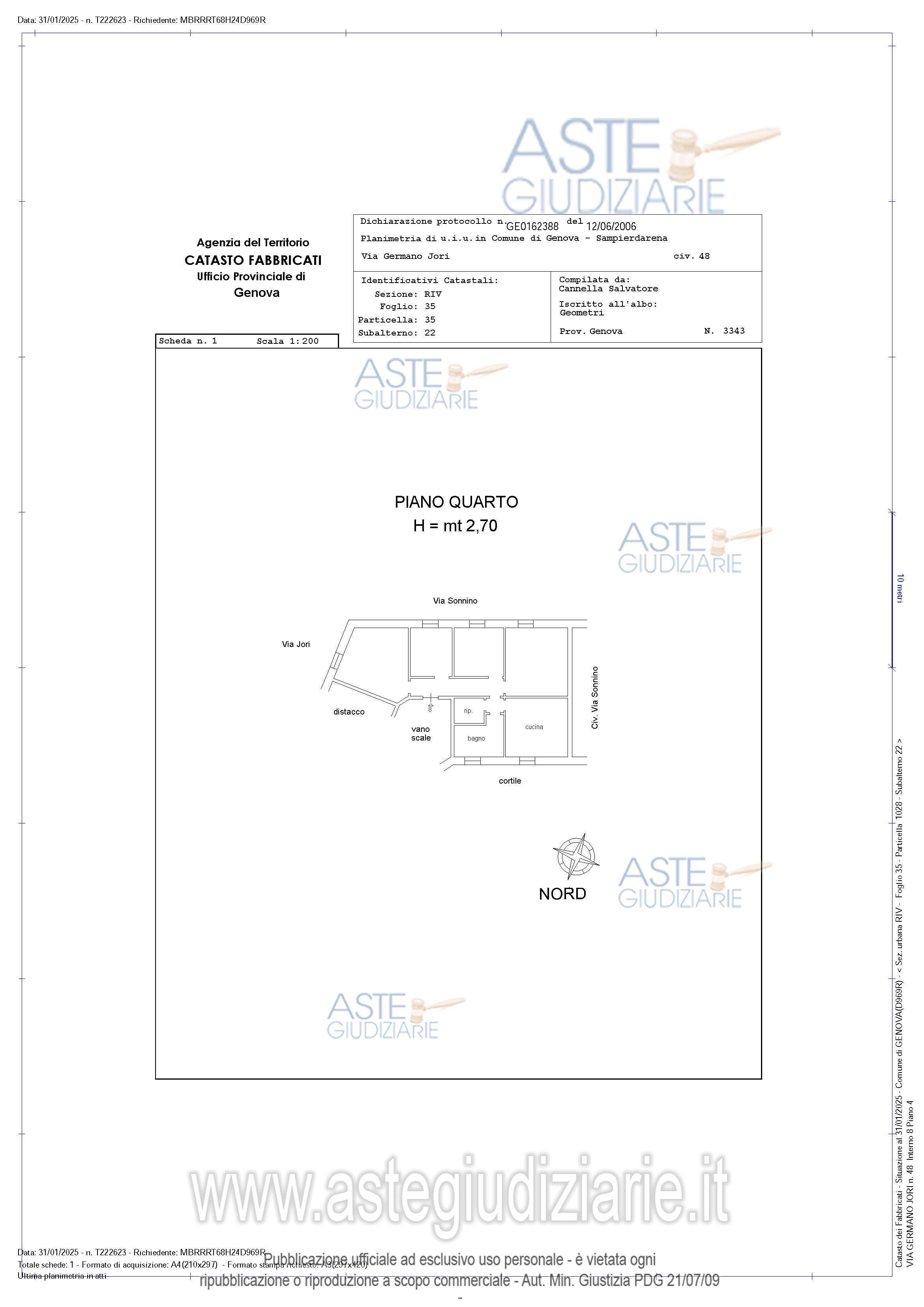 Vendita all'asta Senza incanto, con gara telematica sincrona mista - LOTTO UNICO: intera proprietà appartamento uso abitazione: Comune di Genova CAP 16100, Via Germano Jori 48 int.8 piano 4 Cat A/3 vani 7, S.T. 108 mq, R.C. € 668,81 L’immobile è costituito da locale ingresso, n.1 ripostigli, n.1 servizi igienici con antibagno n.4 stanze oltre ad una cucina, le condizioni dell’immobile sono buone, come quelle dello stabile. Prezzo base € 70.000,00 (offerta minima € 52.500,00). Data vendita 26/11/2025 ore 12:00. Professionista delegato alla vendita Avv. Massimo Molinari - Cell. 3358174755; Tel. 0105959358. Custode Giudiziario Sovemo Srl - Email "immobiliare@sovemo.com"; Tel. 01052299253. Rif. Tribunale di Genova - Espropriazione immobiliare (cartabia) n. 559/2024