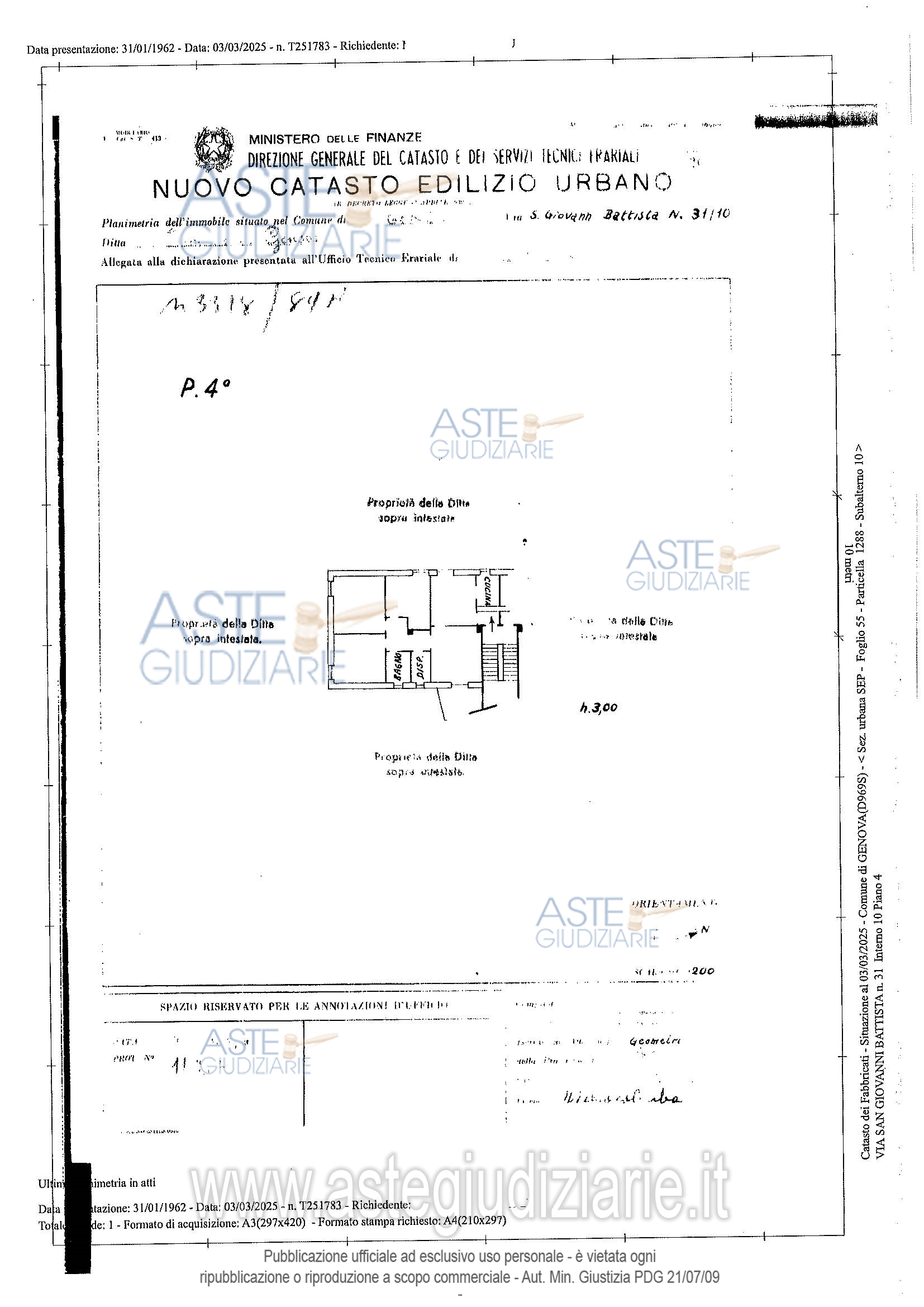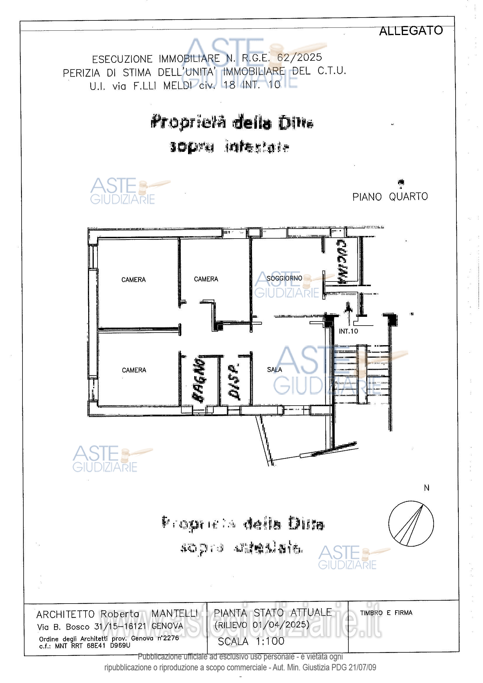 Vendita all'asta Senza incanto, con gara telematica sincrona mista - LOTTO UNICO: Appartamento sito in Genova, Via Fratelli Meldi 18/10, piano quarto, superficie convenzionale complessiva mq. 100,88. Prezzo base € 83.724,90 (offerta minima € 62.793,68). Data vendita 26/03/2026 ore 15:00. Professionista delegato alla vendita Dott. Paolo Botta - Email "paolo.botta@genoachambers.it"; Tel. 0105700122. Custode Giudiziario Dott. Sovemo Srl - Email "immobiliare@sovemo.com". Rif. Tribunale di Genova - Espropriazione immobiliare (cartabia) n. 62/2025