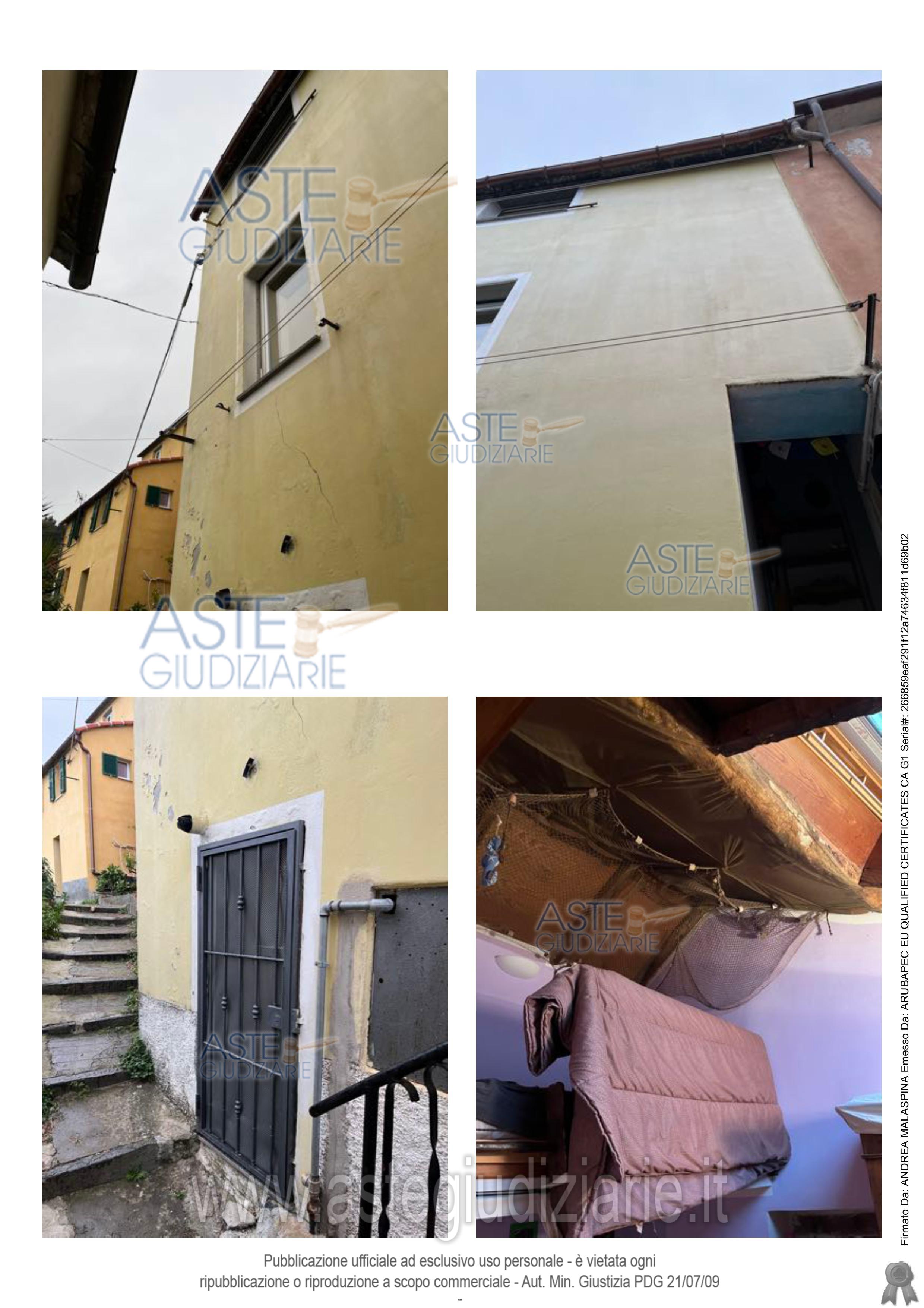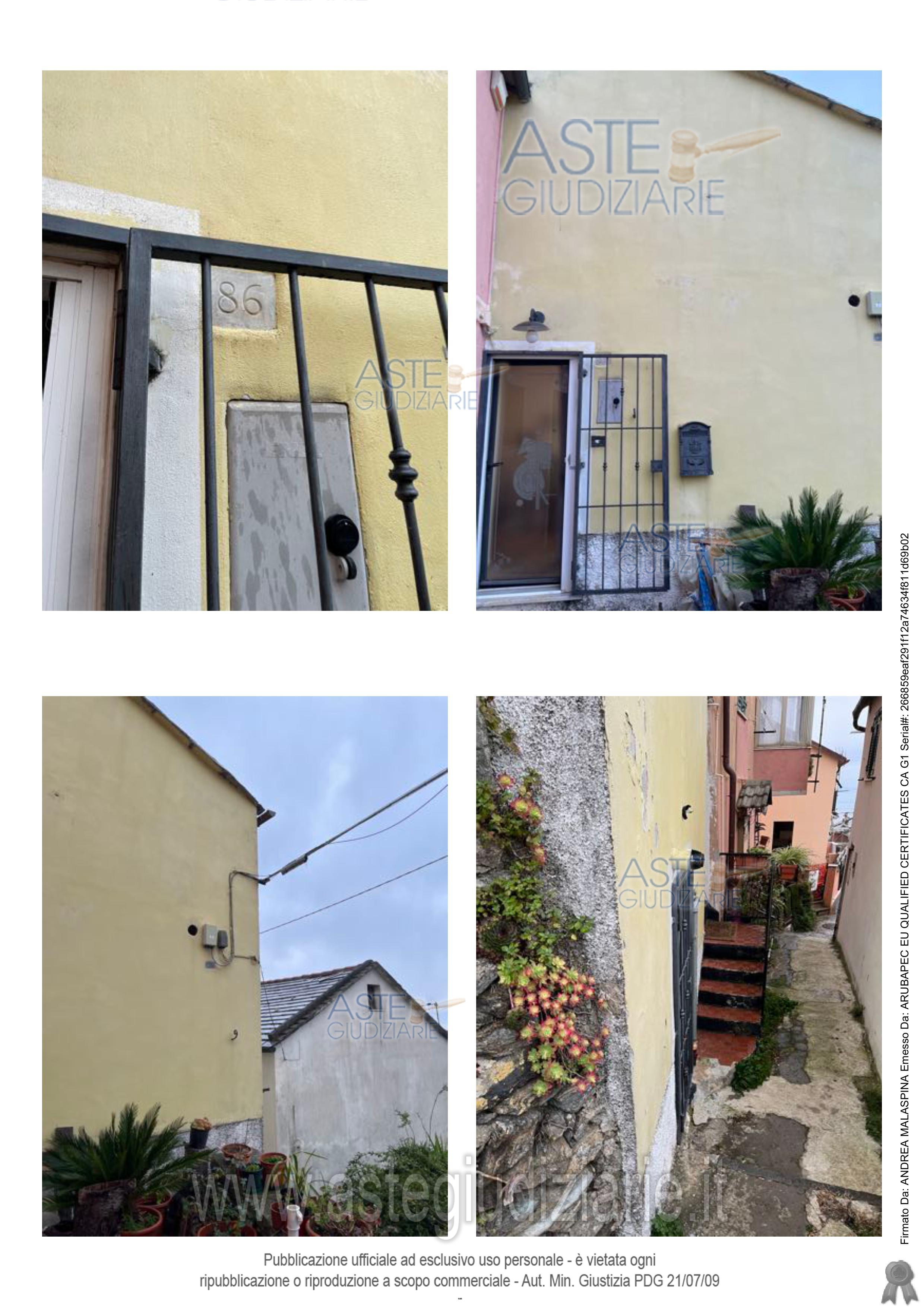 Vendita all'asta Senza incanto, con gara telematica sincrona mista - LOTTO UNICO: Piena ed intera proprietà di villetta a schiera da cielo a terra, su tre piani, superficie complessiva convenzionale mq.131,20 circa, con edifici in aderenza su due lati, raggiungibile solo pedonalmente, in Genova (GE), delegazione Crevari, Via Piazzafrande 86. Al piano seminterrato: locale caldaia/un wc; al piano terra: un angolo cottura ed un soggiorno; al piano primo: una camera da letto ed una cabina armadi. Prezzo base € 146.737,50 (offerta minima € 110.054,00). Data vendita 17/04/2026 ore 16:00. Giudice Daniele Bianchi. Professionista delegato alla vendita Avv. Francesco Nossardi - Email "fnossar@tin.it"; Tel. 010562985. Custode Giudiziario Dott. Sovemo Srl - Email "immobiliare@sovemo.com"; Tel. 0105299253. Rif. Tribunale di Genova - Espropriazione immobiliare (cartabia) n. 323/2024