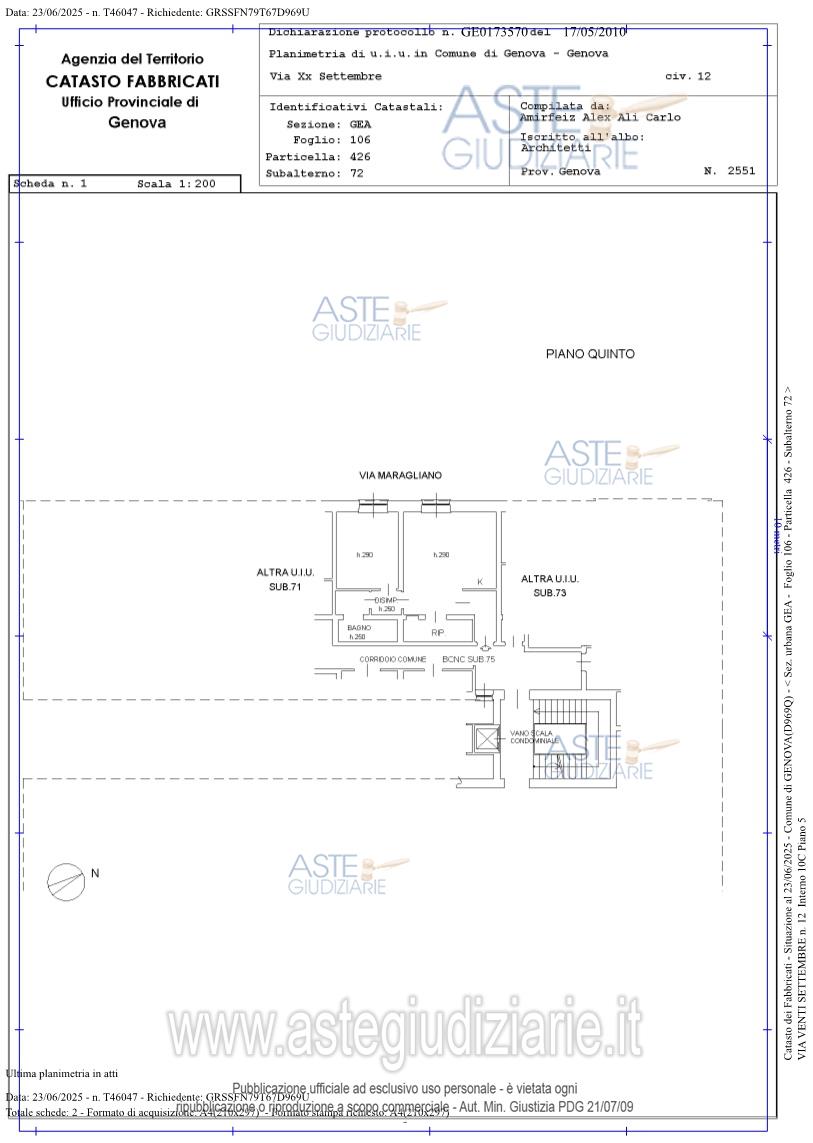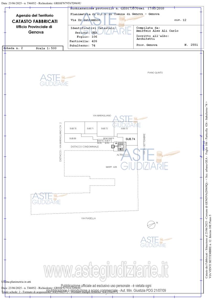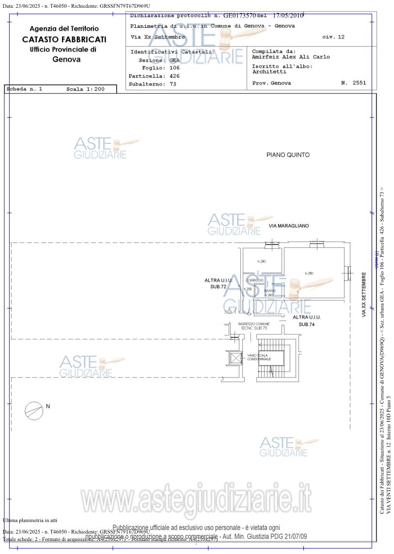 Vendita all'asta Senza incanto, con gara telematica sincrona mista - LOTTO 2: Bene N° 1 - Quota 100% diritto di proprietà appartamento ubicato a Genova (GE) - Via Venti Settembre 12 int.10C, edificio 1, scala 1, interno 10C, piano 5;Bene N° 2 - Quota 100% diritto di proprietà appartamento ubicato a Genova (GE) - Via Venti Settembre 12 int.10D, edificio 1, scala 1, interno 10D, piano 5;Bene N° 3 - Quota 100% diritto di proprietà appartamento ubicato a Genova (GE) - Via Venti Settembre 12 int.10E, edificio 1, scala 1, interno 10E, piano 5. Prezzo base € 522.780,00 (offerta minima € 392.085,00). Data vendita 25/02/2026 ore 13:30. Professionista delegato alla vendita Dott. Luca Ciccangeli - Email "ciccangeli.luca@gmail.com"; Cell. 3385912888; Tel. 010581778. Custode Giudiziario Sovemo Srl - Email "visitegenova@sovemo.com"; Tel. 01005299253. Rif. Tribunale di Genova - Espropriazione immobiliare (cartabia) n. 71/2025