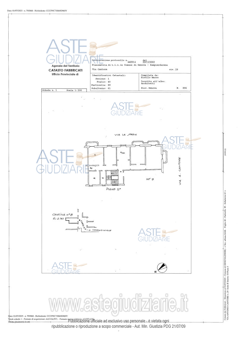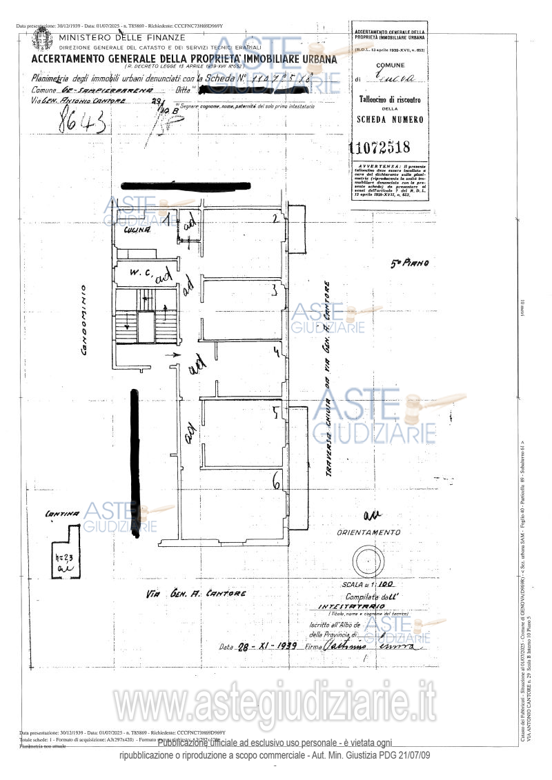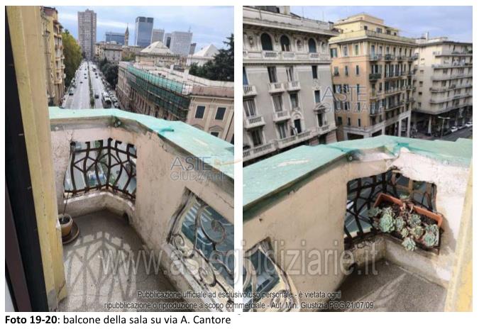 Vendita all'asta Senza incanto, con gara telematica sincrona mista - LOTTO UNICO: Piena ed intera proprietà dell'appartamento ubicato a Genova VIA ANTONIO CANTORE n. 29, scala B, interno 10, piano 5. Abitazione di tipo civile di 122 mq netti (commerciali141 mq) composta da un ingresso, soggiorno, camera matrimoniale, sala, una camera/studio, cucina, due bagni, ripostiglio e due balconi. Annessa come pertinenza una cantina, contraddistinta con n. 8 superficie netta di circa 3,75 mq. Prezzo base € 135.540,60 (offerta minima € 101.655,45). Data vendita 25/03/2026 ore 14:30. Professionista delegato alla vendita Dott. Elisabetta Bargelli - Email "elisabetta.bargelli@bureauplattner.com"; Tel. 010589081. Custode Giudiziario Sovemo Srl - Email "immobiliare@sovemo.com"; Tel. 0105299253. Rif. Tribunale di Genova - Espropriazione immobiliare (cartabia) n. 191/2025