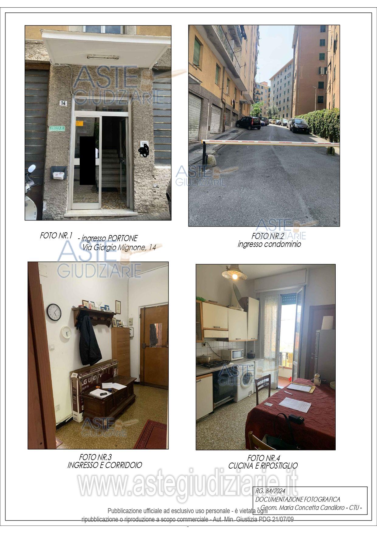 Vendita all'asta Senza incanto, con gara telematica sincrona mista - LOTTO UNICO: Appartamento di tipo economico sito nel Comune di Genova Via Mignone civ. 14 int. 5 piano terzo - consistenza 4,5 vani, 75,80 mq sito in zona residenziale e commerciale, molto ben servita dal trasporto pubblico degli autobus ed in prossimità dell'ingresso ed all'interno del condominio ci sono molti parcheggi, inoltre la corte è delimitata da sbarre con apertura automatica. Prezzo base € 49.000,00 (offerta minima € 36.750,00). Data vendita 24/04/2026 ore 14:00. Professionista delegato alla vendita Avv. Maria Michela Tacchini - Email "mariamichela.tacchini@gmail.com"; Tel. 3453563750. Custode Giudiziario Dott. Renata Boilini - Email "immobiliare@sovemo.com". Rif. Tribunale di Genova - Espropriazione immobiliare (cartabia) n. 84/2024