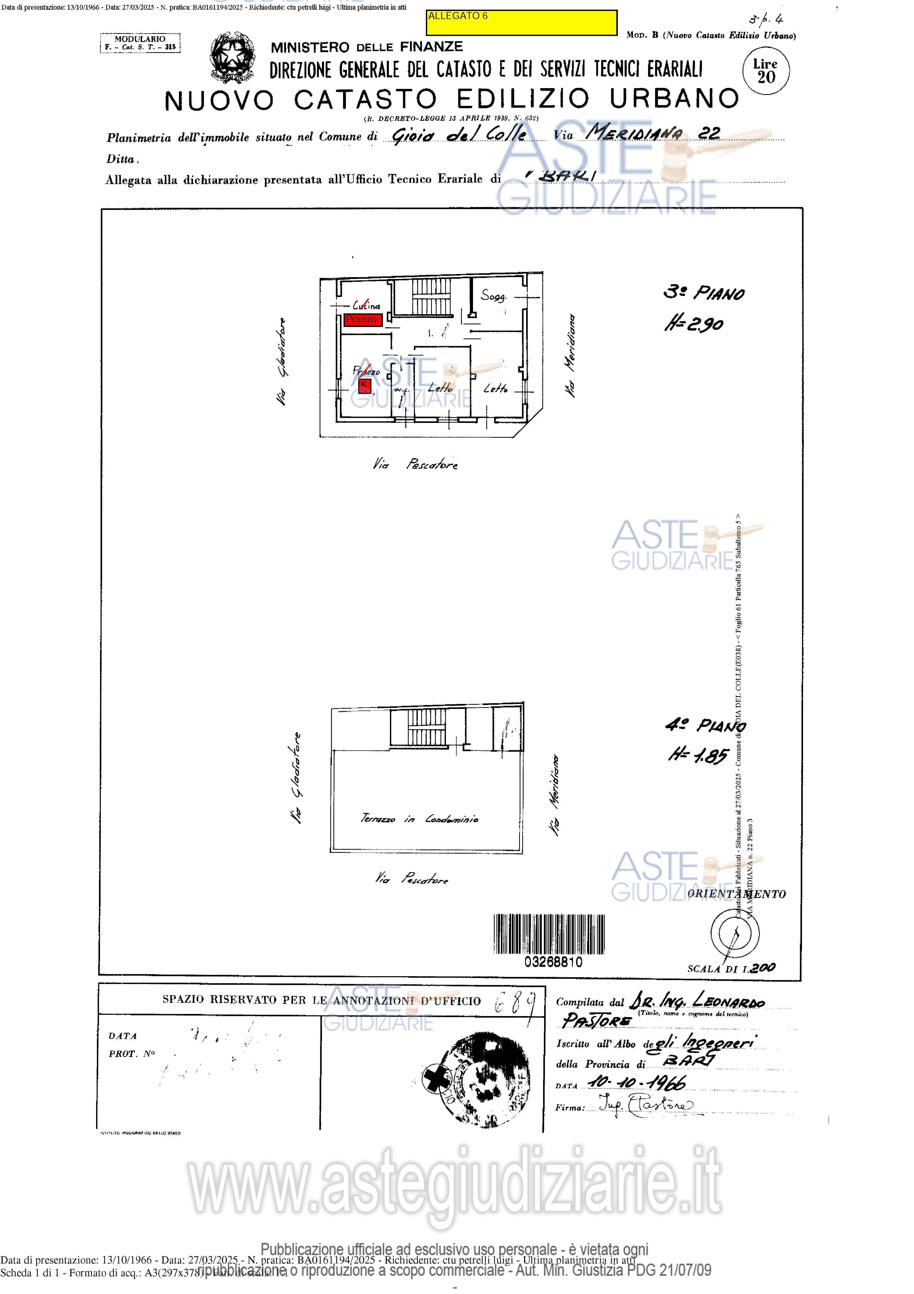 Vendita all'asta Senza incanto, con gara telematica asincrona - LOTTO UNICO: Piena proprietà dell’appartamento al piano terzo, costituito da 6 vani e accessori distribuiti in un soggiorno, camera da pranzo, due camere da letto, cucina, bagno e 2 balconi oltre a cantina su lastrico solare condominiale. Prezzo base € 73.275,00 (offerta minima € 54.960,00). Data inizio operazioni di vendita: 15/04/2026 ore 10:00. Giudice Dott. Marisa Attollino. Professionista delegato alla vendita Avv. Angela Rotondi - Email "angelarotondi1@gmail.com". Custode Giudiziario Avv. Angela Rotondi - Email "angelarotondi1@gmail.com". Rif. Tribunale di Bari - Espropriazione immobiliare (cartabia) n. 433/2024