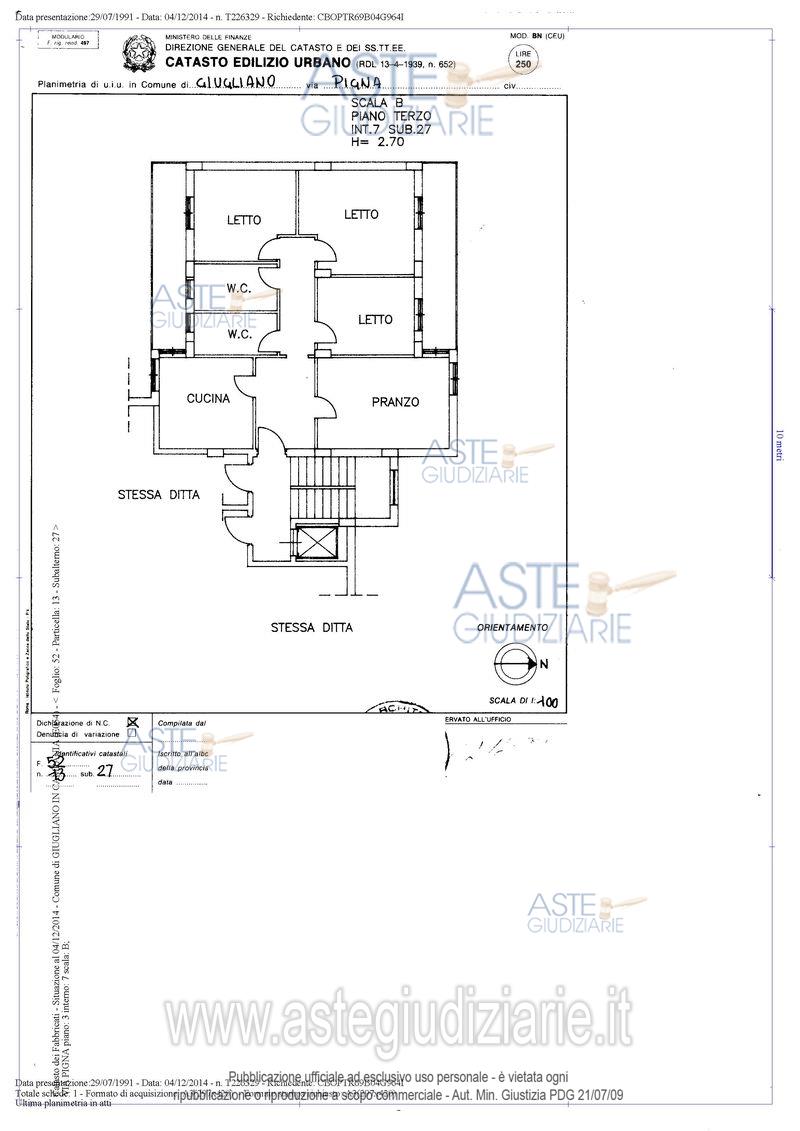Vendita all'asta Senza incanto, con gara telematica asincrona - LOTTO UNICO: diritto di Piena Proprietà dell’U.I. in Giugliano in Campania (NA) alla Via Pigna n. 68: appartamento al terzo piano della scala B distinto con il numero interno 7 con accesso dal lato destro del vano scale e ascensore, della consistenza catastale di vani 6,5, composta da tre camere da letto, salone, cucina, due bagni e un ripostiglio oltre due balconi, per una superficie coperta, come da perizia di circa metri quadri 92. Prezzo base € 101.234,00 (offerta minima € 75.926,00). Data inizio operazioni di vendita: 03/12/2025 ore 10:00. Professionista delegato alla vendita Not. Maria Francesca Bottino - Email "mbottino@notariato.it"; Tel. 0817649781. Custode Giudiziario Not. Maria Francesca Bottino - Email "mbottino@notariato.it"; Tel. 0817649781. Rif. Tribunale di Napoli - Esecuzione immobiliare post legge 80 n. 787/2013