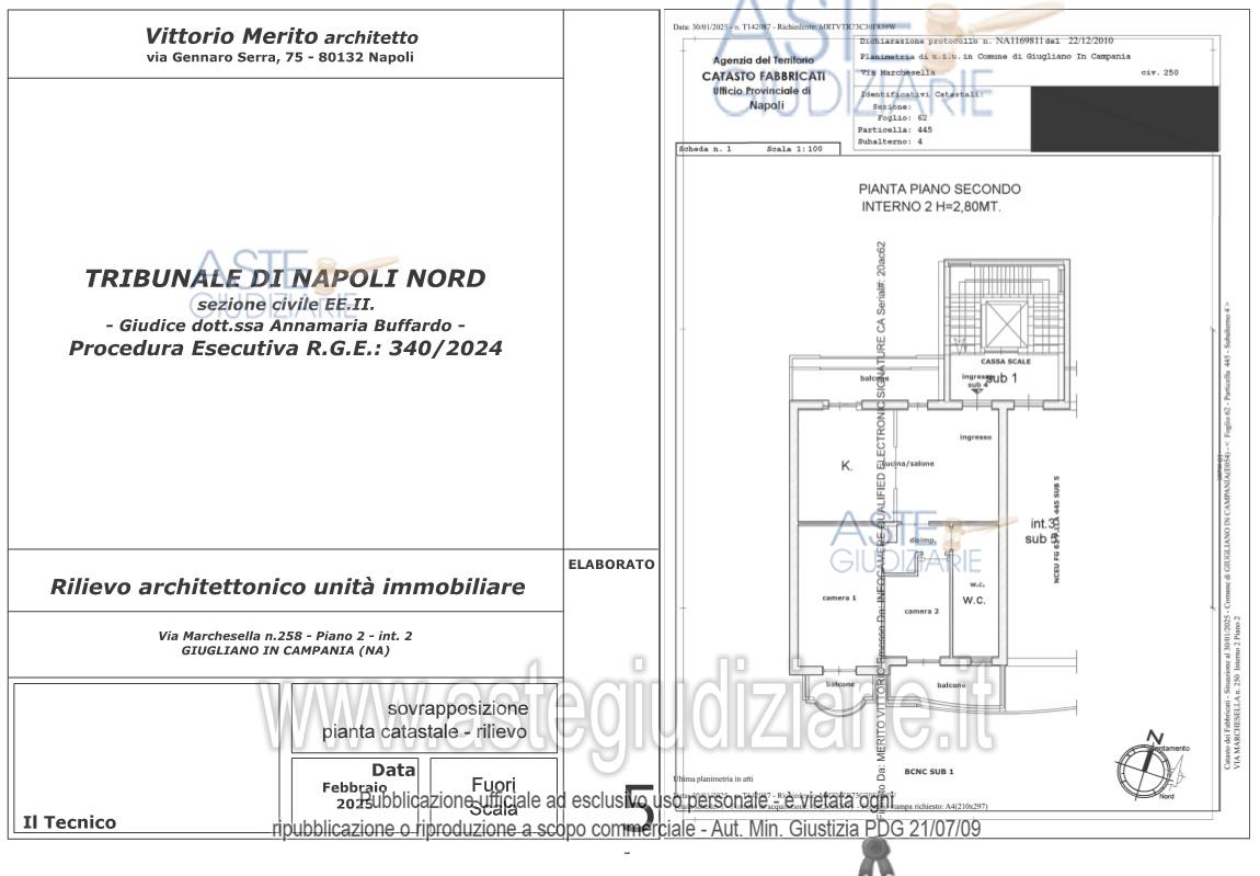 Vendita all'asta Senza incanto, con gara telematica asincrona - LOTTO 1: Appartamento ubicato nel Comune di Giugliano in Campania (Na), alla via Marchesella n. 258 (catastalmente n. 250) piano 2, int. 2, composto da: ingresso/cucina/salone, n. 2 camere, n. 1 w.c., disimpegno e n. 3 balconi, con superficie totale lorda di circa 74 mq. Prezzo base € 110.000,00 (offerta minima € 82.500,00). Data inizio operazioni di vendita: 26/05/2026 ore 10:00. Giudice Dott. Annamaria Buffardo. Professionista delegato alla vendita Dott. Giovanni Esposito - Email "segreteria@espositopartners.it"; Tel. 0818449234. Custode Giudiziario Dott. Giovanni Esposito - Email "segreteria@espositopartners.it"; Tel. 0818449234. Rif. Tribunale di Napoli Nord - Espropriazione immobiliare (cartabia) n. 340/2024