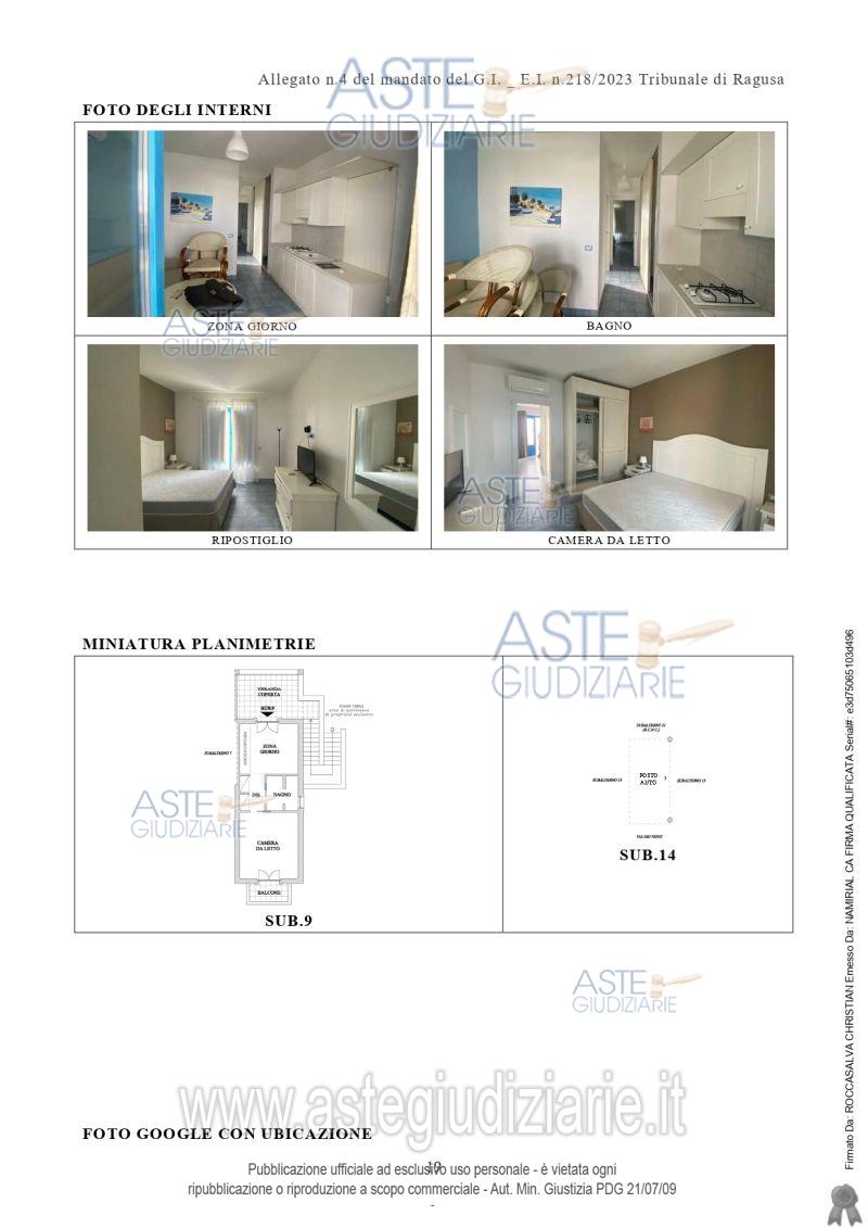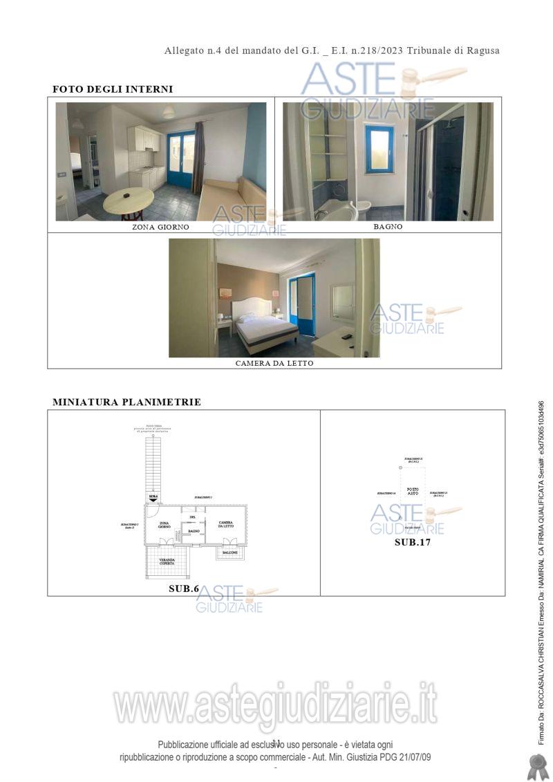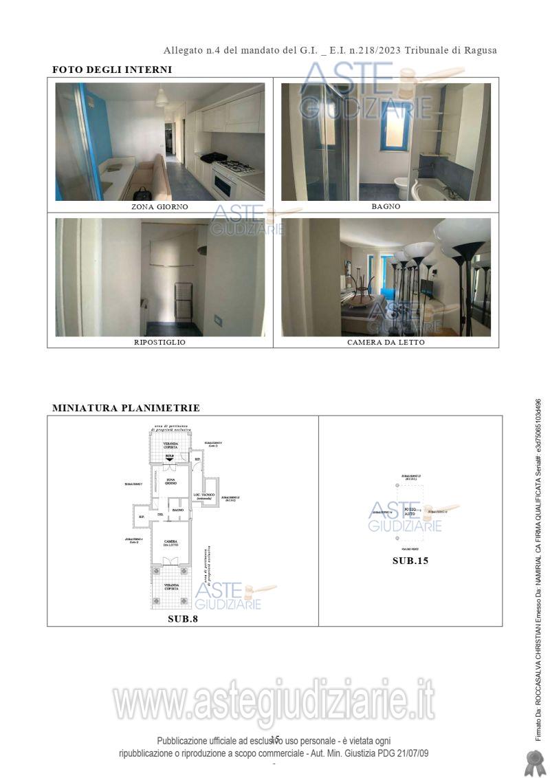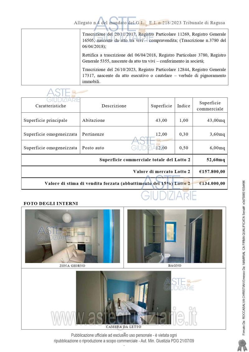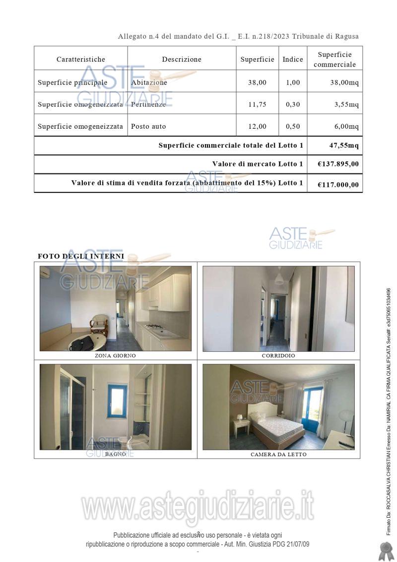 Vendita all'asta Senza incanto, con gara telematica sincrona mista - LOTTO 4: Piena proprietà di immobile ad uso per civile abitazione sito in Ispica (RG), si accede dalla Via dei Venti in corrispondenza del civico n. 17 interno “Sole” percorrendo il viale di ingresso pedonale (sub.20 B.C.N.C.), si compone di una abitazione al piano terra. Posto auto mq. 12. Prezzo base € 132.000,00 (offerta minima € 99.000,00). Data vendita 11/12/2025 ore 17:00. Professionista delegato alla vendita Avv. Raffaele Di Rosa Jr - Email "rafdirosa@virgilio.it". Custode Giudiziario Avv. Raffaele Di Rosa Jr - Email "rafdirosa@virgilio.it". Rif. Tribunale di Ragusa - Espropriazione immobiliare (cartabia) n. 218/2023