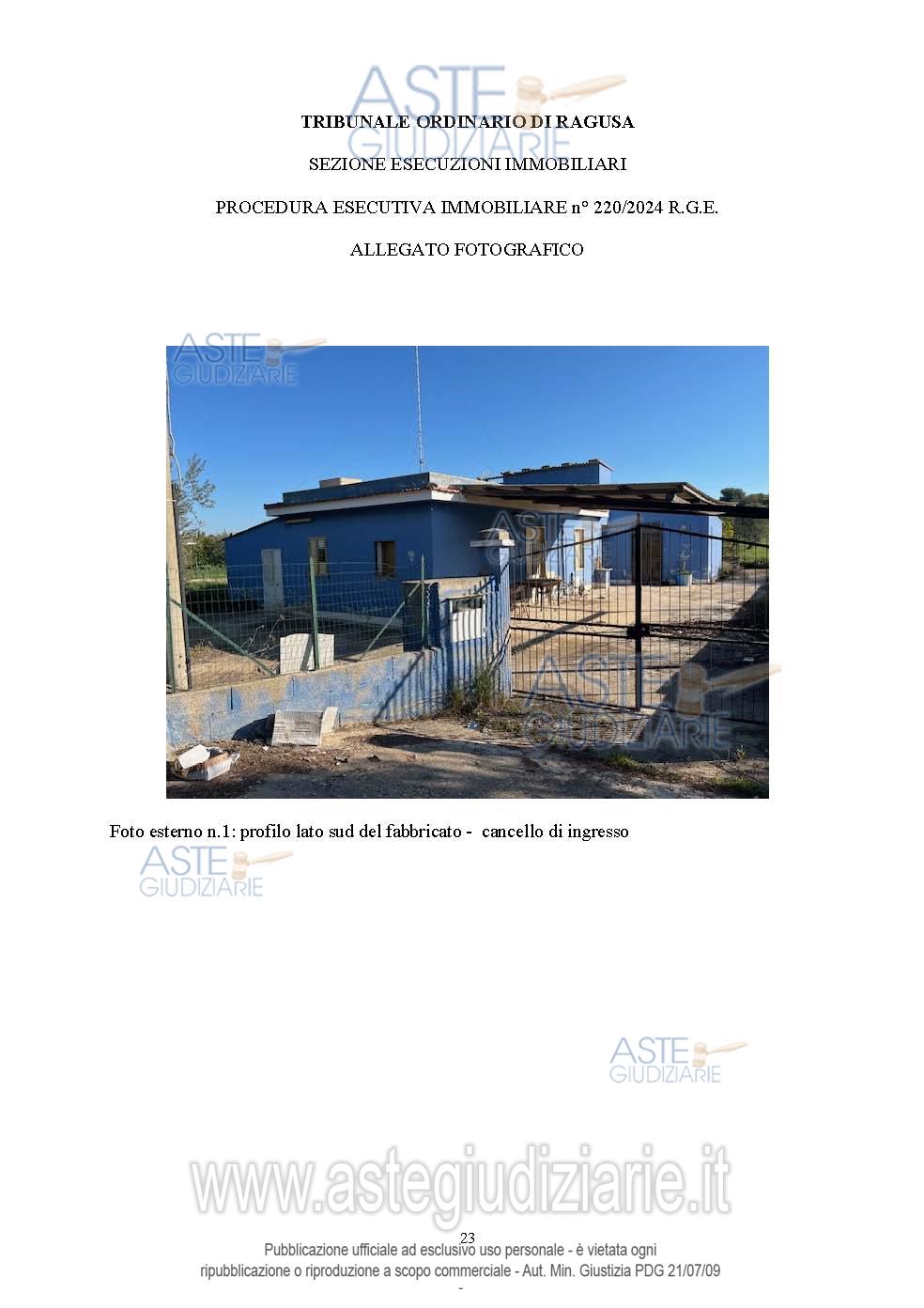 Vendita all'asta Senza incanto, con gara telematica sincrona mista - LOTTO UNICO: Fabbricato sito in Ispica, c.da Pagliazzone snc, censito al Catasto del Comune di Ispica al foglio 41 p.lla 142 piano terra, categoria A/3, classe 1, Consistenza vani n. 4, superficie 95 mq, aree scoperte mq 79, rendita euro 247,90; terreno sito in Ispica in c.da Timponelli – Pagliazzone, della superficie di 4.070 mq qualità vigneto, classe 2, reddito dominicale euro 46,24, reddito agrario euro 13,66. Prezzo base € 13.800,00 (offerta minima € 10.350,00). Data vendita 18/12/2025 ore 17:00. Giudice Dott. Carlo Di Cataldo. Professionista delegato alla vendita Avv. Elia Amore. Custode Giudiziario Avv. Elia Amore - Email "eliaamore@gmail.com"; Cell. 3384557264; Tel. 0932954628. Rif. Tribunale di Ragusa - Espropriazione immobiliare (cartabia) n. 220/2024