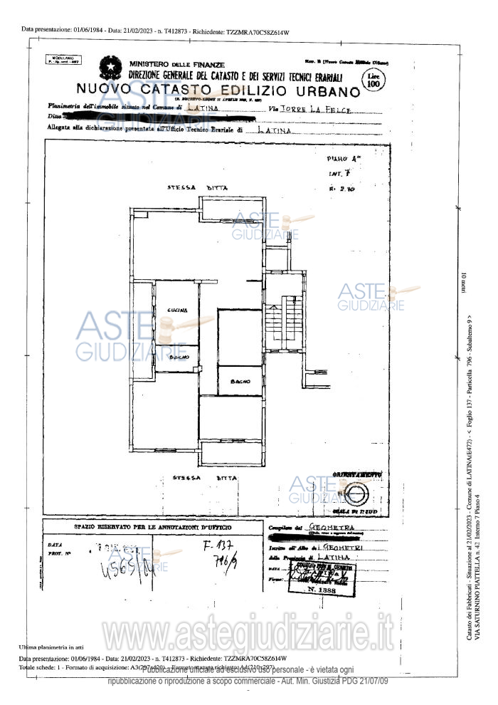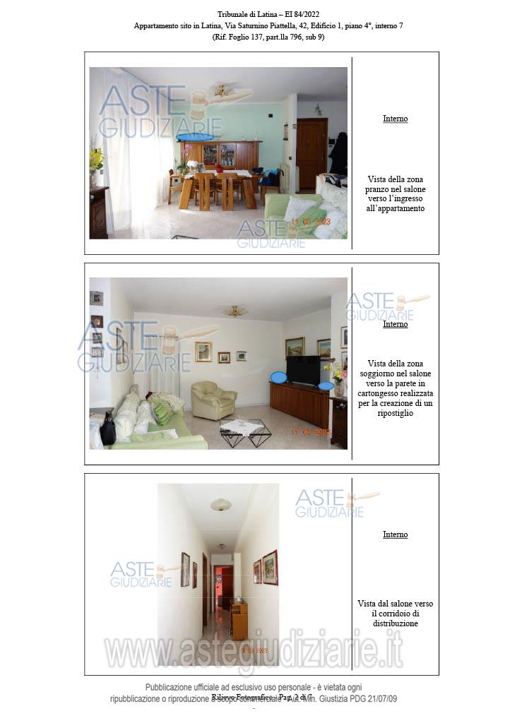 Vendita all'asta Senza incanto, con gara telematica asincrona - LOTTO UNICO: Piena proprietà di appartamento sito in Latina alla via Saturnino Piattella n. 42, edificio 1, interno 7, sito al quarto ed ultimo piano di un edificio dotato di ascensore di superficie netta pari a circa 112,53 mq costituito da ampia sala/pranzo (27,69 mq), cucina abitabile (11,84 mq), n° 2 bagni completi di cui uno dotato di vasca (4,99 mq e 5,18 mq), ripostiglio (6,36 mq), stanza da letto matrimoniale (20,89 mq), n°2 stanze da letto singole (10,73 mq e 11,48 mq) e n°3 balconi coperti. Prezzo base € 150.090,54 (offerta minima € 112.567,91). Data inizio operazioni di vendita: 12/05/2026 ore 16:00. Giudice Saviano. Professionista delegato alla vendita Dott. Romagnoli - Email "info@studio-romagnoli.it". Rif. Tribunale di Latina - Contenzioso civile n. 542/2024