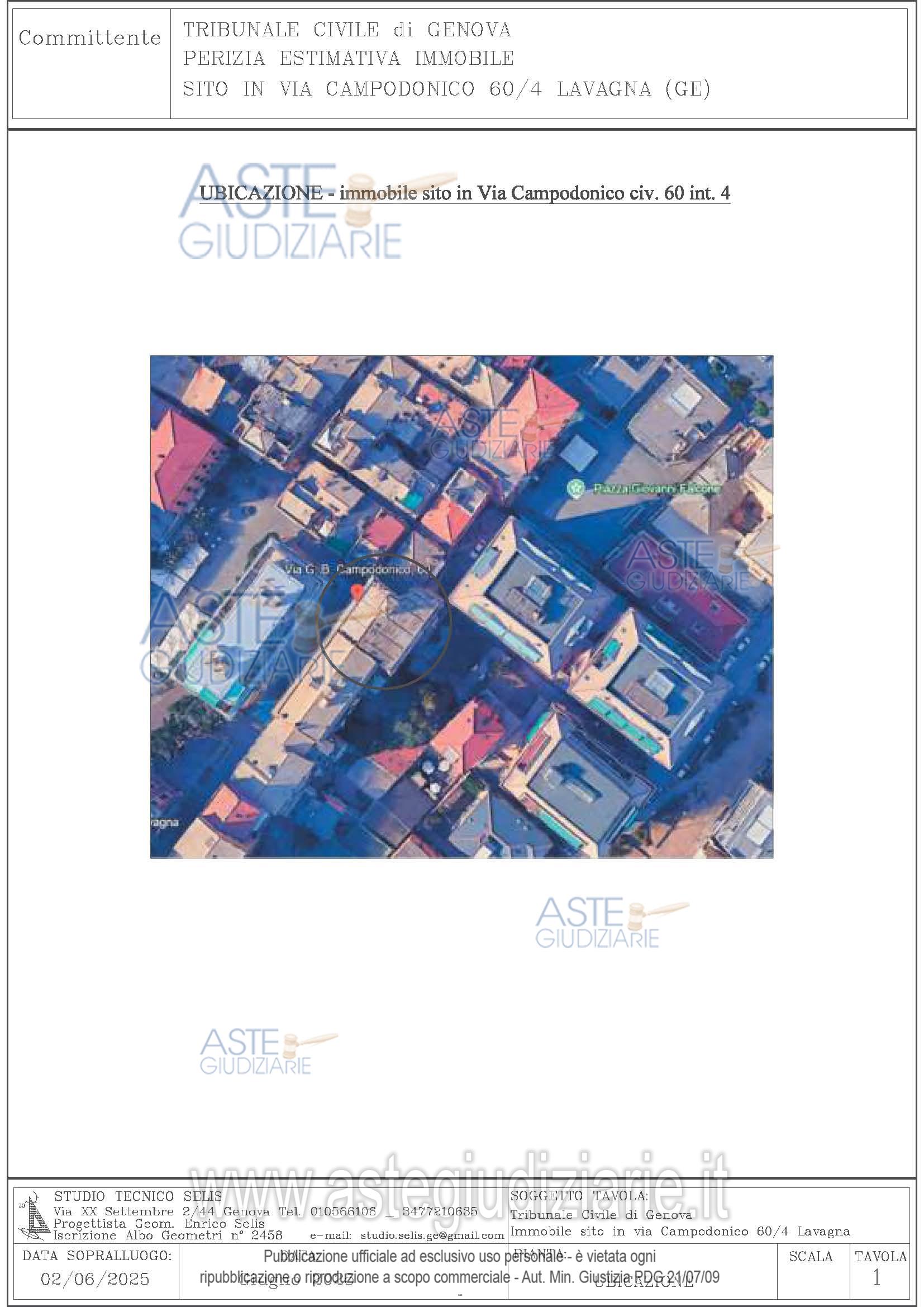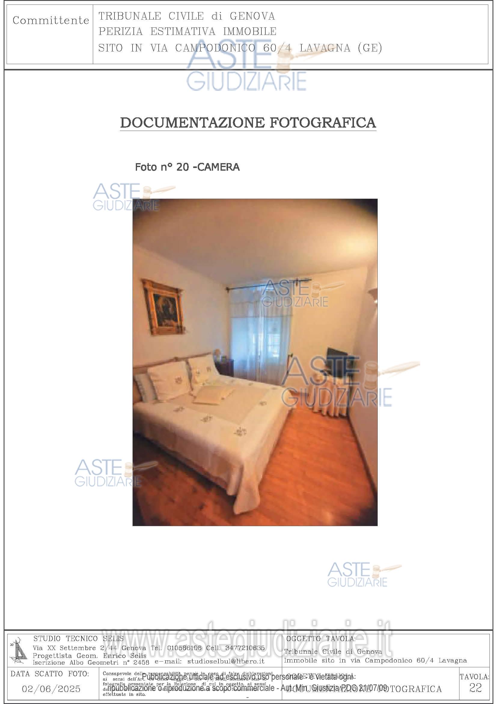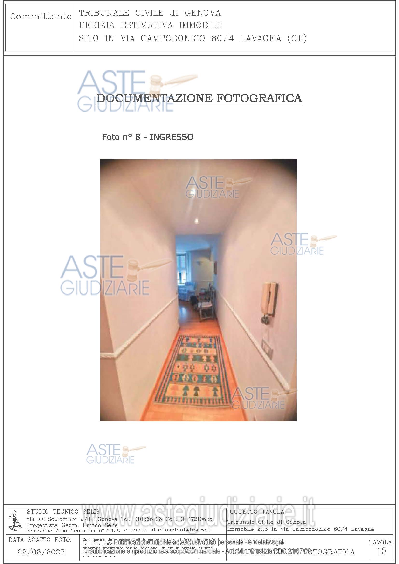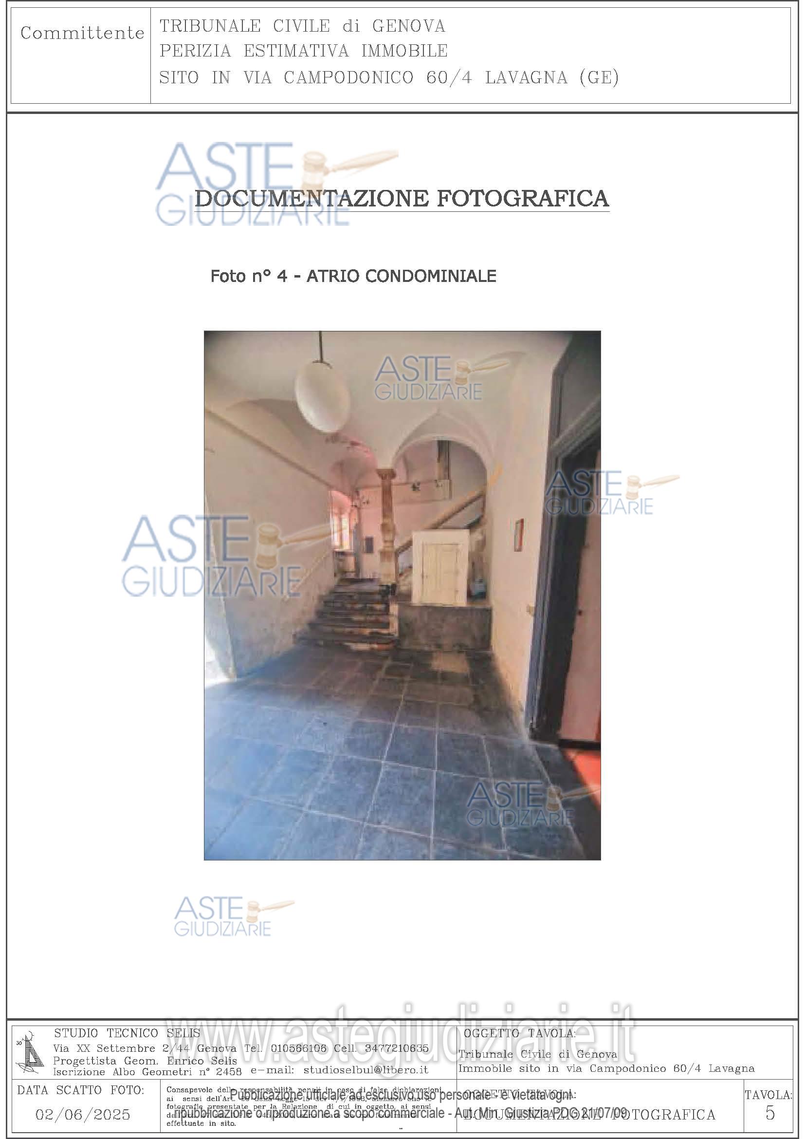 Vendita all'asta Senza incanto, con gara telematica sincrona mista - LOTTO UNICO: 100% BENE immobile gravato dal diritto di abitazione. Appartamento ubicato al civ. 60 int. 4 di Via Giovanni Battista Campodonico in Lavagna (GE) posto al secondo piano (senza ascensore) composto da ingresso, corridoio, ampia sala dotata di due finestre con esposizione a nord-ovest, soggiorno, una camera da letto matrimoniale anch’essa esposta a nord-ovest, due bagni, cucina con esposizione a nord-ovest e locale ripostiglio. Prezzo base € 204.000,00 (offerta minima € 183.600,00). Data vendita 29/04/2026 ore 15:00. Rif. Tribunale di Genova - Liquidazione giudiziale(cci) n. 125/2024