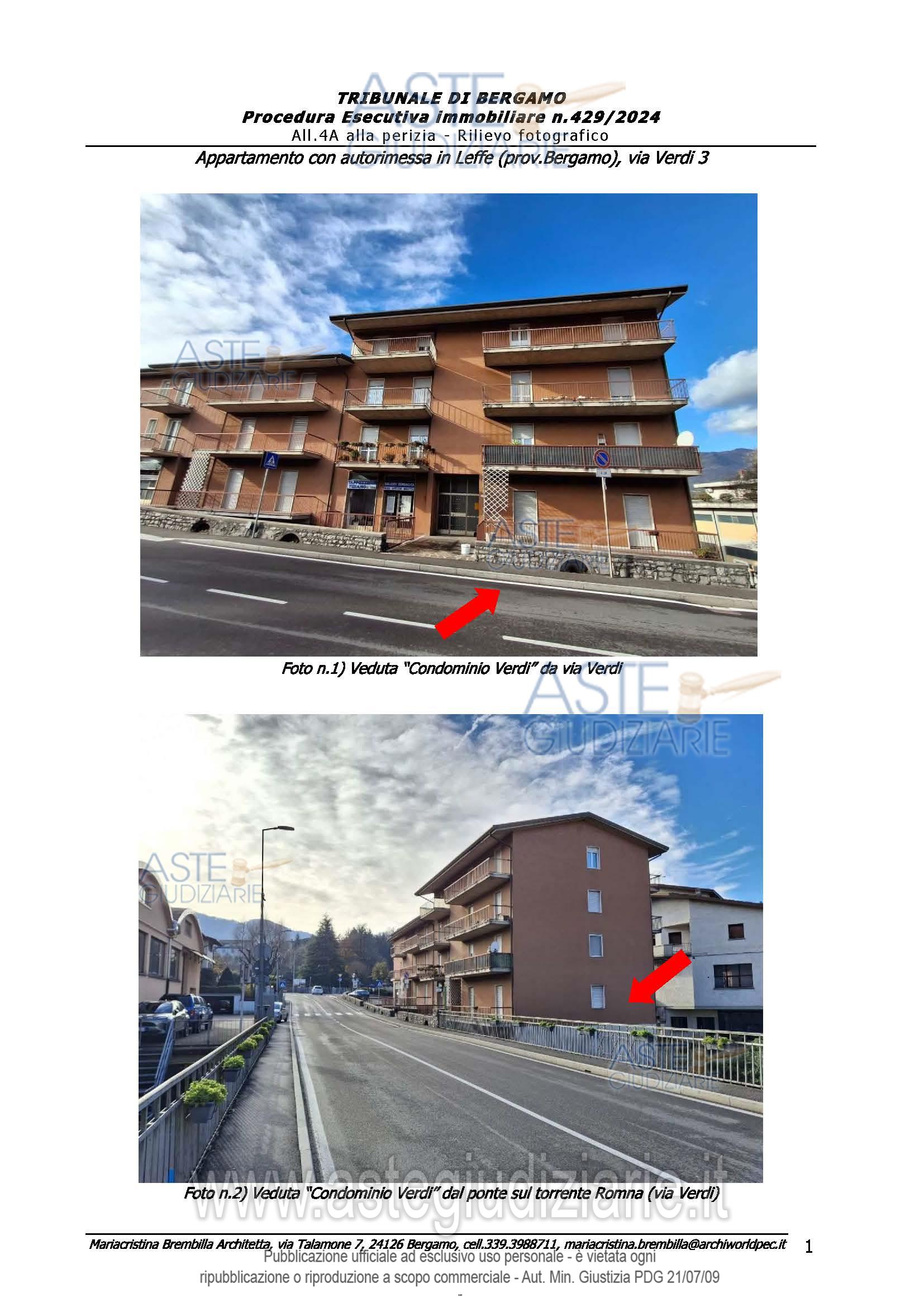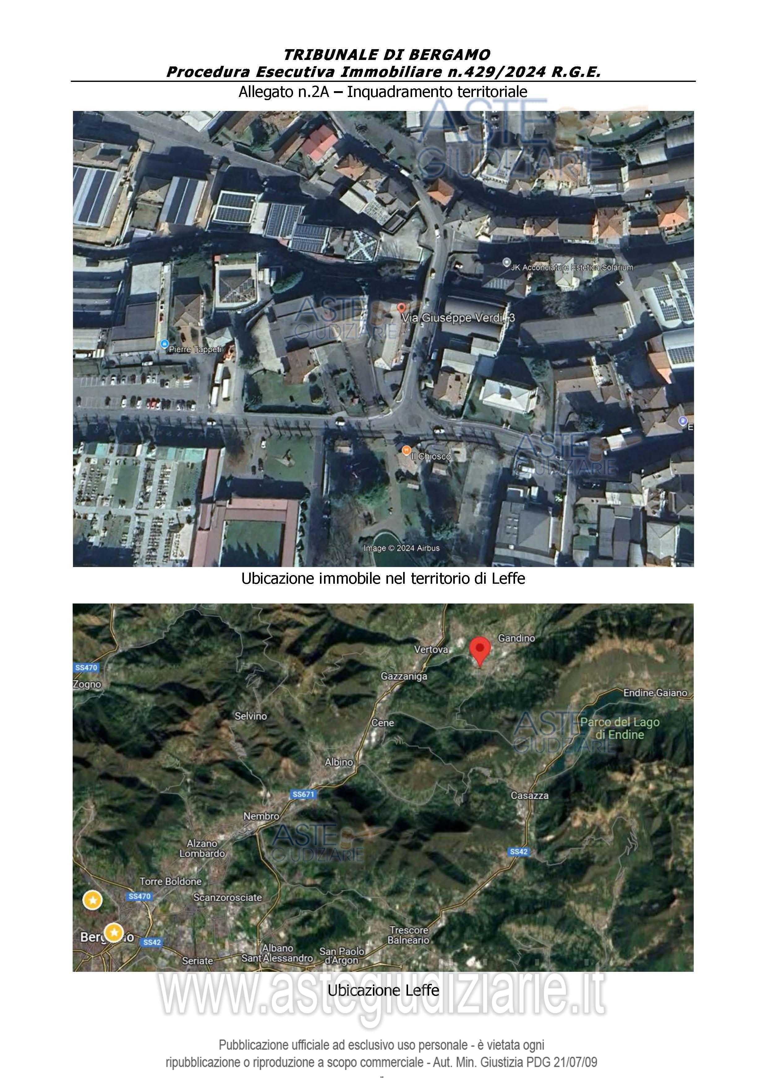 Vendita all'asta Senza incanto, con gara telematica asincrona - LOTTO UNICO: ABITAZIONE QUADRILOCALE DI TIPO ECONOMICO [A/3] CON RELATIVA AUTORIMESSA (C/6) Identificazione al Catasto Fabbricati (N.C.E.U.) comune di Leffe (BG), Via Verdi 3,-Piano T, al Foglio 1, Particella 175, Subalterno 8 Cat. A/3, Classe 2, consistenza 6 vani, Sup. complessiva 105, tot. escluse aree scoperte mq.100 Rendita catastale Euro 449,32.-Piano S1, foglio 1, particella 175, sub. 23, cat. C/6, classe U, consistenza mq.15, R.C. Euro 34,09.QUOTA E TIPOLOGIA DEL DIRITTO: Proprietà 1/1. Prezzo base € 47.812,50 (offerta minima € 35.859,37). Data inizio operazioni di vendita: 10/02/2026 ore 15:00. Giudice Dott. Luca Fuzio. Professionista delegato alla vendita Dott. Paolo Carminati - Email "p.carminati@studiofiorina.it"; Tel. 035580227. Custode Giudiziario Dott. Paolo Carminati - Email "p.carminati@studiofiorina.it"; Tel. 035580227. Rif. Tribunale di Bergamo - Espropriazione immobiliare (cartabia) n. 429/2024