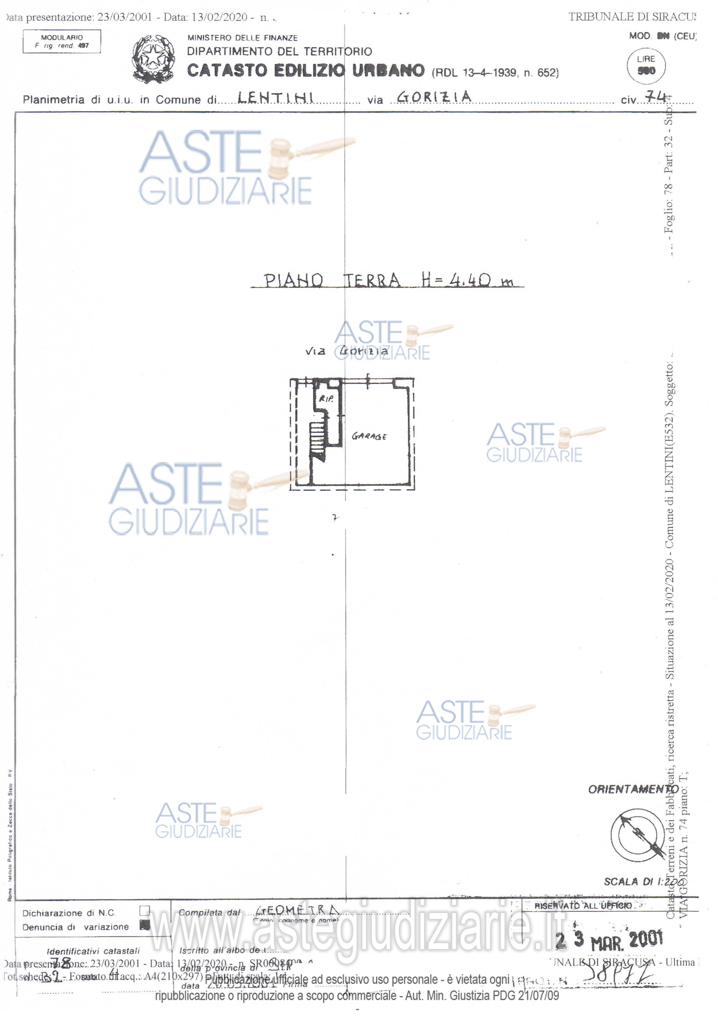 Vendita all'asta Senza incanto, con gara telematica sincrona mista - LOTTO UNICO: 1)Appartamento per civile abitazione in Lentini (SR), Via Gorizia, 72, composto da un locale cucina e lavanderia al piano primo, da due camere da letto e locale bagno al piano secondo e da una camera da letto, un locale ripostiglio e da un terrazzino al piano terzoN.C.E.U del Comune di Lentini foglio 78, particella 32, sub. 52)Locale garage in Lentini (SR), Via Gorizia, 74, posto al piano terra, esteso per ventisette mq. 27.N.C.E.U del Comune di Lentini foglio 78, particella 32, sub. 4. Prezzo base € 26.103,51 (offerta minima € 19.577,63). Data vendita 05/05/2026 ore 10:00. Giudice Maria Cristina Di Stazio. Professionista delegato alla vendita Avv. Nevio Bongiorno - Email "nevio.bongiorno@tiscali.it". Custode Giudiziario Avv. Nevio Bongiorno - Email "nevio.bongiorno@tiscali.it". Rif. Tribunale di Siracusa - Esecuzione immobiliare post legge 80 n. 511/2017