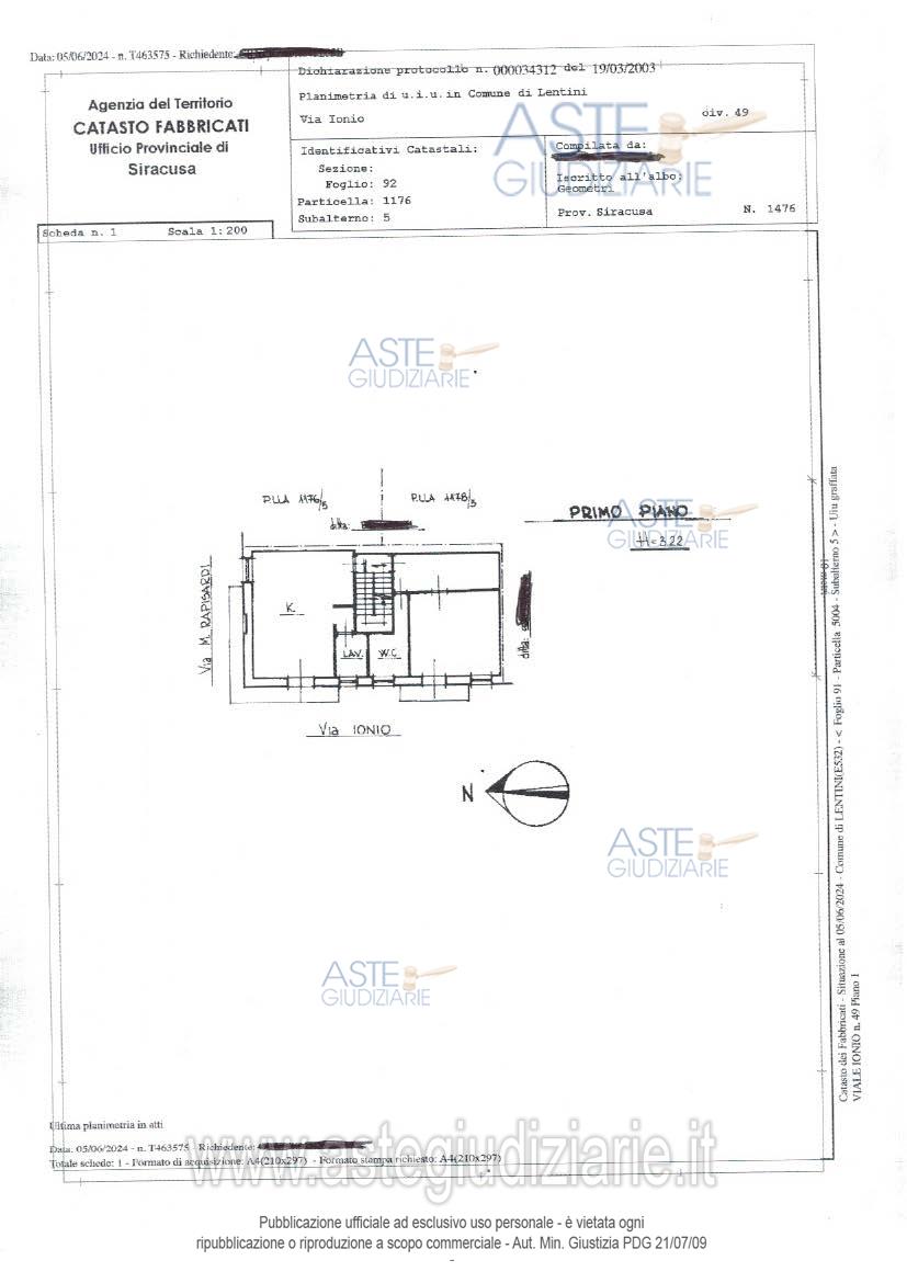 Vendita all'asta Senza incanto, con gara telematica sincrona mista - LOTTO UNICO: 1/1 proprietà dell' appartamento in Lentini via Ionio n. 49 angolo via Mario Rapisardi, 1 p. composto da tre camere ed accessori, censito nel NCEU al fg. 91, p.lla 8865, sub. 5 graffato con p.lla 5004 sub. 5 (in precedenza le p.lle 8865/5 -5004/5 graffate del fg. 91 sono state indicate con le p.lle 1176/5 e 5004/5) cat. A/4, classe 2, r.c. € 99,16 e garage sito in Lentini in viale Ionio n. 51, censito al NCEU del detto Comune al fg. 91p.lla 5004 sub. 8, p.t., cat. C/6, mq. 30, cl 3, r.c. € 58,88”. Prezzo base € 22.500,00 (offerta minima € 16.875,00). Data vendita 22/10/2025 ore 09:00. Professionista delegato alla vendita Avv. Monica Benedetto - Email "avvmonicabenedetto@hotmail.com"; Cell. 3391109753; Tel. 09311560608. Custode Giudiziario Avv. Monica Benedetto - Email "avvmonicabenedetto@hotmail.com"; Cell. 3391109753; Tel. 09311560608. Rif. Tribunale di Siracusa - Espropriazione immobiliare (cartabia) n. 109/2024