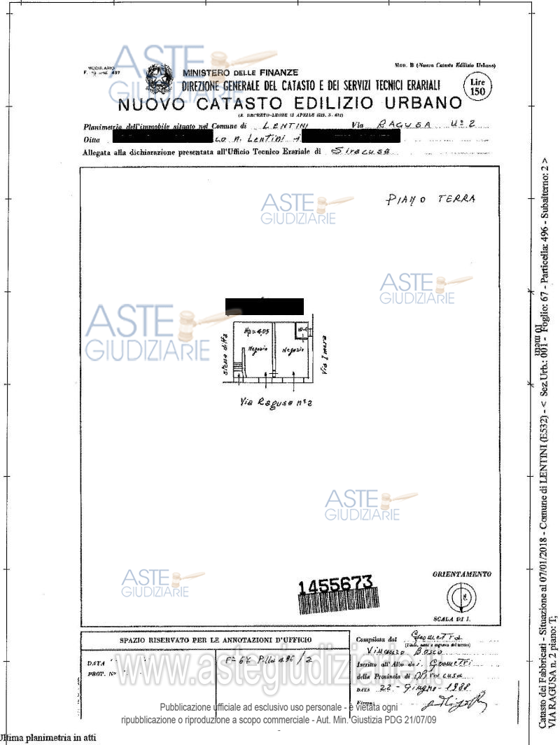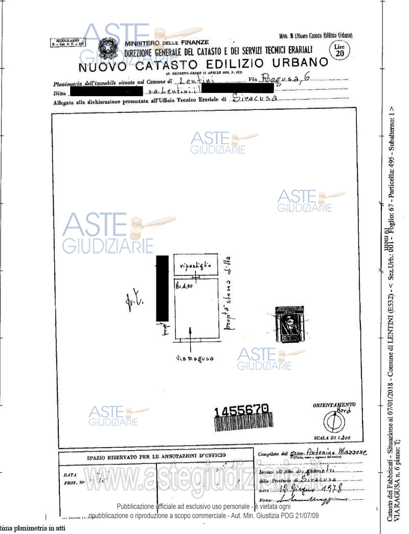 Vendita all'asta Senza incanto - LOTTO 1: Fabbricato in Lentini, via Ragusa 2, 4, 6, nel C.F. al fg. 67, p.lla 495/1 (garage) , cat c/6, mq. 78, p.lla 496/2 negozio, cat. C/1, mq. 56, p.t., p.lla 495/3 (graffata alla p.lla 496/6) appartamento cat. A/3, vani 10, p. 1 e p.lla 495/4, lastrico solare. Prezzo base € 42.002,92 (offerta minima € 31.419,69). Data vendita 24/10/2025 ore 11:00. Giudice Maria Cristina Di Stazio. Professionista delegato alla vendita Avv. Luca Bianchi - Email "lucbian1973@gmail.com"; Tel. 0931492345. Custode Giudiziario Avv. Luca Bianchi - Email "lucbian1973@gmail.com"; Tel. 0931492345. Rif. Tribunale di Siracusa - Esecuzione immobiliare post legge 80 n. 339/1992