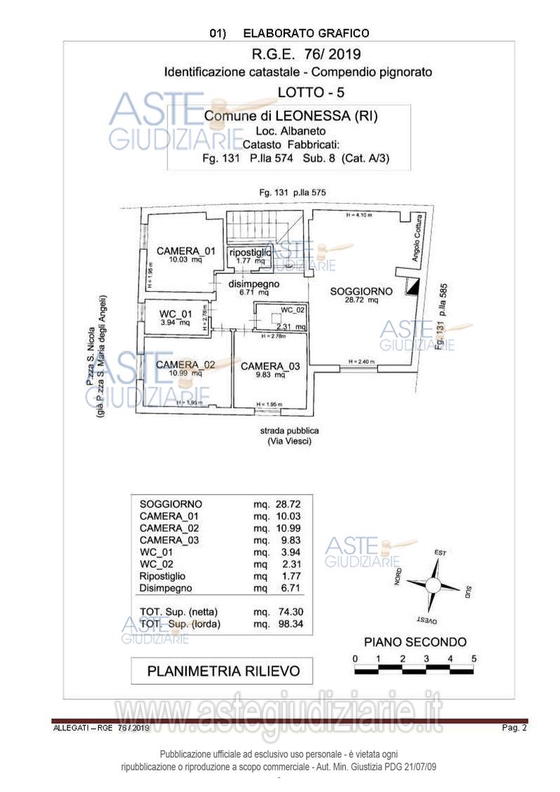 Vendita all'asta Senza incanto, con gara telematica asincrona - LOTTO 5: Appartamento al piano secondo composto da soggiorno con angolo cottura, camino e stufa a pellet, n. 2 bagni, disimpegno, n. 3 camere da letto e ripostiglio, per una superficie utile netta calpestabile complessiva di mq. 74.30, corrispondente ad una superficie equivalente di mq. 73.59 e lorda di mq 98.34. Prezzo base € 44.000,00 (offerta minima € 33.000,00). Data inizio operazioni di vendita: 27/04/2026 ore 10:00. Giudice Marilina Guglielmi. Professionista delegato alla vendita Avv. Francesca Blasi - Email "francesca@avvocatoblasi.it"; Tel. 0746204591. Custode Giudiziario Avv. Francesca Blasi - Email "francesca@avvocatoblasi.it"; Tel. 0746204591. Rif. Tribunale di Rieti - Esecuzione immobiliare post legge 80 n. 76/2019