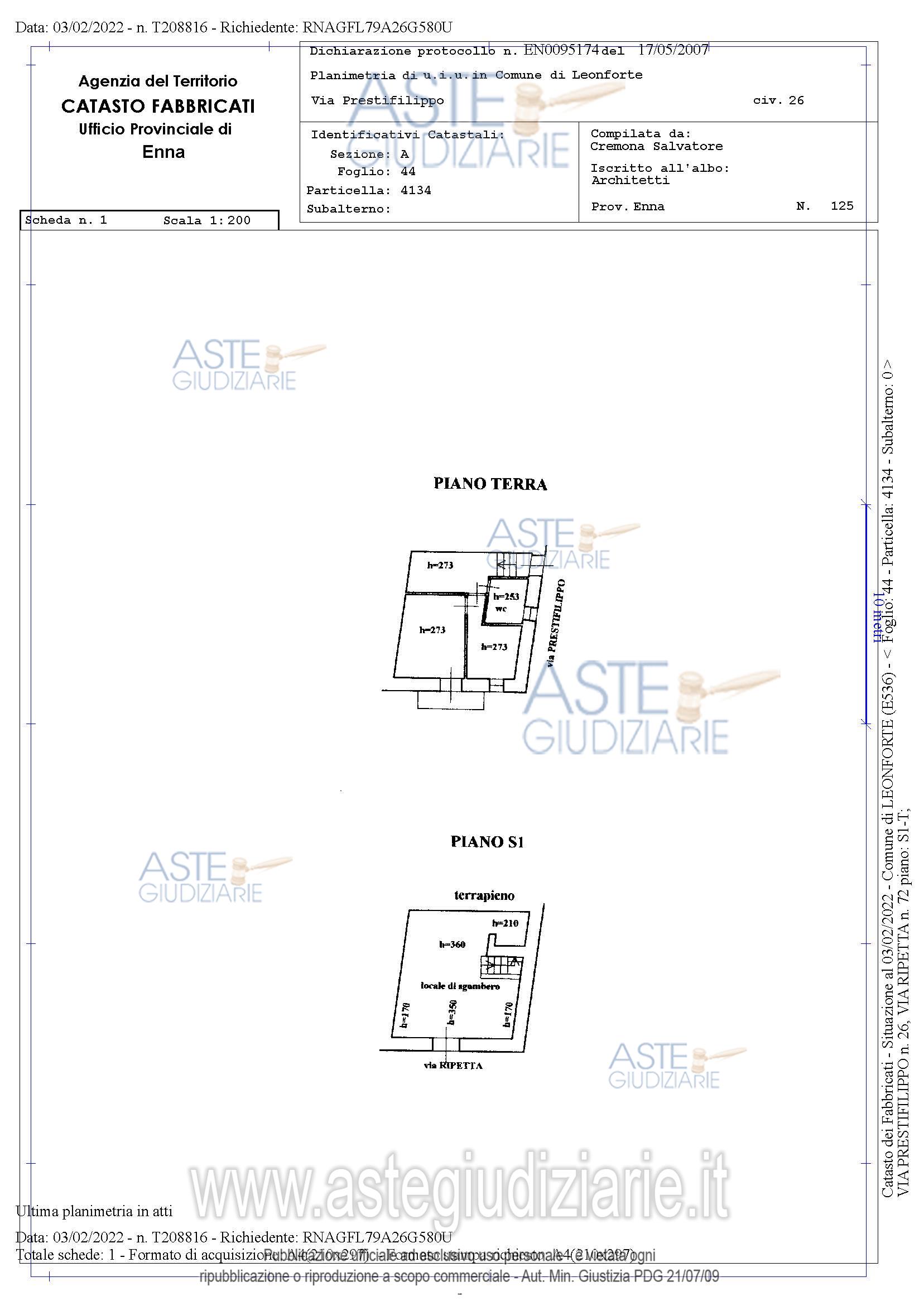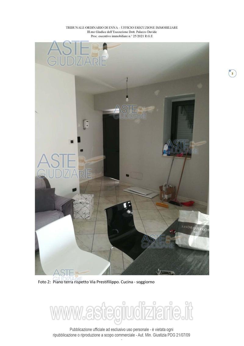 Vendita all'asta Senza incanto, con gara telematica sincrona mista - LOTTO UNICO: Immobile unifamiliare multipiano destinato ad uso abitativo sito nel Comune di Leonforte (En)alla Via Prestifilippo, 26 / Via Ripetta, 72, composto rispetto all’ingresso sito in ViaPrestifilippo - piano terra da: cucina/soggiorno, ripostiglio e servizio igienico; da due vani oltrelavanderia e un balcone al primo. Rispetto all’ingresso da Via Ripetta, è presente a piano terra,un unico vano con accesso carrabile.Distinto al C.U. di Leonfortel fg 44 part. 4134 - Cat. A/4, Cl. 2, cons. 2,5 vani. Prezzo base € 16.454,00 (offerta minima € 12.341,00). Data vendita 13/01/2026 ore 12:30. Professionista delegato alla vendita Avv. Gianpiero Cortese - Email "gianpierocortese@gmail.com"; Cell. 3355475980. Custode Giudiziario Avv. Gianpiero Cortese - Email "gianpierocortese@gmail.com"; Cell. 3355475980. Rif. Tribunale di Enna - Esecuzione immobiliare post legge 80 n. 25/2021
