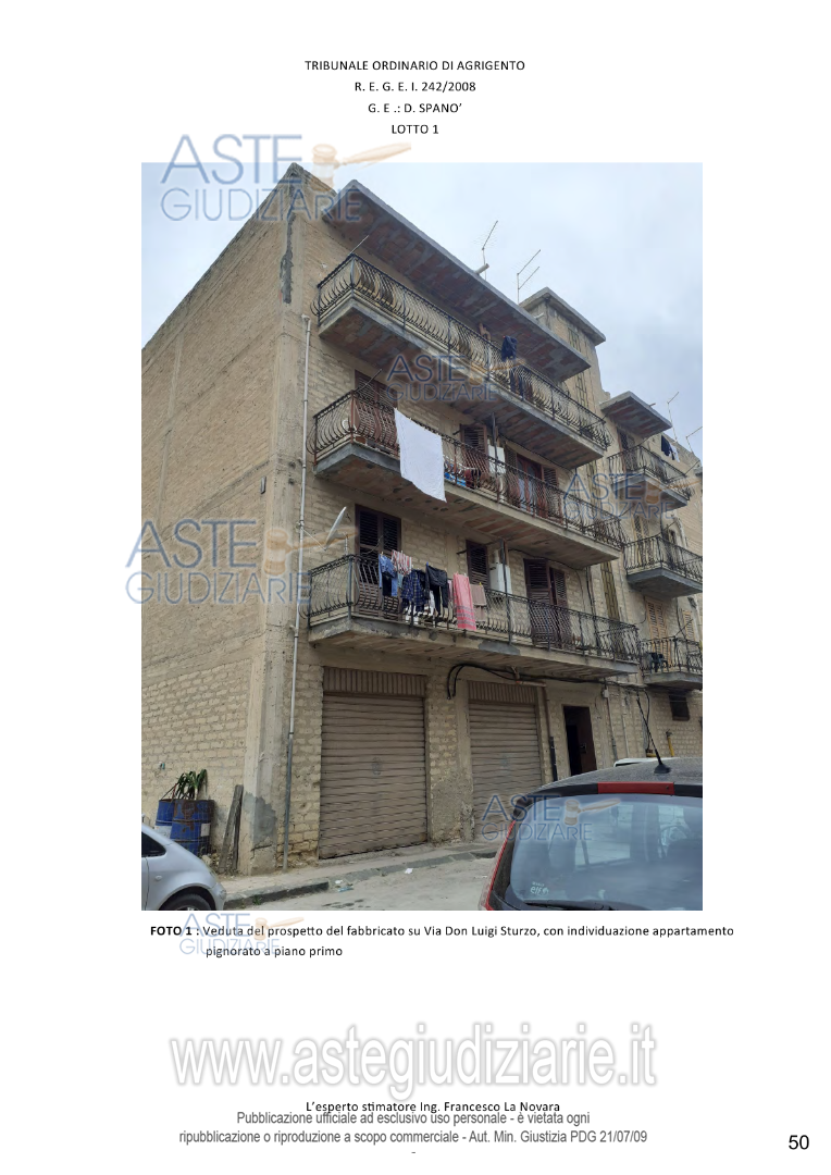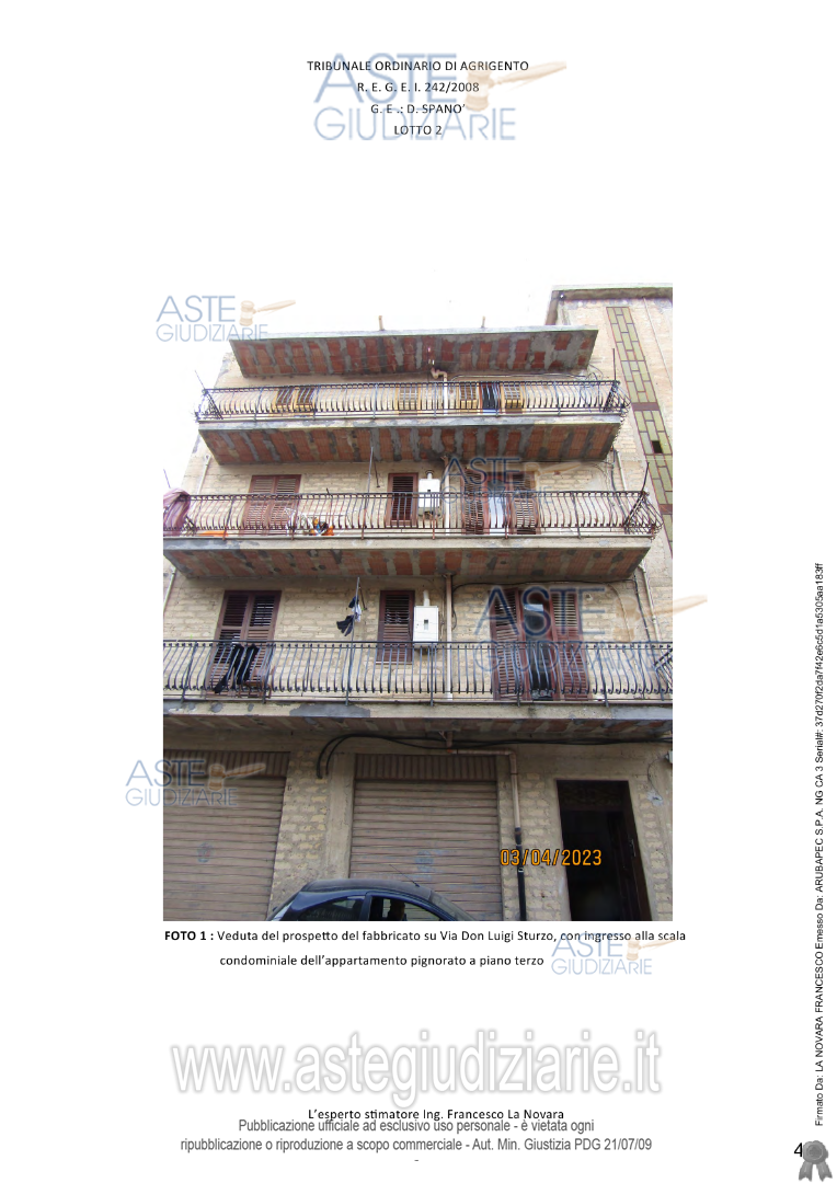 Vendita all'asta Senza incanto, con gara telematica sincrona mista - LOTTO 1: Piena proprietà per la quota di 1000/1000 di Appartamento sito nel comune di LICATA (AG), via Sturzo n.2, al primo piano, censito nel N.C.E.U. al: foglio 108, particella 717 sub. 6, categoria A/2, classe 3, vani 6, rendita catastale € 464,81. Prezzo base € 19.365,75 (offerta minima € 14.524,31). Data vendita 14/11/2025 ore 11:00. Giudice Domenica Spano'. Professionista delegato alla vendita Avv. Chetty Nero - Email "chetty.nero@virgilio.it"; Cell. 3297186239. Custode Giudiziario Avv. Chetty Nero - Email "chetty.nero@virgilio.it"; Cell. 3297186239. Rif. Tribunale di Agrigento - Esecuzione immobiliare post legge 80 n. 242/2008