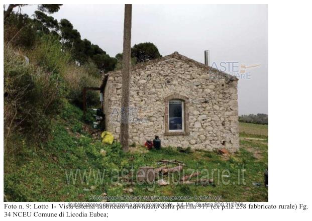 Vendita all'asta Senza incanto - LOTTO 1: Fondo agricolo con fabbricato, sito in Licodia Eubea in c/da Poggio Giardino Barone in prossimità del centro urbano, individuato il terreno al NCT Fg 34 part. 917 (ex 130) , con superficie di Ha 0,5343 e fabbricato adibito ad uso residenziale in buono stato di manutenzione individuato al NCEU Fg 34 part 919 (ex 258), categoria A/2, due vani oltre ingresso e locale servizio w.c., sup. utile di circa 42 mq. Situazione urbanistiche da regolarizzare. Prezzo base € 29.400,00 (offerta minima € 22.050,00). Data vendita 19/12/2025 ore 17:00. Giudice Dott. Agata Maria Patrizia Cavallaro. Professionista delegato alla vendita Avv. Graziella Randazzo - Email "graziellarandazzo@libero.it"; Cell. 3386143968; Tel. 0933339751. Custode Giudiziario Avv. Graziella Randazzo - Email "graziellarandazzo@libero.it"; Cell. 3386143968; Tel. 0933339751. Rif. Tribunale di Caltagirone - Esecuzione immobiliare post legge 80 n. 65/2006