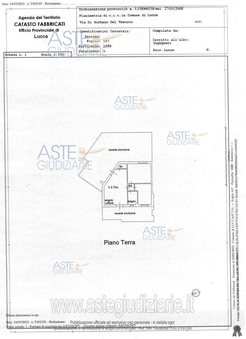 Vendita in attesa dell'emissione del nuovo bando d'asta. LOTTO UNICO: Unità immobiliare per civile abitazione facente parte di più ampio fabbricato sito in Lucca, Via di Sorbano Del Vescovo n. 860D Piano T. Si compone di ingresso-soggiorno con angolo cottura, ripostiglio, disimpegno, servizio igienico, due camere da letto e resedi esclusive ad uso giardino. Sono compresi diritti di comproprietà sulle parti comuni del fabbricato. Ultimo prezzo base € 117.000,00 (offerta minima € 87.750,00). Giudice Dott. Giacomo Lucente. Professionista delegato alla vendita Avv. Nicola Virdis. Custode Giudiziario Ivg Lucca - Email "custodieivg@gmail.com". Rif. Tribunale di Lucca - Espropriazione immobiliare (cartabia) n. 198/2024