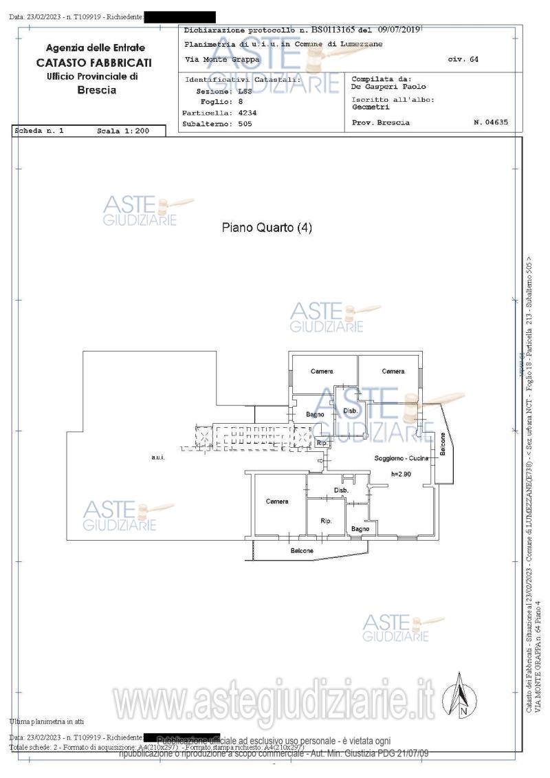 Vendita all'asta Senza incanto, con gara telematica asincrona - LOTTO UNICO: Intera piena proprietà di appartamento con due cantine in contesto condominiale al piano quarto, composto da: ingresso, soggiorno cucina, tre camere da letto, due ripostigli, due disbrighi, due bagni, due balconi, con accesso uno dal soggiorno e l'altro da una camera; dal bagno si accede anche ad un piccolo vano dove è posta la caldaia. Occupato. Prezzo base € 110.743,00 (offerta minima € 83.057,00). Data inizio operazioni di vendita: 24/03/2026 ore 12:00. Professionista delegato alla vendita Avv. Massimo Leocata - Email "avv.leocata@studioleocata.it"; Tel. 030221258. Custode Giudiziario Avv. Massimo Leocata - Email "avv.leocata@studioleocata.it"; Tel. 030221258. Rif. Tribunale di Brescia - Esecuzione immobiliare post legge 80 n. 372/2021