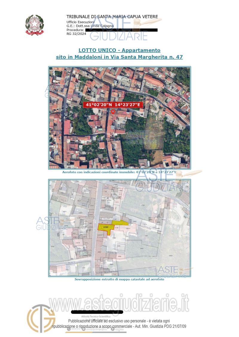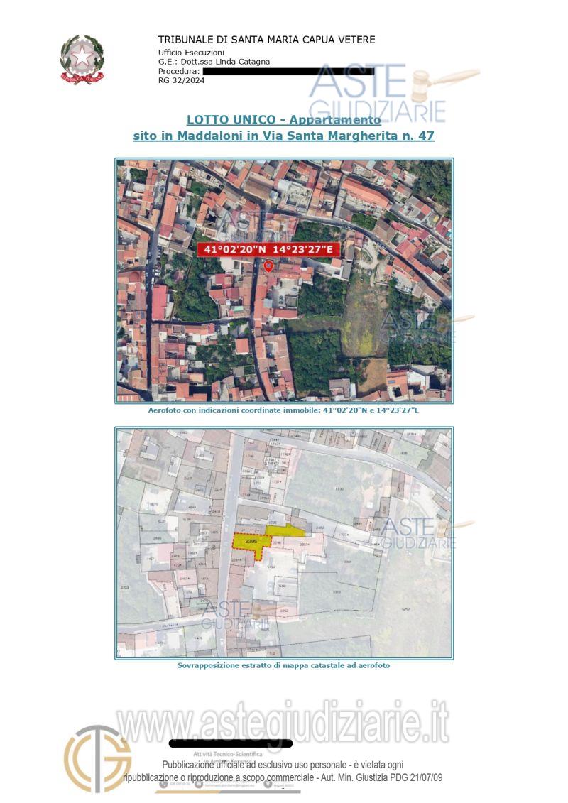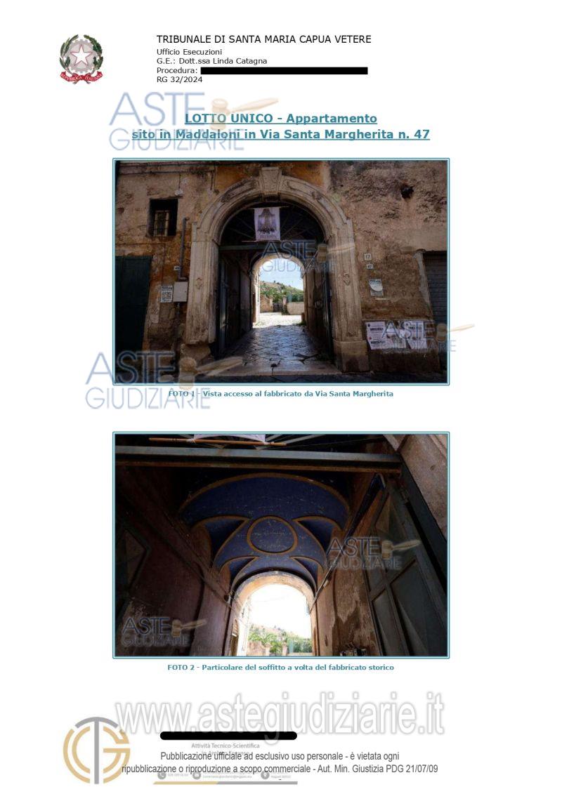 Vendita all'asta Senza incanto, con gara telematica asincrona - LOTTO UNICO: APPARTAMENTO Maddaloni (CE), Via Santa Margherita 47, piano primo. Dalla porta di ingresso si accede alla sala da pranzo dotata di balcone; dotato di un secondo accesso che allo stato attuale risulta tamponato internamente. Sulla destra della sala da pranzo troviamo la cucina con bagno e sulla sinistra si accede al soggiorno ed alle 2 camere da letto. A mezzo di scala a chiocciola posta nel soggiorno si accede al sottotetto composto da 2 ambienti ed un bagno. Prezzo base € 37.968,75 (offerta minima € 28.476,56). Data inizio operazioni di vendita: 27/05/2026 ore 12:00. Giudice Linda Catagna. Professionista delegato alla vendita Avv. Ilaria Malagrida - Email "studiolegale@malagridaleopoldo.it"; Tel. 0813723459. Custode Giudiziario Avv. Ilaria Malagrida - Email "studiolegale@malagridaleopoldo.it"; Tel. 0813723459. Rif. Tribunale di Santa Maria Capua Vetere - Esecuzione immobiliare post legge 80 n. 32/2024
