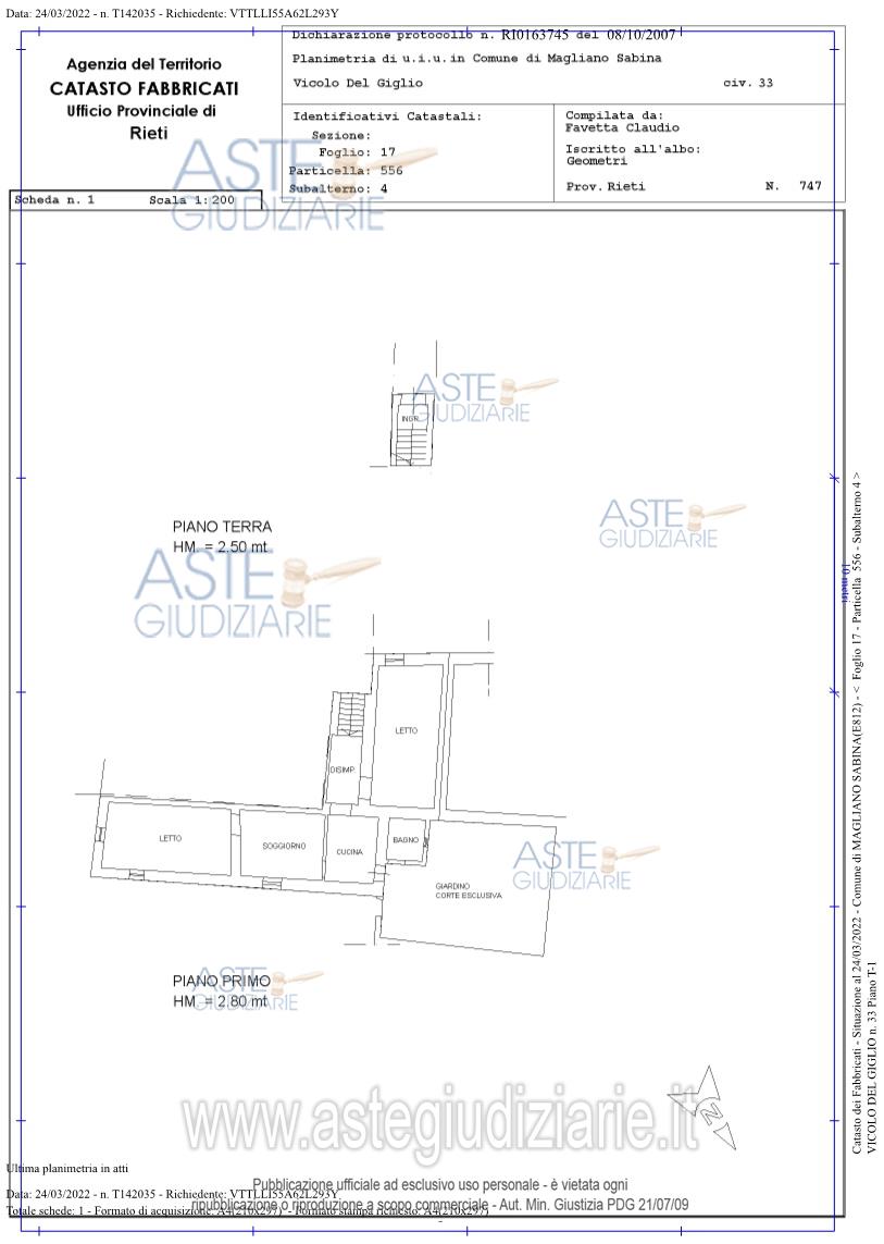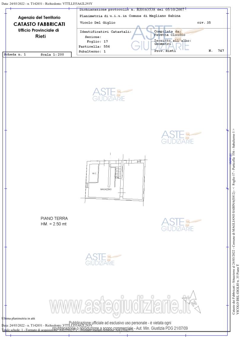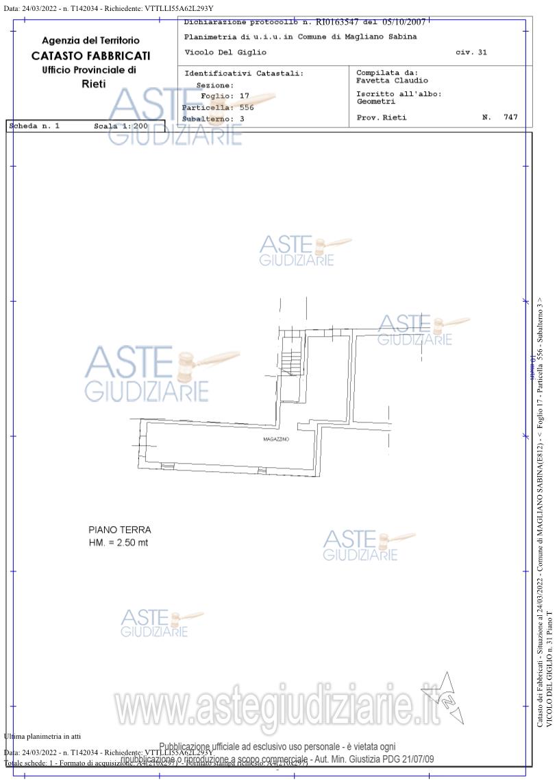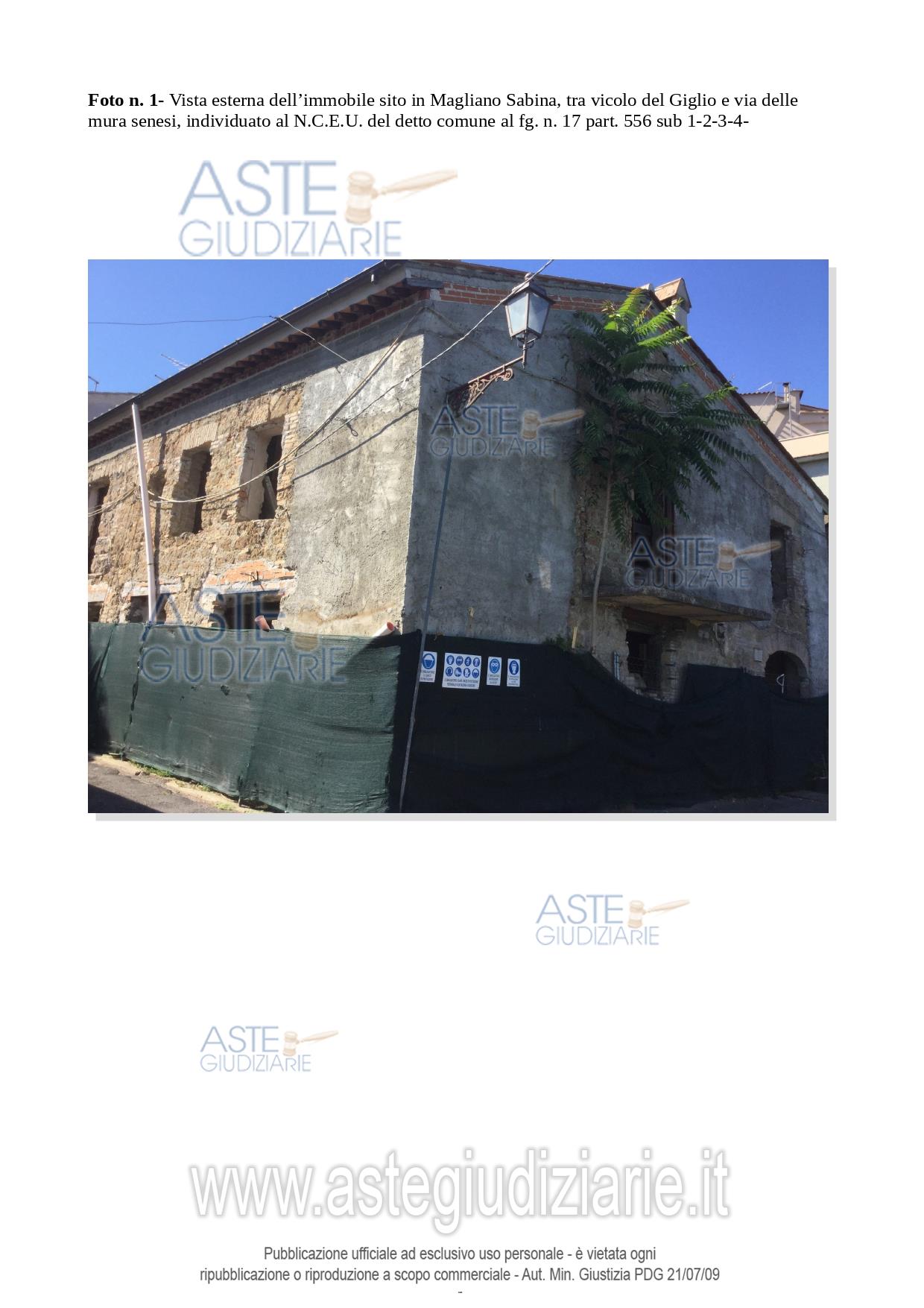 Vendita all'asta Senza incanto, con gara telematica asincrona - LOTTO UNICO: Piena proprietà dell'immobile cielo terra sito nel centro di Magliano Sabina (RI) alla via del Giglio angolo Via delle Mura, distribuito su due livelli della superficie di 200 mq , in corso di ristrutturazione attualmente appare a rustico, privo di infissi, impianti, rifiniture esterne ed interne, di pavimenti e rivestimenti . Piccola corte annessa. Prezzo base € 45.562,50 (offerta minima € 34.171,87). Data inizio operazioni di vendita: 02/02/2026 ore 10:00. Professionista delegato alla vendita Avv. Anna Lisa Ciancarelli - Email "avv.ciancarelli@tiscali.it"; Cell. 3403504110; Tel. 3403504110. Custode Giudiziario Avv. Anna Lisa Ciancarelli - Email "avv.ciancarelli@tiscali.it"; Cell. 3403504110; Tel. 3403504110. Rif. Tribunale di Rieti - Esecuzione immobiliare post legge 80 n. 127/2020