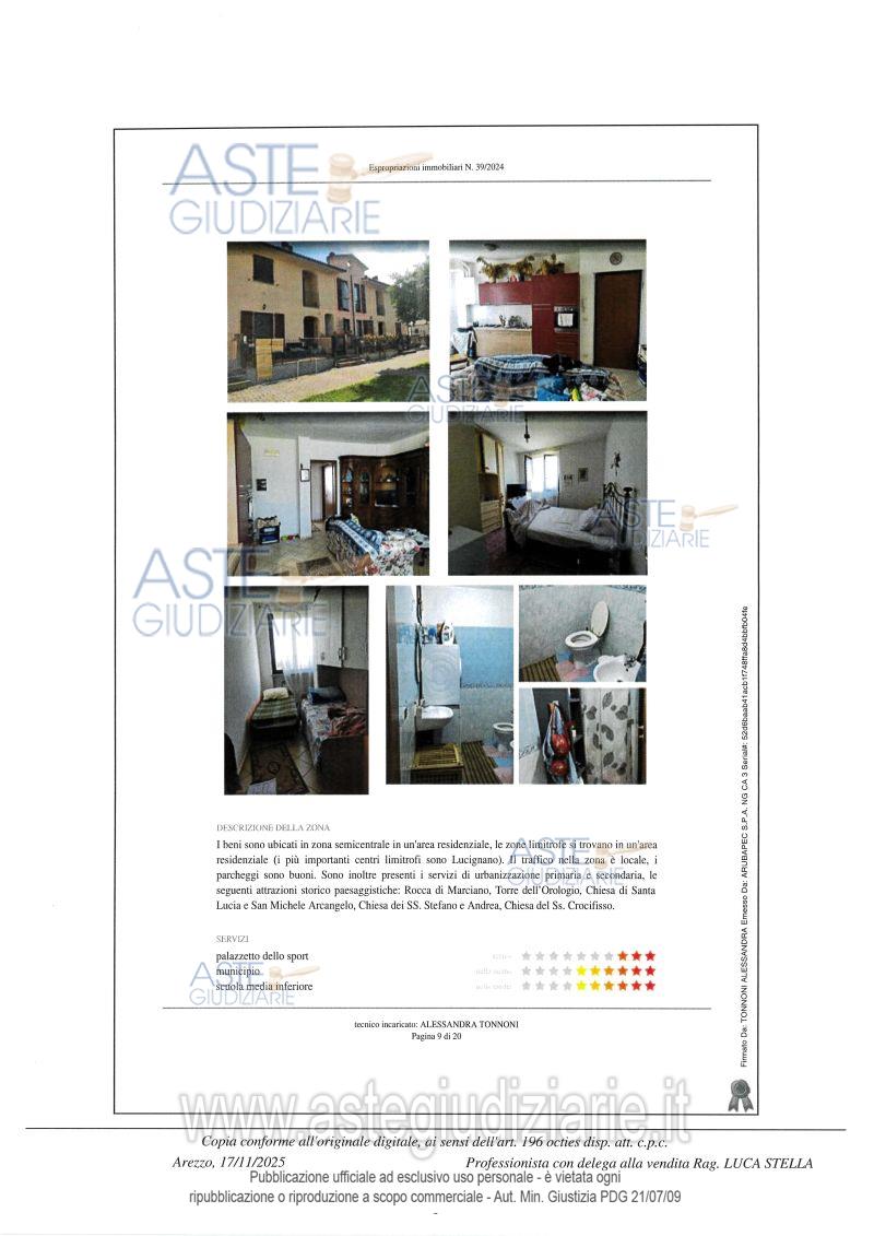 Vendita all'asta Senza incanto, con gara telematica sincrona mista - LOTTO UNICO: DIRITTO DI PIENA PROPRIETA' PER L'INTERO SU APPARTAMENTO DI CIVILE ABITAZIONE CORREDATO DI BOX AUTO E QUOTE PROPORZIONALI SU PARTI COMUNI CONDOMINIALI, SITI IN MARCIANO DELLA CHIANA (AR) VIA CARRAIA N. 21 Q. Prezzo base € 76.000,00 (offerta minima € 57.000,00). Data vendita 19/03/2026 ore 09:00. Giudice Elisabetta Rodino' Di Miglione. Professionista delegato alla vendita Luca Stella - Email "lucastella@studiostellagigli.it"; Cell. 3476619800; Tel. 0575984808. Custode Giudiziario Avv. Istituto Vendite Giudiziarie Arezzo-Siena - Email "VISITE.IVG@GMAIL.COM"; Cell. 3397337017; Tel. 0577318111. Rif. Tribunale di Arezzo - Espropriazione immobiliare (cartabia) n. 39/2024