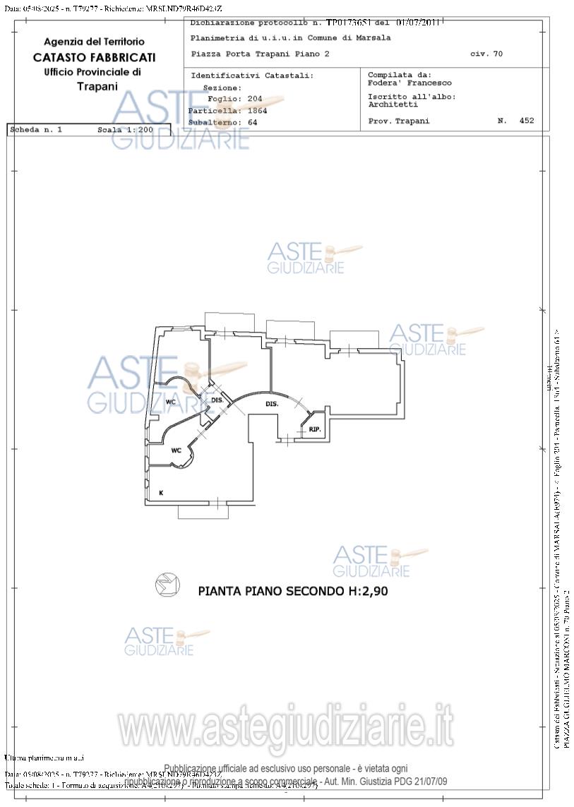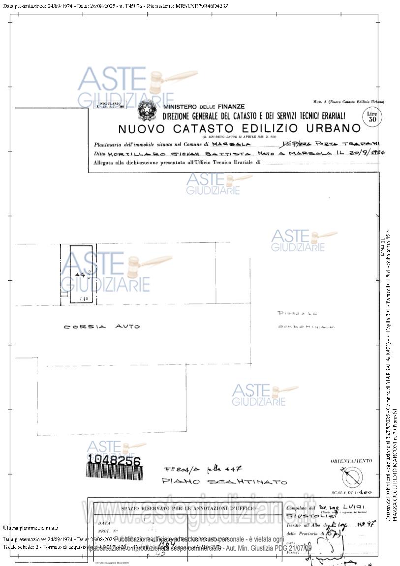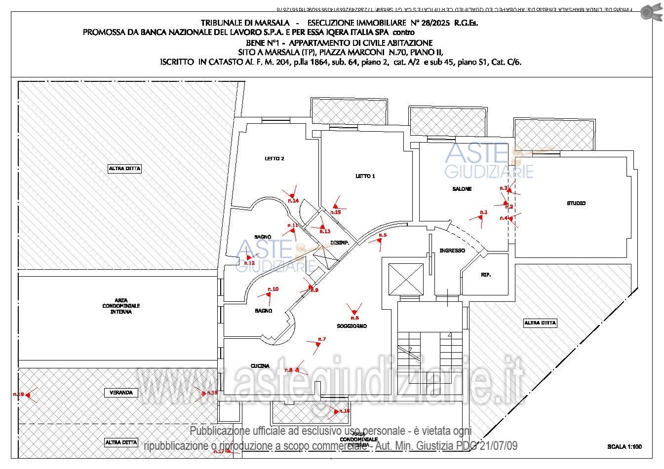 Vendita all'asta Senza incanto, con gara telematica asincrona - LOTTO UNICO: Piena proprietà di appartamento posto al piano secondo di un condominio sito in Marsala nella Piazza Marconi n.70, scala A, censito al catasto fabbricati del Comune di Marsala al fg. 204, part. 1864, sub. 64 (già sub. 62 e 63), cat. A/2.E' di pertinenza esclusiva dell'abitazione un posto auto, sito nel piano scantinato, contraddistinto con il n.14, avente accesso dalla Piazza Marconi n.36, censito al catasto fabbricati del Comune di Marsala al fg. 204, part. 1864, sub. 45, piano S1, Cat. C/6. Prezzo base € 135.000,00 (offerta minima € 101.250,00). Data inizio operazioni di vendita: 04/06/2026 ore 11:00. Professionista delegato alla vendita Avv. Giuseppe Ernesto Gandolfo - Email "avvgernestogandolfo@gmail.com"; Tel. 0923951497. Custode Giudiziario Avv. Giuseppe Ernesto Gandolfo - Email "avvgernestogandolfo@gmail.com"; Tel. 0923951497. Rif. Tribunale di Marsala - Espropriazione immobiliare (cartabia) n. 28/2025