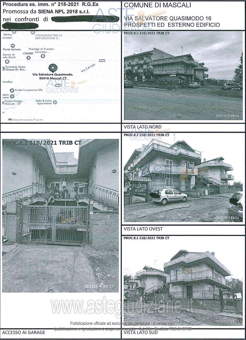 Vendita all'asta Senza incanto, con gara telematica sincrona mista - LOTTO 9: Lotto 9: piena proprietà dell’appartamento in Mascali, via S. Quasimodo n. 16, ubicato al piano primo di un piccolo edificio a più livelli. Prezzo base € 44.635,00 (offerta minima € 33.476,00). Data vendita 17/03/2026 ore 11:00. Professionista delegato alla vendita Avv. Giovanni Fichera - Email "studiofichera@virgilio.it"; Tel. 095388875. Custode Giudiziario Avv. Giovanni Fichera - Email "studiofichera@virgilio.it"; Tel. 095388875. Rif. Tribunale di Catania - Esecuzione immobiliare post legge 80 n. 218/2021