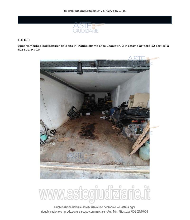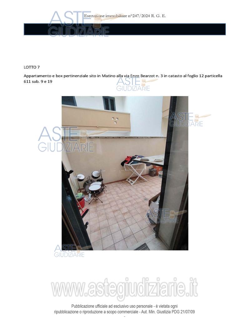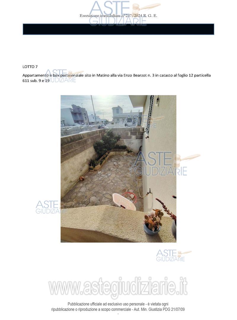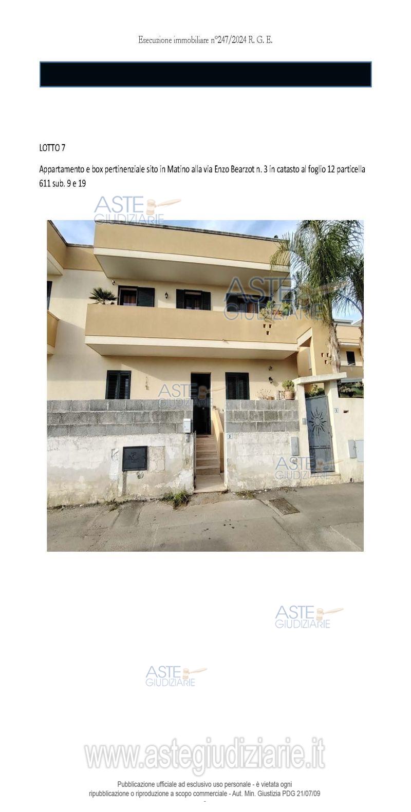Vendita all'asta Senza incanto, con gara telematica asincrona - LOTTO 7: Appartamento a MATINO sito alla via Enzo Bearzot n. 3, per la quota di 1/1 di piena proprietà. Box singolo, accessibile da rampa comune con sbocco su via Ciro Pezzella. Prezzo base € 57.000,00 (offerta minima € 42.750,00). Data inizio operazioni di vendita: 20/01/2026 ore 12:00. Giudice Dott. Anna Francesca Capone. Professionista delegato alla vendita Avv. Gabriele Toma - Tel. 3493932555 - 3928274. Custode Giudiziario Avv. Gabriele Toma - Email "avvocato.gabrieletoma@gmail.com"; Tel. 3493932555 - 3928274. Rif. Tribunale di Lecce - Espropriazione immobiliare (cartabia) n. 247/2024