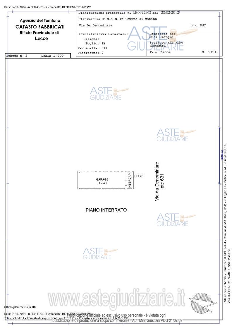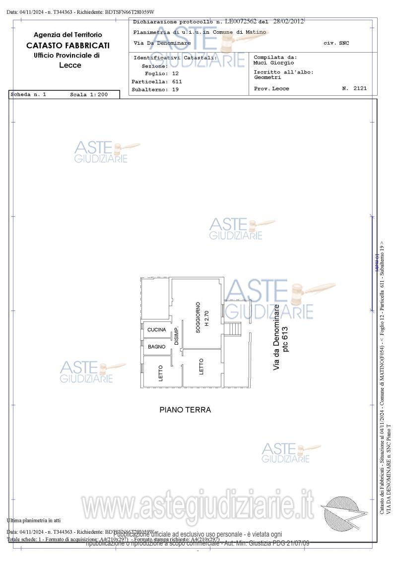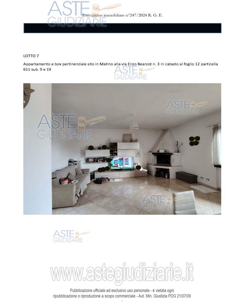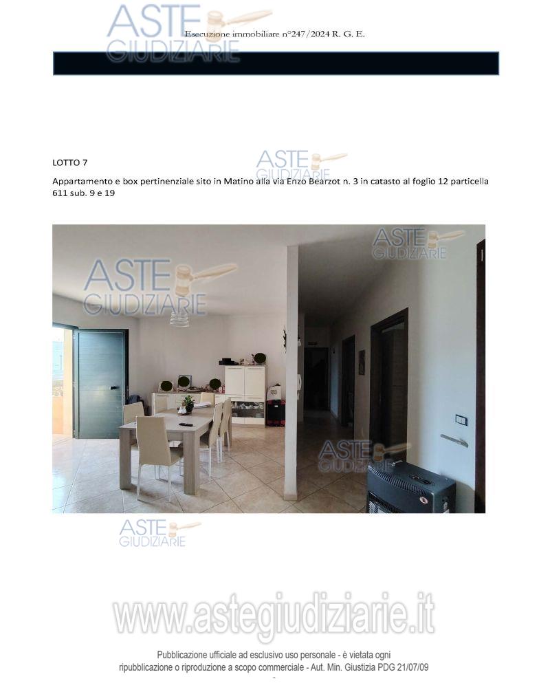 Vendita all'asta Senza incanto, con gara telematica asincrona - LOTTO 7: Appartamento a MATINO sito alla via Enzo Bearzot n. 3, per la quota di 1/1 di piena proprietà. Box singolo, accessibile da rampa comune con sbocco su via Ciro Pezzella. Prezzo base € 57.000,00 (offerta minima € 42.750,00). Data inizio operazioni di vendita: 20/01/2026 ore 12:00. Giudice Dott. Anna Francesca Capone. Professionista delegato alla vendita Avv. Gabriele Toma - Tel. 3493932555 - 3928274. Custode Giudiziario Avv. Gabriele Toma - Email "avvocato.gabrieletoma@gmail.com"; Tel. 3493932555 - 3928274. Rif. Tribunale di Lecce - Espropriazione immobiliare (cartabia) n. 247/2024